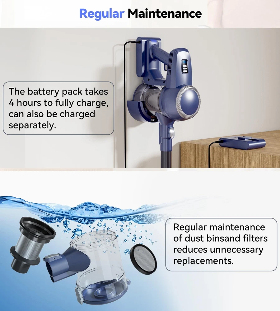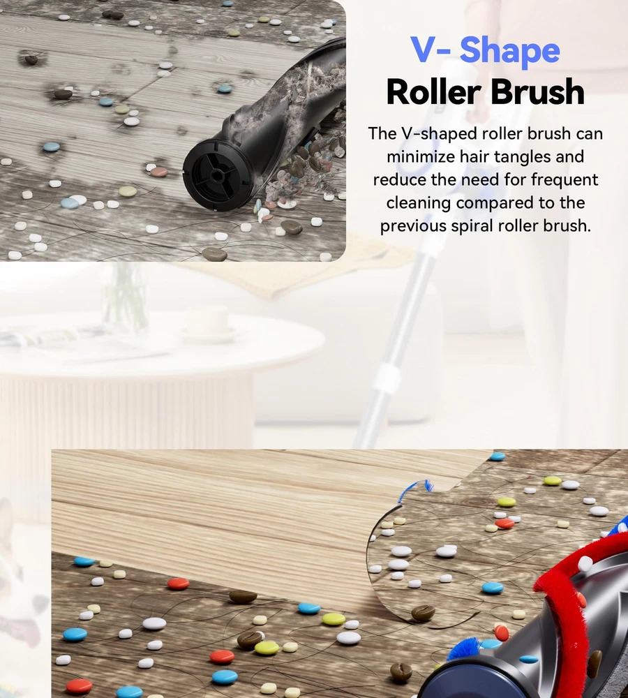 ๐ฟใ๐๐๐ญ๐ญ๐๐ซ๐ฒ ๐๐ง๐๐ฎ๐ซ๐๐ง๐๐ ๐๐ญ๐ซ๐๐ญ๐๐ ๐ฒใThe VC2207 Cordless Stick Vacuum features a removable 6*2200mAh lithium-ion battery pack. With a mere 4 hours of charging, it delivers 20 minutes of runtime in MAX mode and 45 minutes in Eco mode, ensuring ample battery endurance to fulfill your daily cleaning needs. ๐ฟใ๐ ๐๐ฉ๐ญ๐ข๐จ๐ง๐๐ฅ ๐๐ฎ๐๐ญ๐ข๐จ๐ง ๐๐จ๐๐๐ฌใThe VC2207 cordless vacuum cleaner features an advanced 180W motor for enhanced performance. Delivering a powerful 26kPa suction in MAX mode, it efficiently captures various debris, including pet hair, dust, grains, and cat litter. Ideal for hardwood floors, low pile carpets, tile floors, marble floors, and stairs. ๐ฟใ๐๐ง๐ญ๐ข-๐๐๐ง๐ ๐ฅ๐ ๐๐ซ๐ฎ๐ฌ๐ก & ๐ ๐๐๐ ๐๐ข๐ ๐ก๐ญ๐ฌใThe VC2207 Home Vacuum Cleaners showcase an innovative V-shaped roller brush, blending hard and soft bristles to minimize hair tangling and effortlessly clean hardwood floors and low-pile carpets. Moreover, its 180ยฐ rotating brush head, equipped with four powerful LED lights, illuminates dust beneath furniture and in corners, ensuring a thorough cleaning, leaving your home immaculate. ๐ฟใ๐๐๐๐ ๐ ๐ข๐ฅ๐ญ๐ซ๐๐ญ๐ข๐จ๐ง ๐๐ฒ๐ฌ๐ญ๐๐ฆใThe VC2207 Vacuum cleaner boasts a fully sealed 5-stage high-efficiency filtration system, capturing 99.99% of dust particles as small as 0.1 micron, ensuring fresher air for you and your family. Its removable and washable HEPA filter adds convenience to maintenance. ๐ฟใ โ๐๐๐ฌ๐ฒ ๐๐ฎ๐ฆ๐ฉ๐ข๐ง๐ " ๐๐ฎ๐ฌ๐ญ ๐๐ฎ๐ฉใThe VC2207 Vacuum cleaners boast a spacious 1.5L dust cup, while their cyclonic airflow design facilitates efficient rotation of particles and hair with the airflow, minimizing suction loss. Featuring a convenient "one-touch dust dumping" design, emptying is hassle-free. Note: Regular filter cleaning prevents suction weakening and clogging.