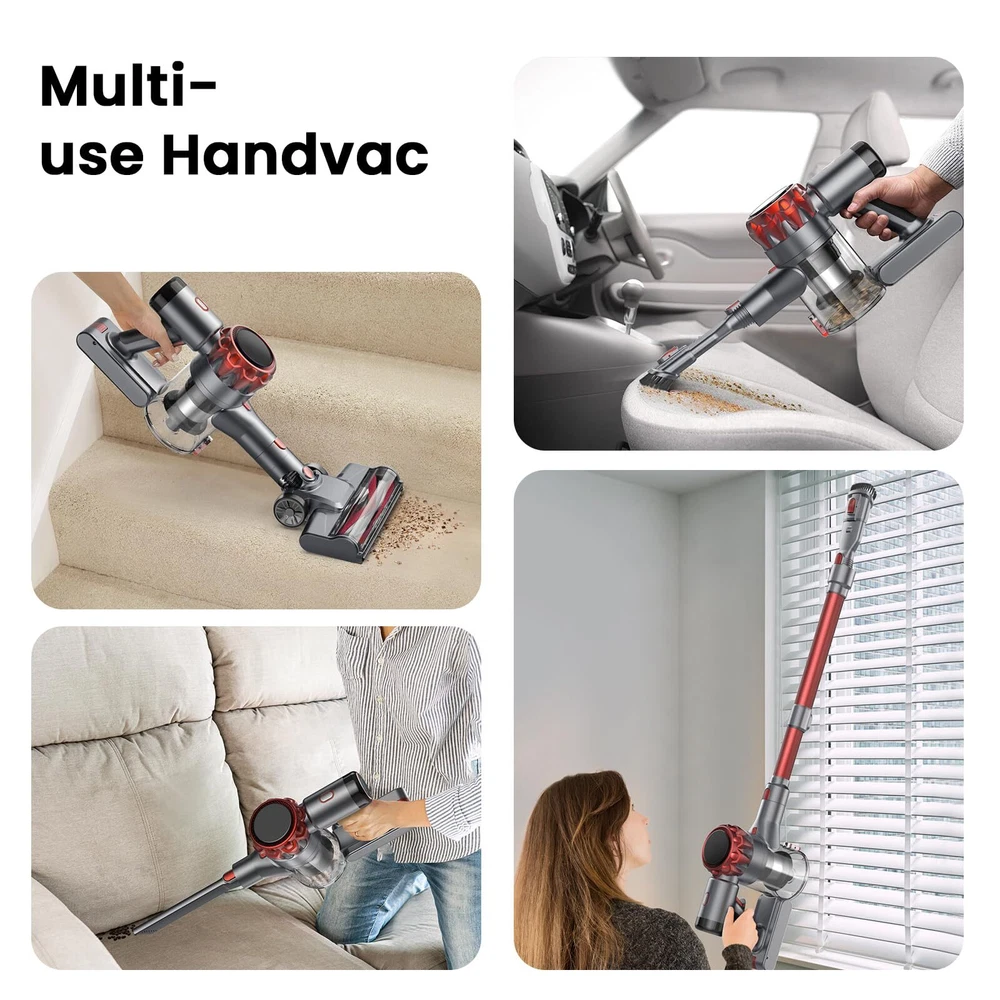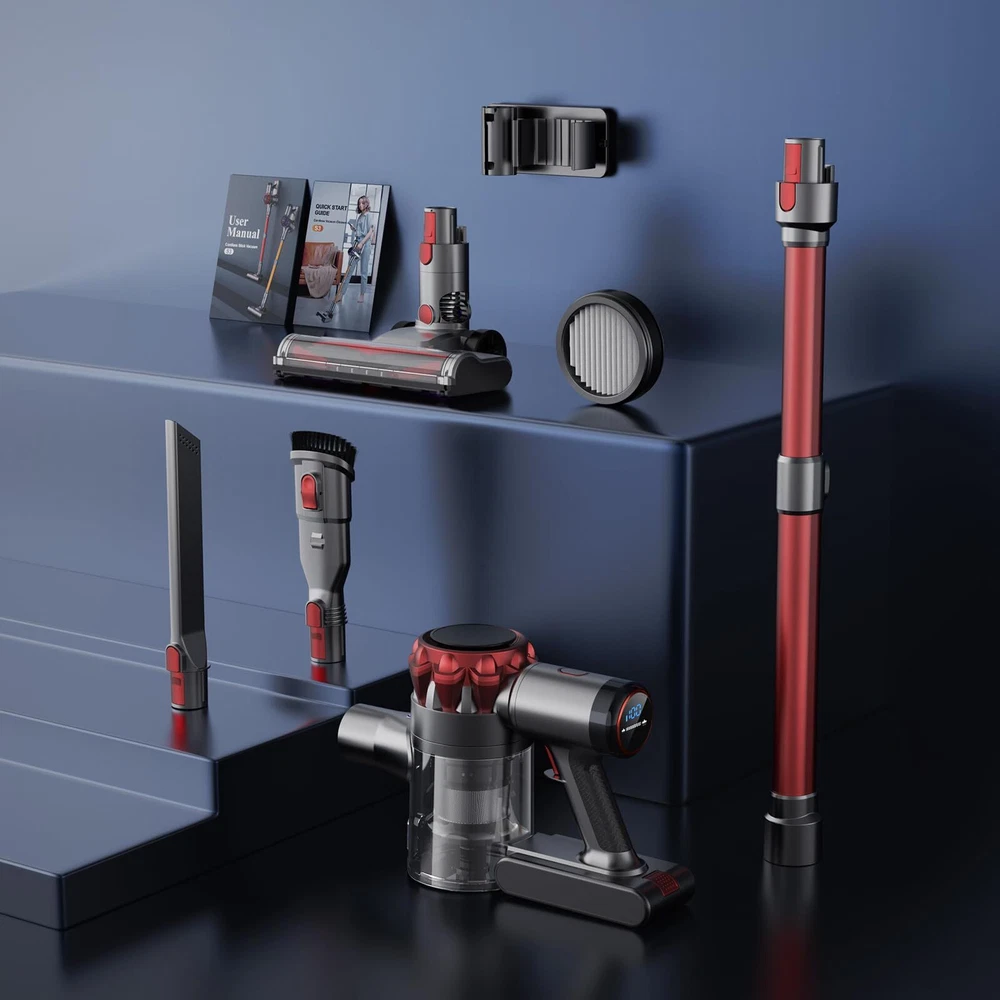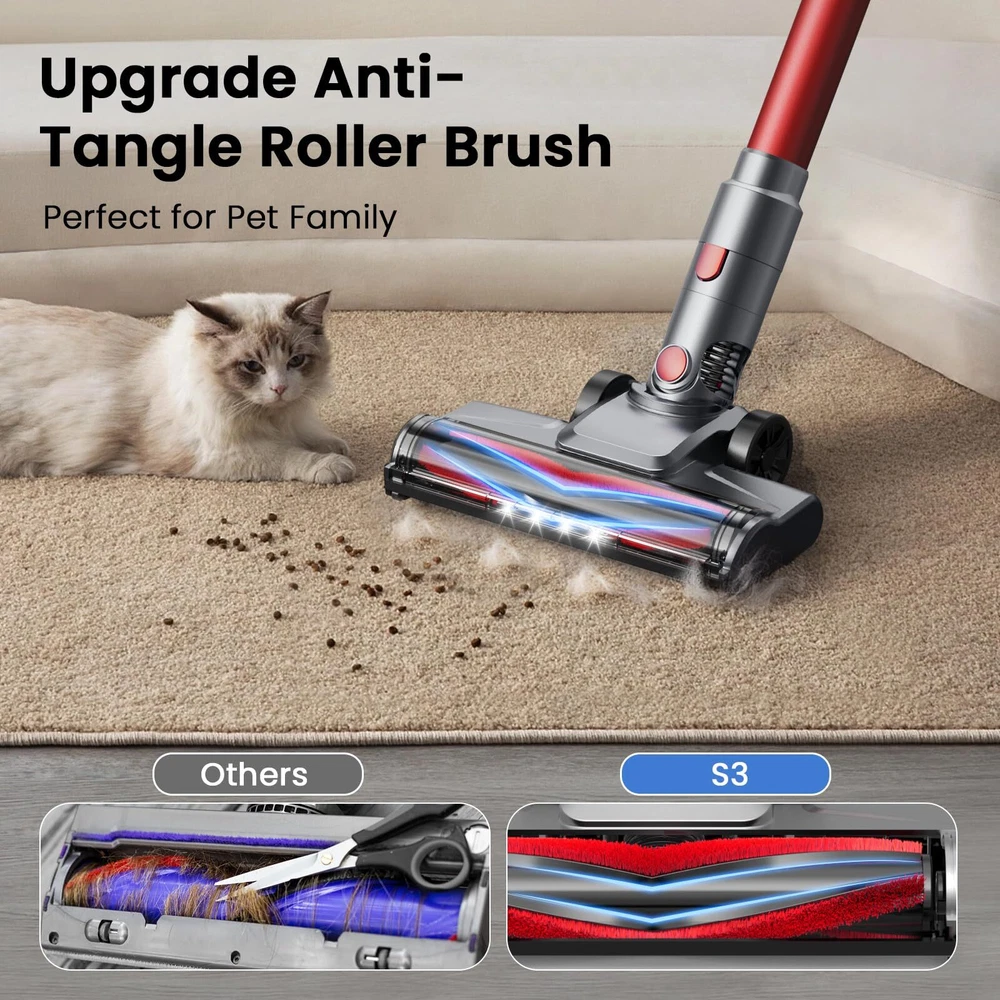 【Powerful Suction for Any Messes】cordless vacuum cleaner S3 equipped with 300W upgraded brushless motor, generating 35Kpa strong suction. It can effectively deep clean dirt, debris, dust, pet hair, cat litter and other messes from hard floor and low pile carpet. Brushless cordless vacuum are long-life and more energy efficient, compared with regular brushed stick vacuum. 【All-in-One LED Display】The intelligent LED display of this cordless stick vacuum provides clear visibility of the battery status and suction mode, helps you monitor the status of the stick vacuum cleaner cordless better, check the battery power in real time, empowering you to stay in control at all times. 【Up to 55 Mins Long Battery Life】With 6 *2600mAh large-capacity rechargeable batteries, this stick vacuum cordless rechargeable provides up to 55 minutes of uninterrupted cleaning (55 mins in Eco Mode, 25 mins in Strong Mode), allowing you to enjoy a hassle-free cleaning experience. The detachable battery of the rechargeable vacuum cordless can be charged separately or on its main body. 【Upgrade Tangle Free LED Flexible Brush Head】The vacuum cleaner pet hair with V-shaped anti-tangle roller can lift embedded dirt and pet hair from carpets and floors, effectively reduce hair entanglement, perfect for pet family. This brush head of vacuum cleaner carpet and floor can be rotated by 90°/165°, no dead corner under furniture and beds. The 4 bright LED lights help you never missing any hidden dust! 【6-Stage High-efficiency Filtration】This cordless stick vacuum cleaner features a lastest 6-stage fully-sealed filtration system, can captures 99.99% of ultra-fine dust and locks in small particles without leakage, expelling fresher air for your family. The cordless vacuum cleaner pet hair with a large capacity dust cup, easily emptied with the push of a button. Note: The HEPA filter is not washable, so be sure to clean and replace it regularly for optimal filtration efficiency. 【Free-Standing & Versatile & Lightweight】Humanized Free-Standing design, this cordless vacuum cleaners for home allowing you to stand anywhere you want. Comes with a dusting brush, long crevice tool and telescopic tube, which can be easily converted into a handheld vacuum cordless to work on the bed, sofa, table, car, RV and hard-to-reach places like ceiling. Lightweight design make operating the lightweight cordless vacuum with one hand effortless. 【Peace of Mind with 2-Year Warranty】Your satisfaction is our top priority. That's why we offer a 2-year warranty, standing by the quality of our product. If you need assistance, we're here to help. Invest in a stick vacuum cordless that not only cleans like a champ but also offers unwavering support.