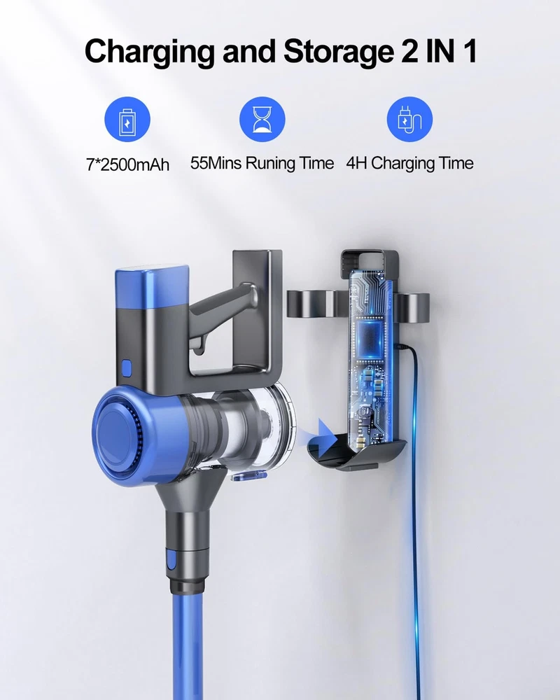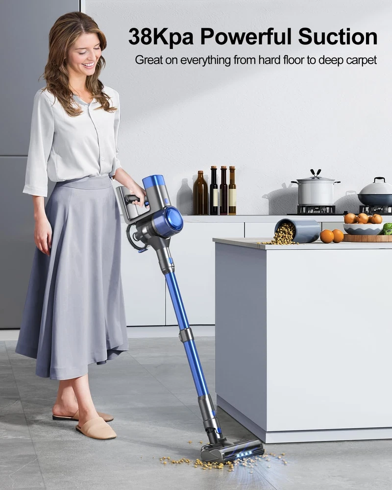 ✿ [450W/38KPA Powerful Suction]: The cordless vacuum cleaner is equipped with the latest upgraded 450W brushless motor in 2024, with higher speed and torque, ensuring an unprecedented suction power up to 38Kpa, dedicated to picking up all surface debris and deeply embedded dirt, beats 90% of the vacuum cleaners on the market!v ✿ [Charging Dock] Always ready for your next clean! Unlike ordinary wall-mount stands, this cordless vacuum is equipped with a wall-mounted docking station, just hang the vacuum cleaner in the charging station and take it off when needed. Or you can remove the battery and charge it separately, without wall mounting. ✿ [Smart Touch Screen] An LED Touch Screen on the top of the battery keeps you posted on everything from battery life to maintenance, and allows you to switch MIN, MID, MAX, and AUTO modes while vacuuming. You can touch the screen to change the suction setting. ✿ [Whole Home Cleaning] The stick vacuum cleaner has 4 suction modes to choose from, so you can tailor it for specific tasks. Battery life is up to 55 minutes in Energy-saving mode. Plus LED floor lights on the brush head for cleaning under furniture and beds, never missing any hidden dust for a whole-house clean. ✿ [Give It a Chance] Worry-free after-sales: We provide a 2-year free protection plan and 7*24 after-sales service for each customer. Give this cordless stick vacuum a chance!