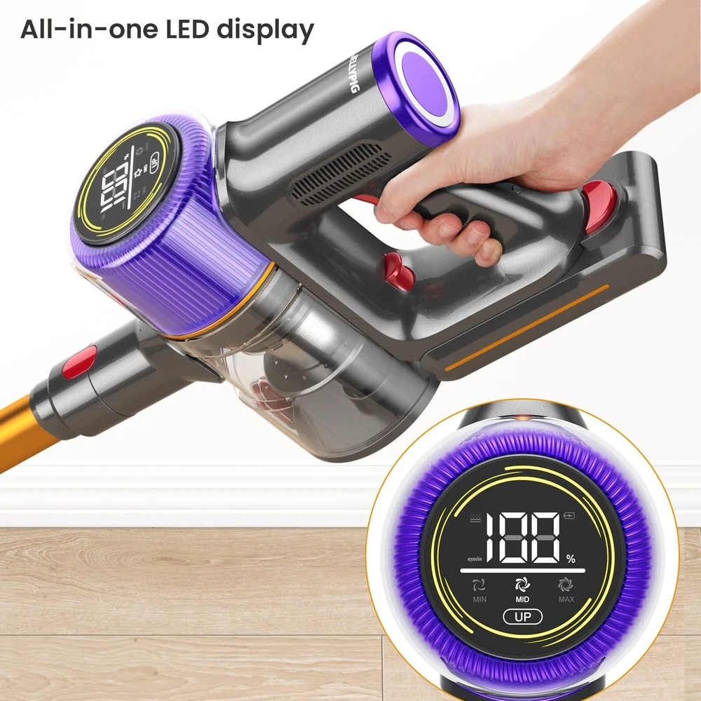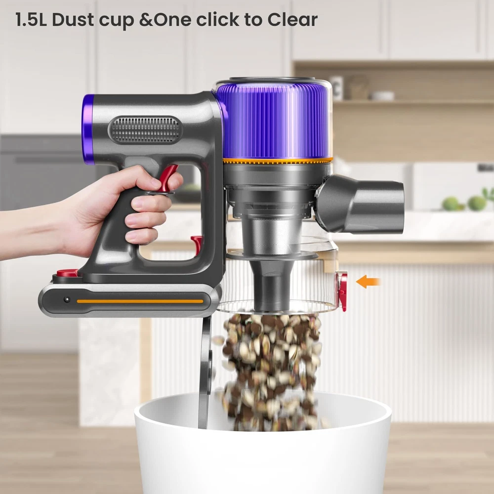 【550W/45Kpa Powerful Suction】Vacuum cleaner has a built-in 550W brushless motor with speed supply up to 300,000rpm, which can provide up to 45Kpa suction power. Easily removes dirt, debris, dust, pet hair, cat litter, pet food and other litter, beating 95% of vacuum on the market! 【Up 60 Mins Run-time】This cordless vacuum provides up to 60 minutes running time in Eco mode. No matter whether it is a 250㎡ large-area house or a complex cleaning task, it does not need to be recharged frequently, so that the cleaning work can be completed in one go, saving you precious time and energy. 【Anti-tangle V-Brush】 Are you still worried about the problem of pet hair in your house? Wireless Vacuum is specially designed for pet families with a V-shaped floor brush, the internal slotted comb teeth can easily solve the problem of tangled hair on the drum. Whether it's carpet or hard floors, it's easy to handle. 【7-layer filtration system & aromatherapy tablet】 The cordless vacuum is equipped with a 7-stage double cyclone system, which can capture 99% of fine particles (> 0.1 micron). Meanwhile, the built-in aromatherapy tablet can emit pleasant fragrance while cleaning, so that your home environment is not only clean, but also full of fresh flavor. [Multiple Accessories &1.5L Dust Cup] The cordless vacuum cleaner is equipped with a variety of accessories to meet different cleaning needs. Whether it's narrow corners, high dust or gaps in furniture, you can find suitable accessories to clean, so that your cleaning work is more comprehensive and thorough. The 1.5 liter dust cup can be cleaned without frequent emptying.