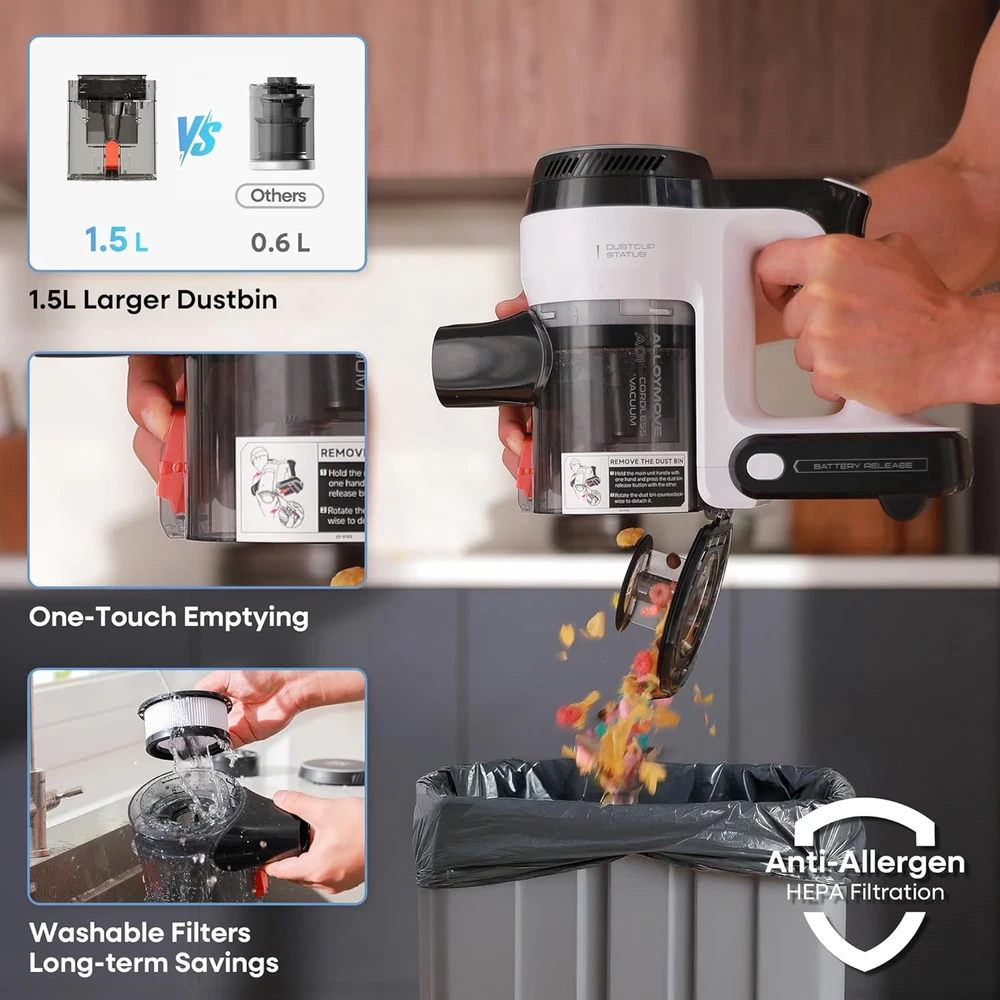 Store New Arrivals Add to Favorite View Feedback Contact Cordless Vacuum Cleaner, 50Kpa/550W/70Mins Stick Vacuum Cleaners for Home, Anti-Tangle Vacuum Cleaner with Detachable Battery&Self-Standing, Lightweight Vacuum for Floor/Carpet/Pet Hair A01 Description Capacity 1.5 litres Colour Name Silver Power source Battery Powered Noise Level 60 Decibels Model Number A01 Item Weight 2.27 kg Surface recommendation All floors Filter type HEPA Filter Product Dimensions 40 x 15 x 40 cm; 2.27 kg Colour Silver đŸ”„ă€Turbo-Strong 50KPa Suction & 550W Brushless Motor】AlloyMove A01 cordless vacuum cleaner features 50,000Pa of super suction power and a 550W brushless high-performance motor. It offers 4 freely switchable suction levels, suitable for different cleaning scenarios.Featuring an independent Turbo Switch, it delivers instant 50,000Pa suction at the press of a button for efficient deep cleaning.Its electric floor brush features a dual-speed design. 🔋【70mins Runtime & Detachable Battery】Say goodbye to frequent charging with AlloyMove A01! The Powerful vacuum cleaner features a built-in high-capacity lithium-ion battery, delivering up to 70 minutes of continuous runtime on a single charge (Bare Floor Mode). The battery can be replaced in 3 seconds, and it can be charged separately for uninterrupted cleaning. Spare A01 batteries are also available for easy purchase, ensuring endless cleaning power. ✅【Real Anti-Tangle Brushroll】This cordless vacuum cleaner features a rubber strip + soft bristle composite design. Unlike ordinary brushrolls that require 30 minutes of manual hair removal every week—a tedious maintenance hassle—this vacuum’s brushroll reduces tangling by 97%, requiring zero maintenance. With a 3-second quick-release design for easy cleaning, it doubles your cleaning efficiency! It drastically cuts down on brushroll maintenance, making it the ideal choice for pet owners. 🌈【Green Searchlight & Rotatable Floor Brush】The A01 vacuum cleaner’s floor brush is equipped with a green LED light that illuminates debris, pet dander, and fine particles invisible to the naked eye, eliminating blind cleaning. It supports 180° horizontal swivel and 90° vertical tilt, enabling easy maneuvering around corners and under furniture while reducing back strain—particularly friendly for elderly users with lumbar muscle strain. 🌟【Easy to Operate & User-Friendly】This cordless vacuum stands upright for easy pausing during cleaning. Thumb-controlled mode switching enables one-handed operation with simple one-touch on/off (no long pressing required). The telescopic tube features a dual-button design for smooth extension and retraction. A user-friendly operating guide on the body helps novices quickly master use and clean the entire house effortlessly. Product Description 1 50Kpa Suction Vacuum 2 Max 70Mins Runtime 3 One Thumb. Full Control 4 Self-Standing Design 5 7-layer Filtration System 1 Sealed Filtration 2 Mess-free Emptying 3 Quietly Powerful 4 Lightweight≈5.9lb 1 Say Goodbye to Hair 2 Deep Cleaning 3 Eye-safe Green Leds 4 Maximum Coverage 5 Flexible Motion 1 Charge Your Way 2 Abundant accessories 3 Washable Filter 4 Product List AlloyMove Cordless Vacuum Cleaner Runtime 70Mins Runtime 60Mins Runtime 80Mins Suction 50Kpa Suction 45Kpa Suction 50Kpa Max Power 550W Max Power 450W Max Power 550W Dustbin capacity 1.5L Dustbin capacity 1L Dustbin capacity 1.5L ABOUT US At TheNextDayShipper, we always put the customer first - that's why we offer free next day delivery and 30 day returns on all of our products SHIPPING We’re a UK-based seller, dedicated to getting your order to you as quickly as possible. We ship all orders the same day and deliver next day across the UK, completely free of charge. While we work hard to ensure every parcel arrives on time, please understand that factors such as weather conditions, postal delays, or courier performance may occasionally be outside our control. For international buyers, we use eBay’s Global Shipping Programme . Your item will first be sent to eBay’s UK distribution centre and then forwarded to your country. International customers are responsible for any import duties or taxes, and any queries regarding the Global Shipping Programme should be directed to eBay directly. RETURNS We offer a 60-Day Return Policy on items in which you are not completely satisfied with. You have the option of a full-refund or an exchange of the item. No returns are available on items shipped outside of the UK. PAYMENT We accept PayPal. CONTACT US This page content is yet to come Please ad us to your favorite seller and visit again later Thank You CUSTOMER SATISFACTION We try our very best to make sure every customer is completely satisfied. If there's a problem, message us! We're happy to help and always reply within 24 hours. WE ACCEPT