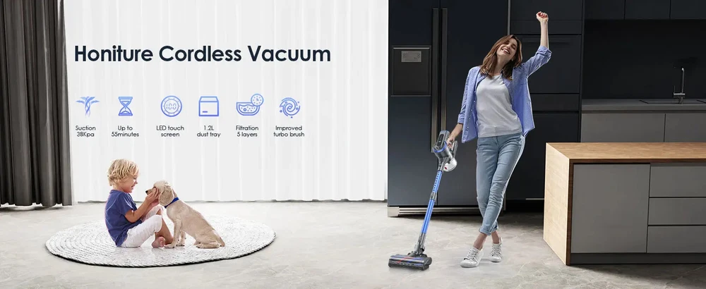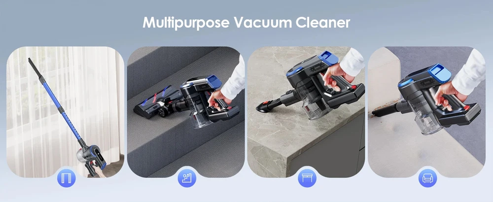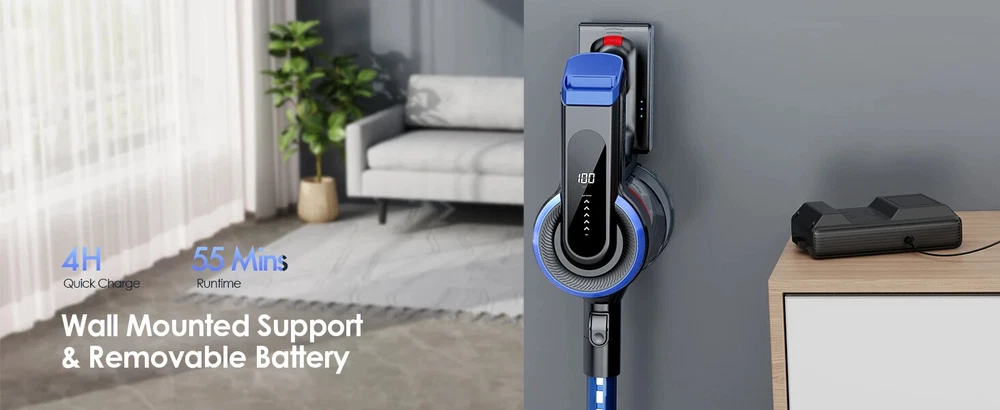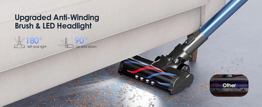 38000pa Brushless Motor Vacuum Cleaner: With a 450W brushless motor, it generates strong suction power of 15Kpa-38Kpa and 5 adjustable gears, it helps to clean dust, animal hair, cat litter, and mites, helping you thoroughly clean sofas, beds, carpets, and floors, bringing you a highly clean environment. The battery of this vacuum cleaner can be fully charged within 4-5 hours, with a 7 * 2500mAh battery and an intelligent battery protection chip to ensure battery life. 【 Ultra clear LED screen 】 You can control the 5 power settings of the vacuum cleaner on the screen and monitor its operation in real-time. The powerful vacuum cleaner features a 1.2-liter large capacity dust cup and a 5-layer cyclone filtration system, effectively reducing emptying frequency and interruptions. A 5-layer cyclone filtration system effectively separates and concentrates waste in the storage tank. Equipped with a 6C ground brush and an advanced V-shaped soft brush with bristles to prevent hair from tangled with the brush, it is highly efficient