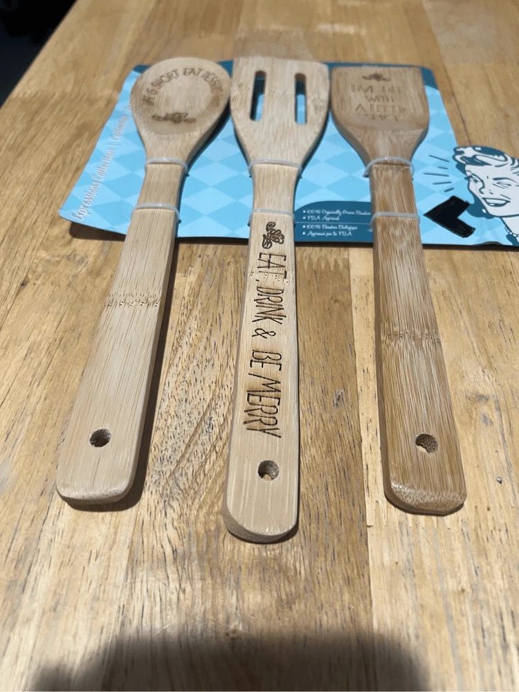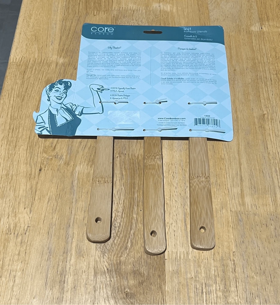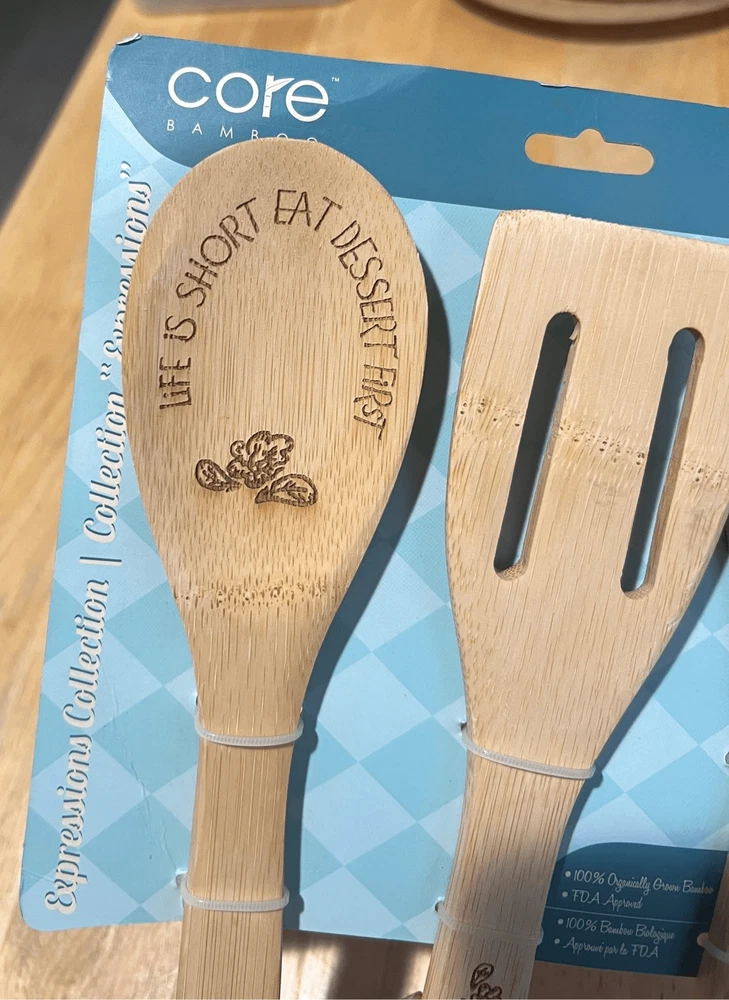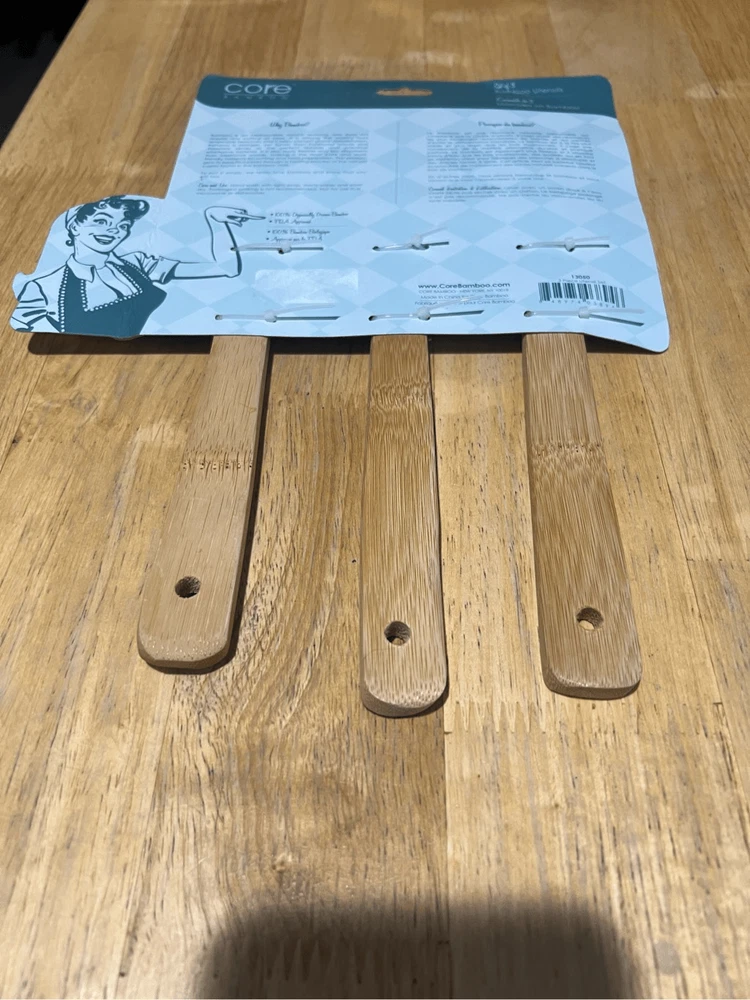 Core bamboo kitchen utensils. Includes 3. NEW but does have black mark stop on the package. Does not affect actual product. See photos. Color may very in person as my phone changes the colors sometimes Offers always welcome Check out our other listings! All items are cross posted.