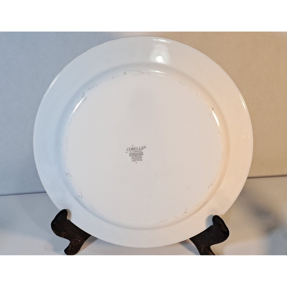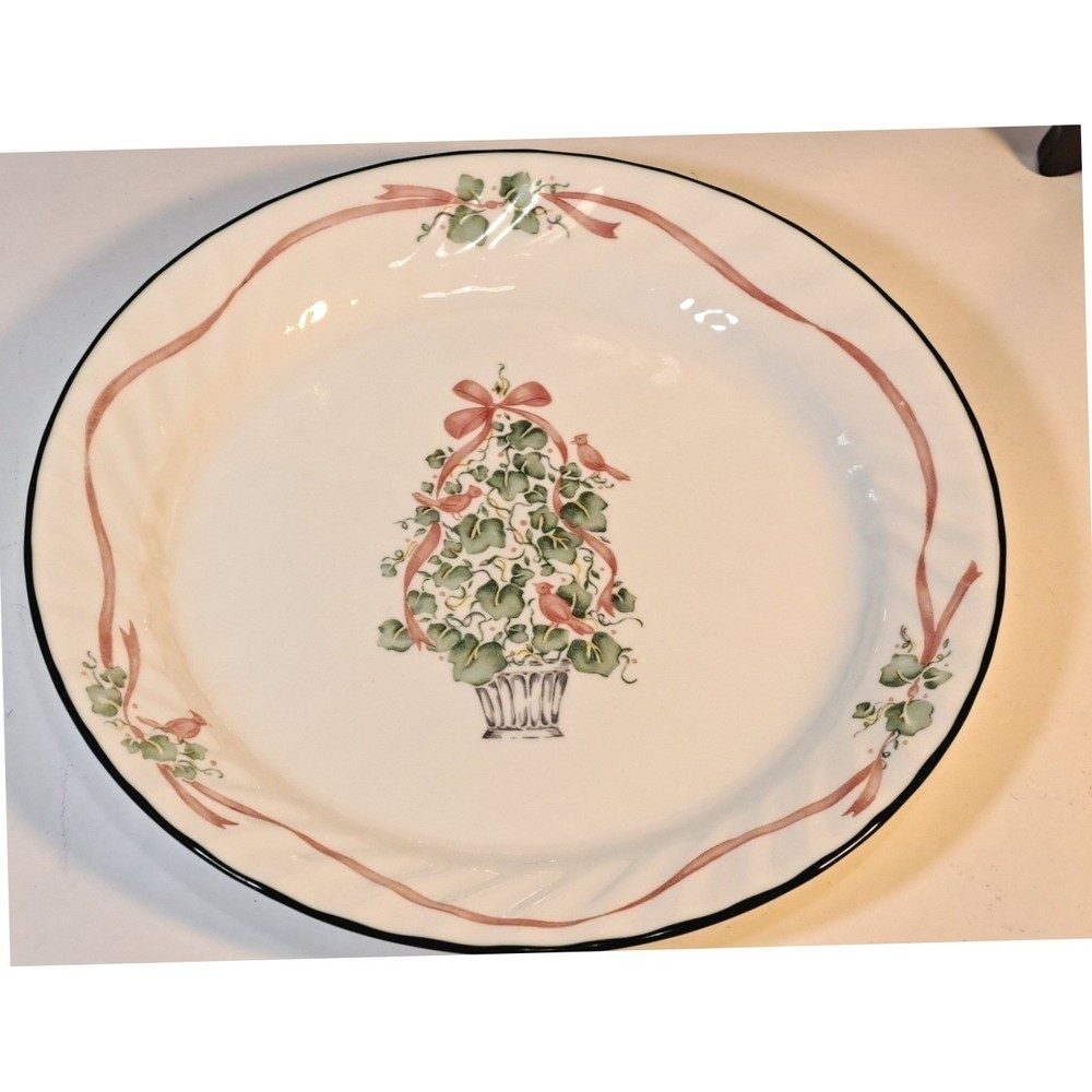 Corelle by Corning Callaway Holiday dinner plates bring a festive touch to your seasonal table setting. This set of four plates features a central topiary design composed of green ivy leaves and red cardinals, accented by a pink ribbon bow. A matching pink ribbon border and a dark green rim frame the scalloped edges of these durable Vitrelle glass plates. Known for being lightweight and break-resistant, these plates are also microwave and dishwasher safe, making them as practical as they are charming for holiday entertaining. Brand: Corelle by Corning Pattern: Holiday Ivy Callaway Material: Vitrelle Glass Color: White, Green, Pink, Red Shape: Round Edge: Scalloped Design: Ivy Topiary with Cardinals and Ribbons Country of Manufacture: USA Features: Microwave Safe, Chip Resistant Keywords: Christmas, Holiday, Winter, Topiary, Cardinal, Ivy, Vintage Corelle, CorningWare, Festive Table, Seasonal Dining, Shabby Chic, Traditional, Farmhouse Holiday