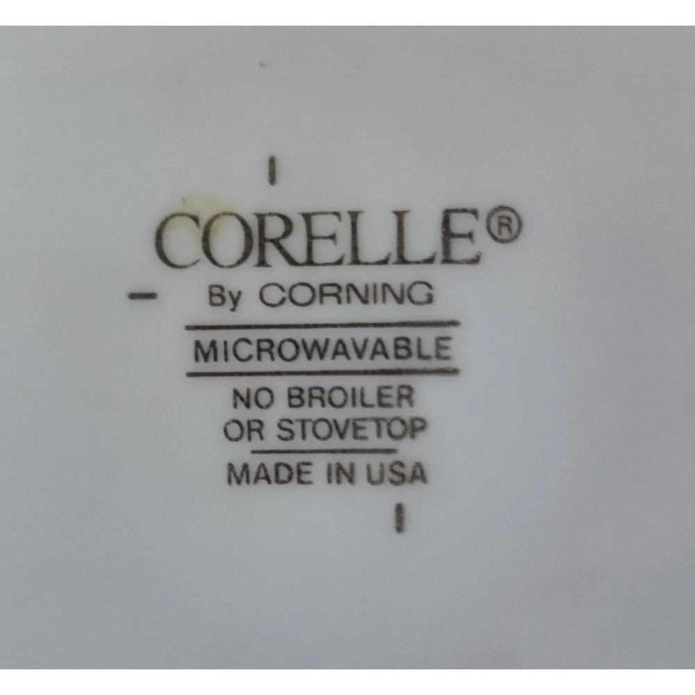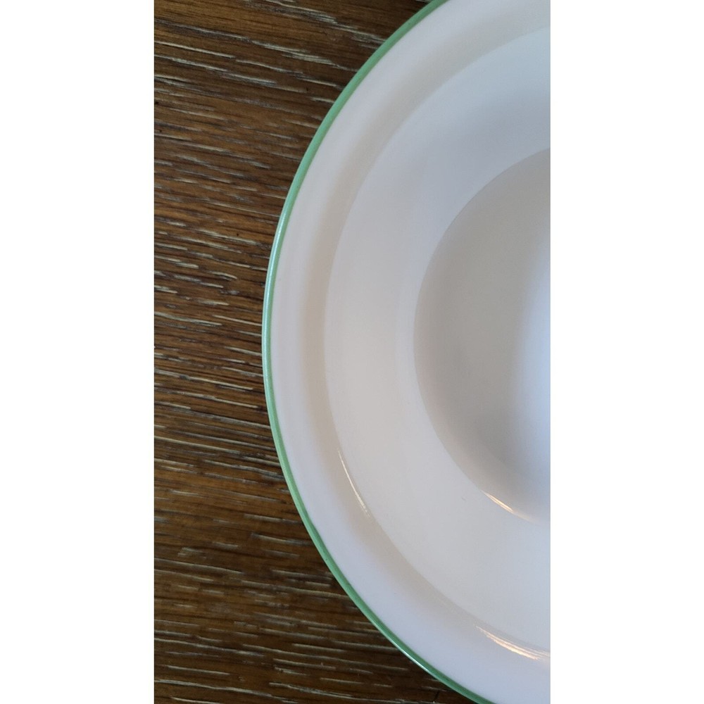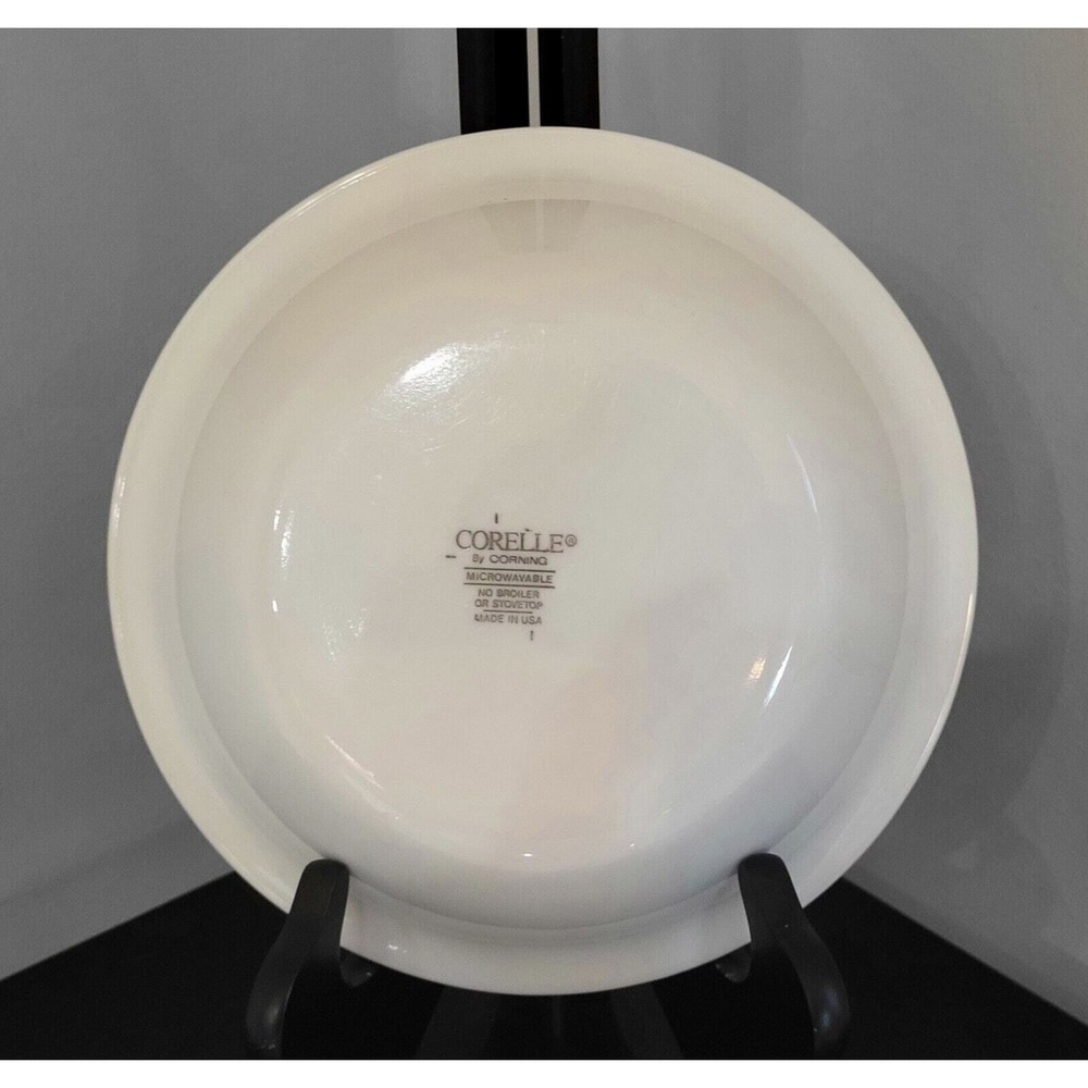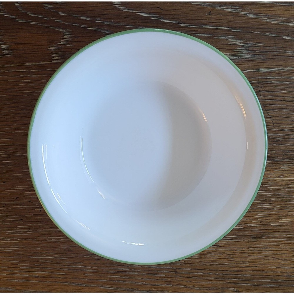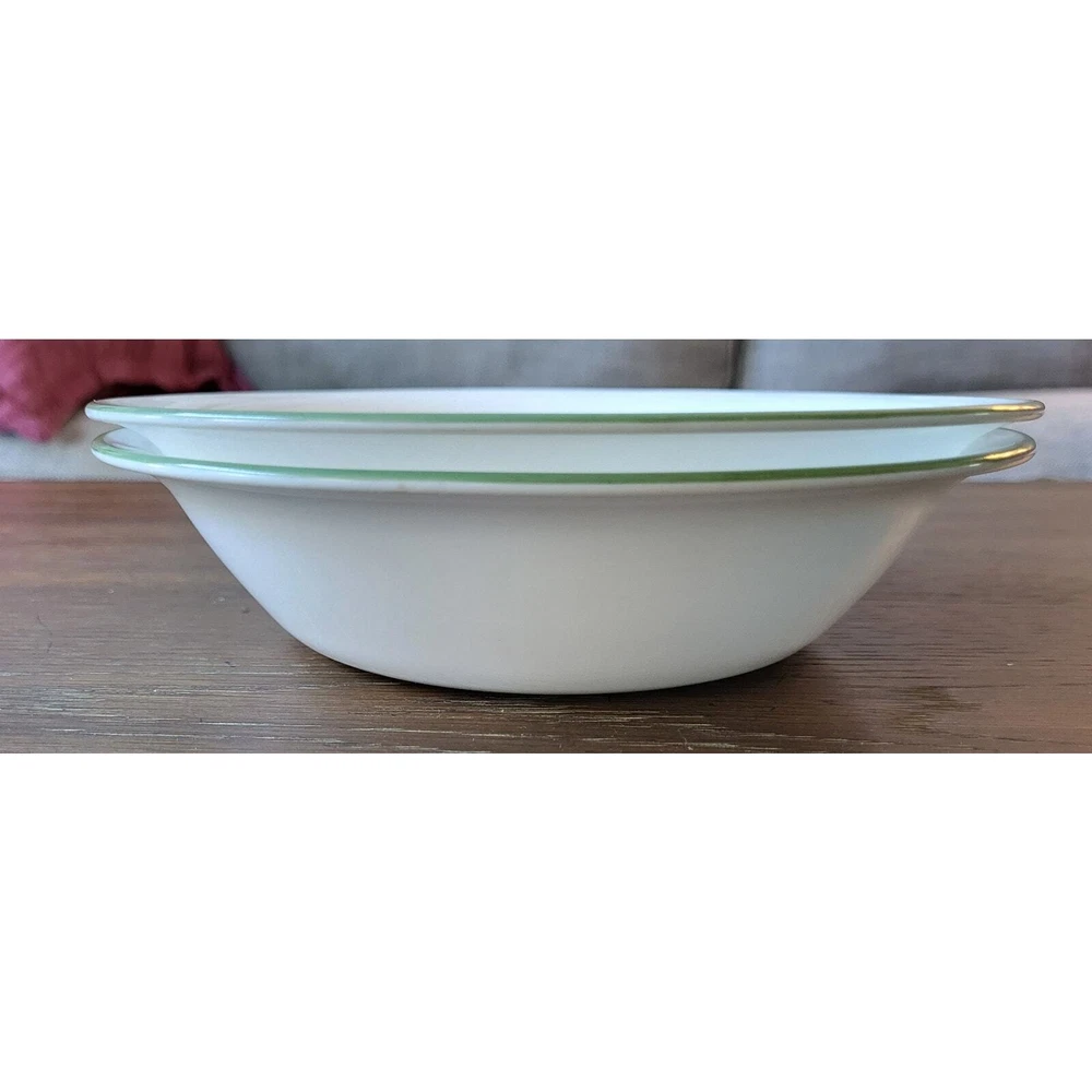 Add a touch of elegance to your dining table with this set of two Corelle Shadow Iris cereal/soup bowls. The round bowls feature the green rim, which are part of the shadow iris pattern. They are made of virtrelle material, which makes them break-resistant, stackable, microwave safe, dishwasher safe, and decorative. The glossy finish and green rim add a pop of color to any occasion, whether it's a formal dinner or a casual lunch with friends. The set includes three bowls and is an original Corelle product, produced using pressed glass and fused glass techniques in the United States. The backstamp is printed, and the bowls are part of the Shadow Iris product line. Perfect for all occasions, these bowls are a must-have addition to any kitchen or dining room. Excellent condition bowls. No chips...