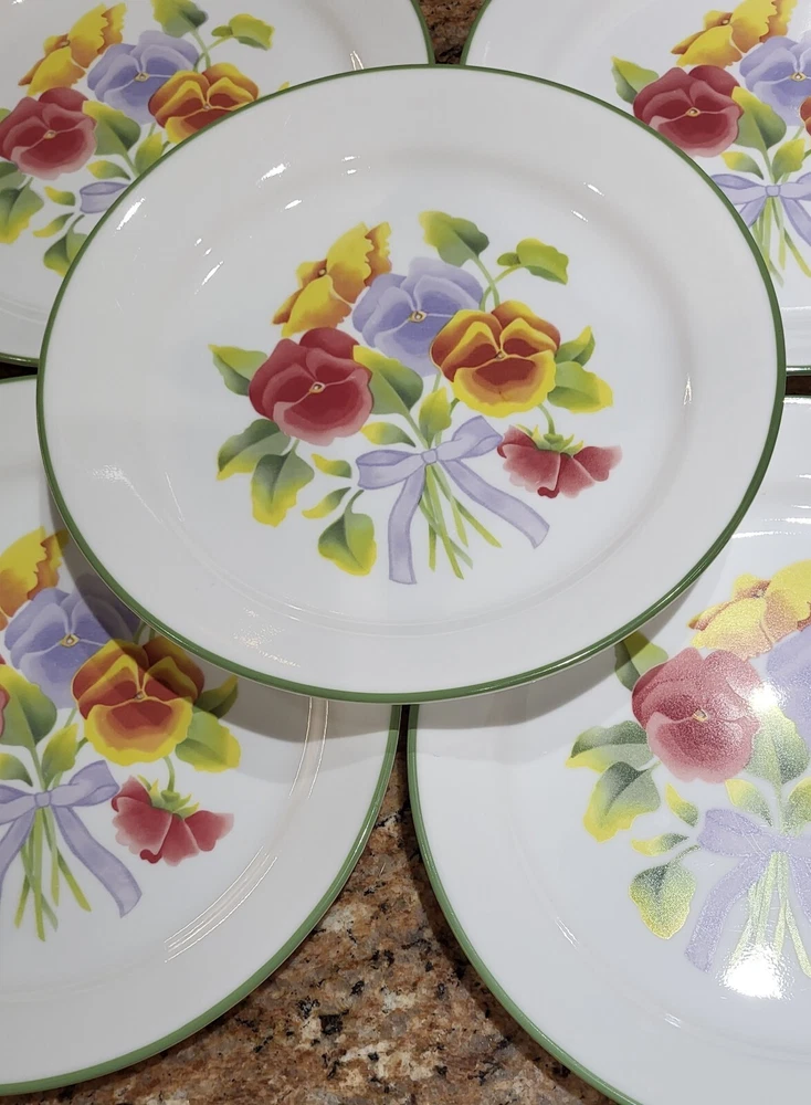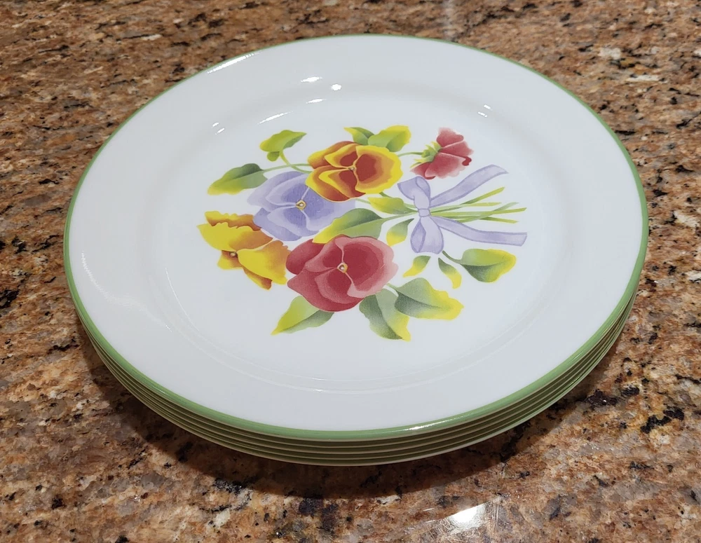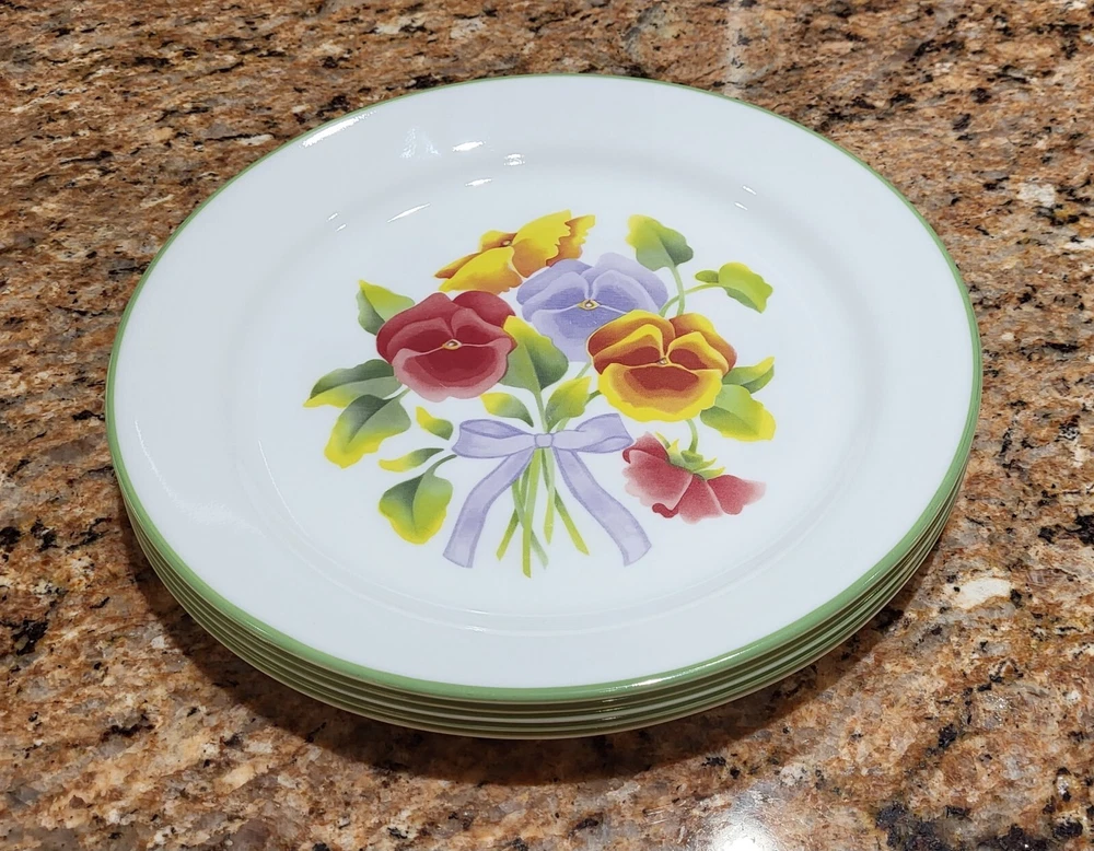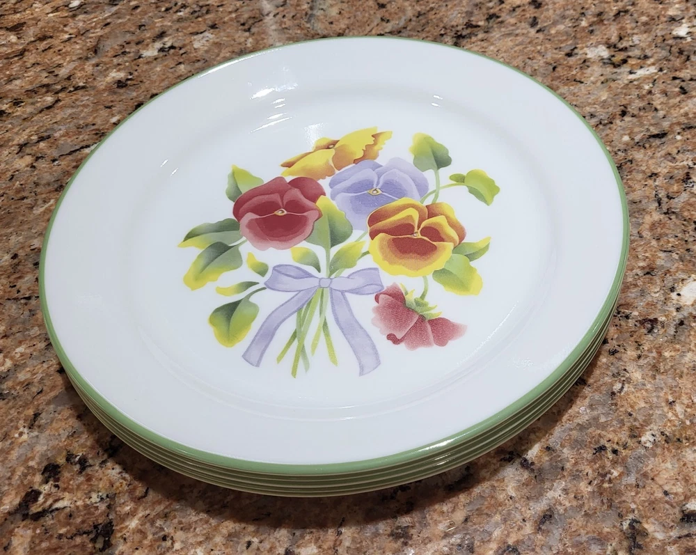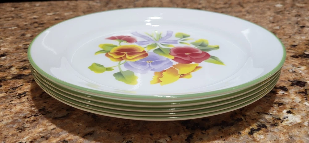 Elevate your dining experience with the timeless elegance of Corelle's Summer Blush luncheon plates. Each plate in this set of five showcases a delicate array of multicolor pastel florals and pansies, bringing a touch of nature's beauty to your table. Crafted from durable glass, these plates are not only decorative but also highly functional, designed to withstand the rigors of daily use. With a generous 9-inch diameter, they provide ample space for your favorite salads and lunch dishes. Their glossy finish and fused glass production style ensure a sleek, seamless appearance. These plates are stackable for easy storage, microwave and dishwasher safe, and can be gently machine washed at up to 140°F to maintain their charm. Whether for everyday use or special occasions, these Corelle plates are a testament to classic American craftsmanship. Excellent condition set of plates! Add them to your kitchen. Great for replacements, daily use or display!