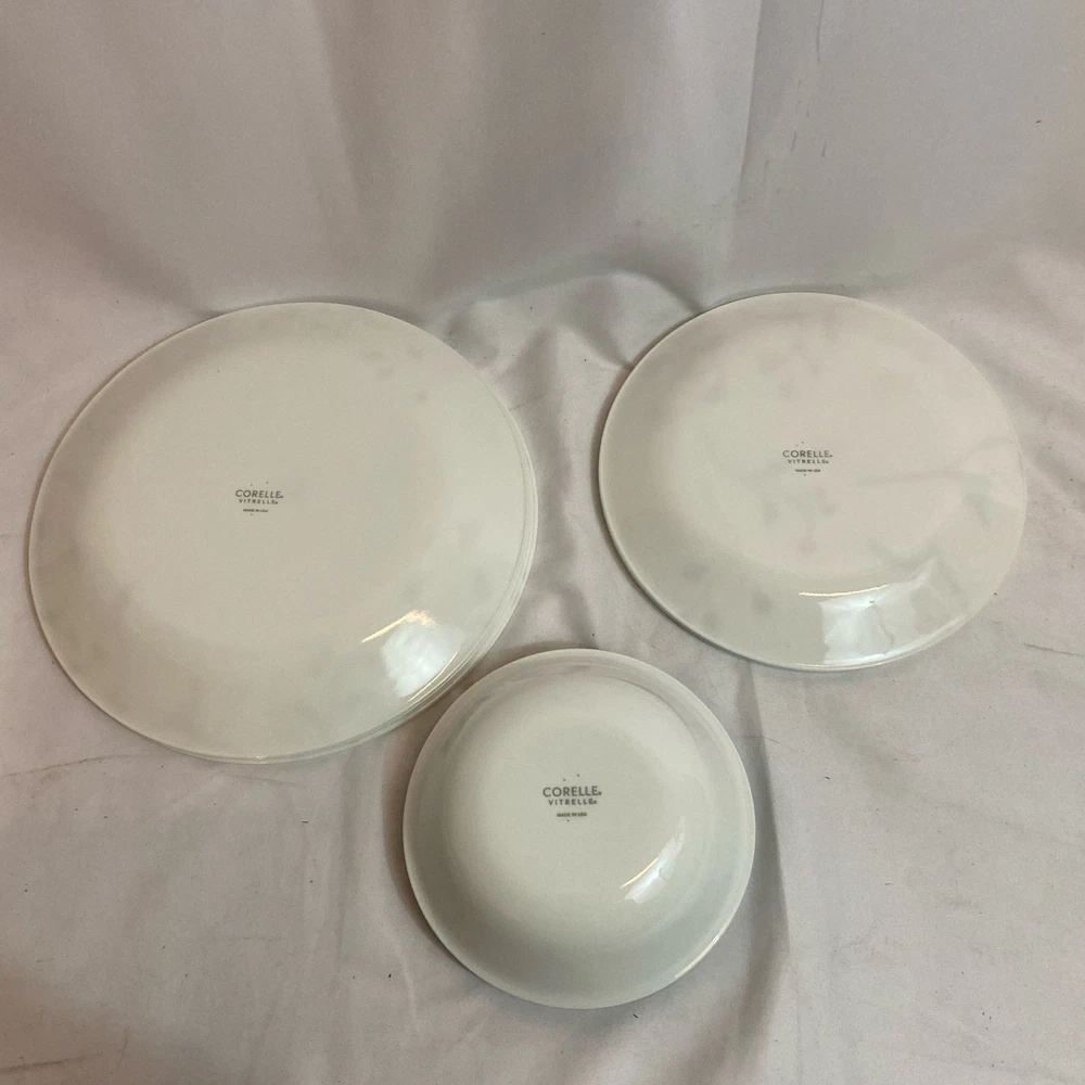 Number of Place Settings: 4 Features: Dishwasher Safe, Microwave Safe Manufacturer Warranty: 3 Years Material: Glass Brand: Corelle Seller Notes: “New - Damaged Packaging” UPC: 071160157248 Department: Adults Set Includes: Dinner Plate, Salad Plate, Soup Bowl Type: Dinner Set Shape: Round Original/Reproduction: Original Occasion: All Occasions Number of Compartments: 4 Style: Modern gtin13: 071160157248