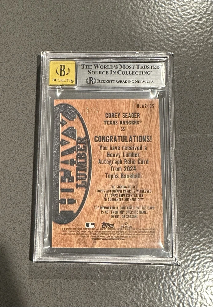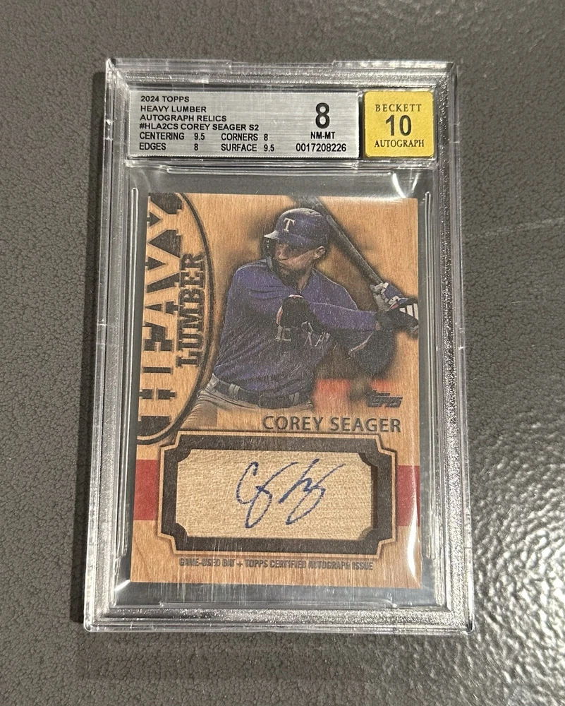 Elevate your collection with the 2024 Topps Series 2 Heavy Lumber Auto Super Short Print card, featuring Corey Seager of the Texas Rangers. This exclusive memorabilia is serial numbered to just 25, making it a rare and coveted piece for any serious collector. The card boasts a pristine grade of 8 from Beckett Grading Services, with the autograph component receiving a perfect score of 10. Crafted with a unique wood parallel/variety, the card is an insert from the esteemed 2024 Topps Series 2 set. Its design showcases the finesse and craftsmanship expected from a leading name in sports trading cards. Own a piece of baseball history with this exceptional Corey Seager card, sure to be the centerpiece of your collection.
