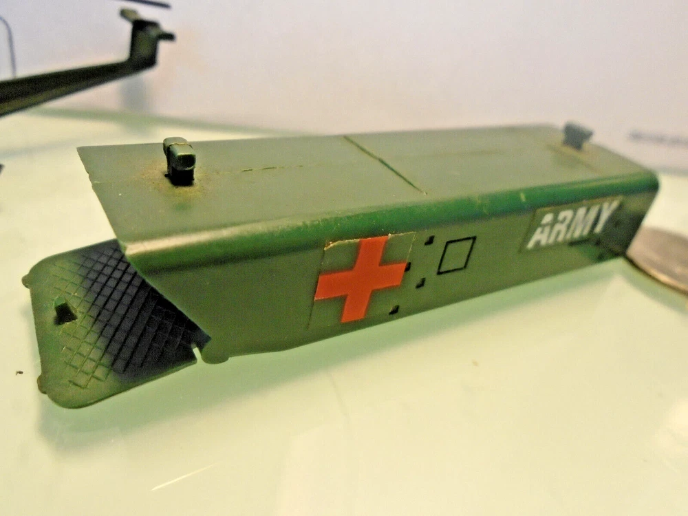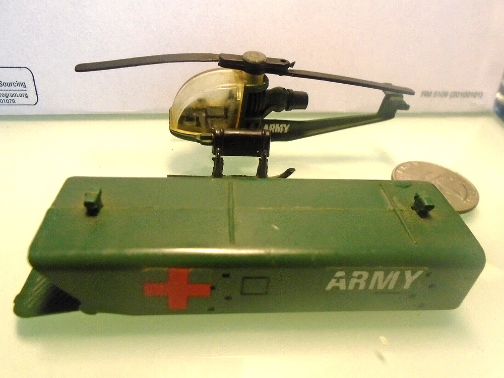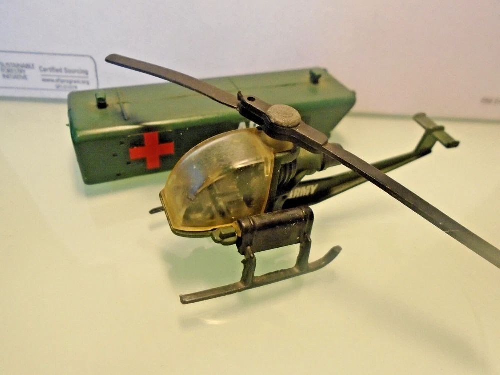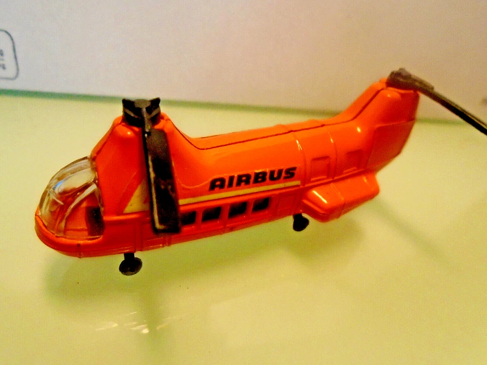 Here is a 1970's era CORGI,Jr of England U.S. ARMY Helicopter and a cargo container with a fold down ramp. Also by Corgi,Jr an orange AIRBUS Copter. Lastly a MATCHBOX Sea Plane with folding wings. Perhaps you would like to add this piece to your Corgi Jr collection. Thanks for looking !