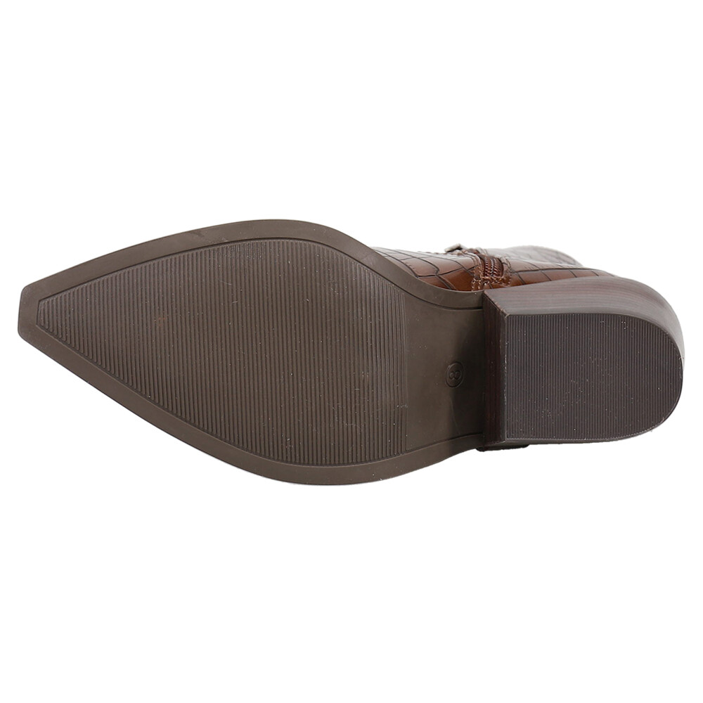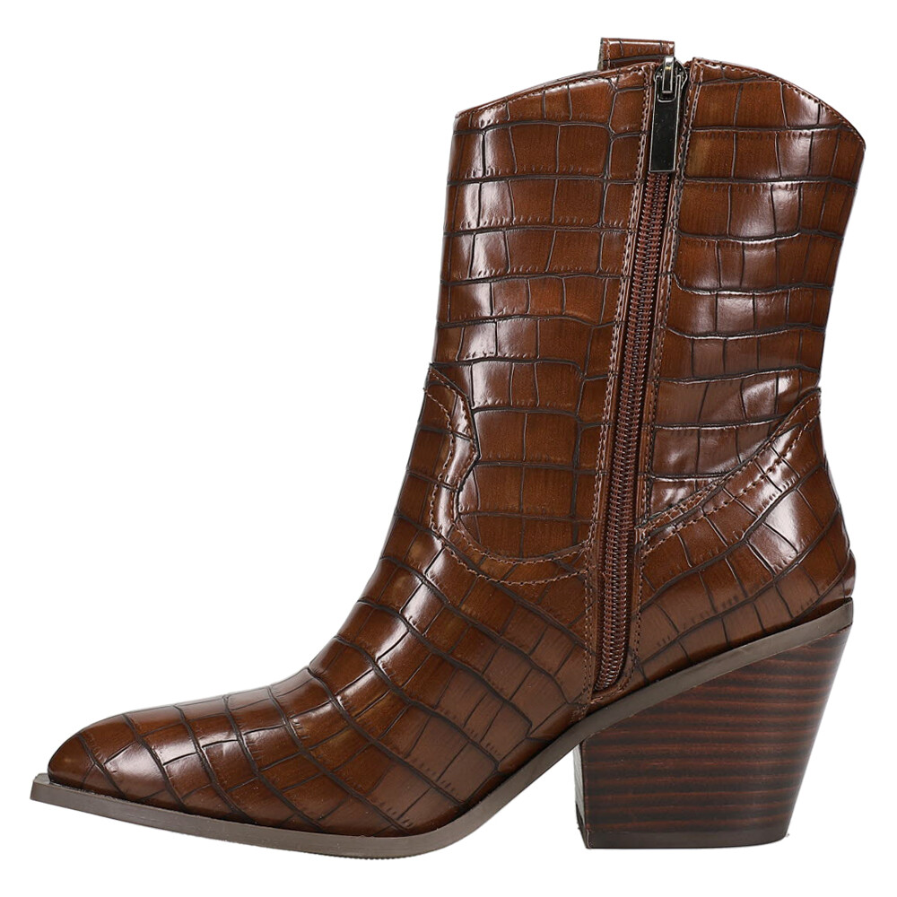 Rowdy Croc Embossed Snip Toe Cowboy Booties Product Details Leather upper Pull on entry with side zipper Rubber Sole 3 Inch Heel Snip toe Giddy on up and get these Cowboy booties. These Corkys Rowdy Western Boots are already one of our favorites this season. These western cowboy boots are designed with classic embossed, pull on style, snip pointed toe, thick 3 inch heel and a rubber sole. Additional Details Color: Brown Occasion: Casual Gender: Womens Age: Adult Brand: Corkys