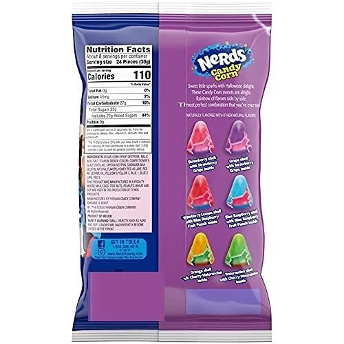 Mystical and mouth-watering Corn features a one-of-a-kind eating experience -- candy coated shells wrapped around soft & chewy Nerds fruity centers! Corn is wickedly awesome with flavors like: Grape shells with Strawberry/Grape inside; Strawberry Lemon shells with Blue Raspberry/Fruit Punch inside; Blue Raspberry shells with Blue Raspberry/Fruit Punch inside; Orange shells with Cherry/Watermelon inside; Watermelon shells with Cherry/Watermelon inside. Each order contains 32oz -- 2 Pounds TOTAL. A Halloween candy corn classic now mixed with ! Get this seasonal treat before its gone! A Halloween candy corn classic now mixed with ! Each order contains 32oz -- 2 Pounds TOTAL. Mystical and mouth-watering Corn features a one-of-a-kind eating experience -- candy coated shells wrapped around soft & chewy Nerds fruity centers! Grape shells with Strawberry/Grape inside; Strawberry Lemon shells with Blue Raspberry/Fruit Punch inside; Blue Raspberry shells with Blue Raspberry/Fruit Punch inside; Orange shells with Cherry/Watermelon inside; Watermelon shells with Cherry/Watermelon inside. A Halloween candy corn classic now mixed with ! Get this seasonal treat before its gone!