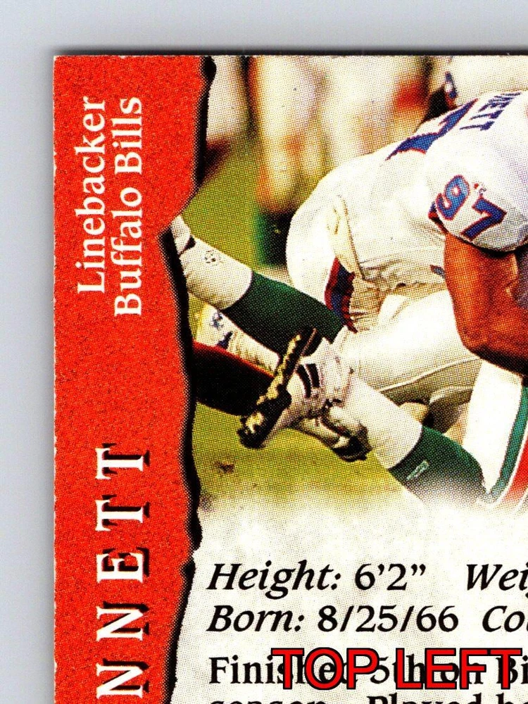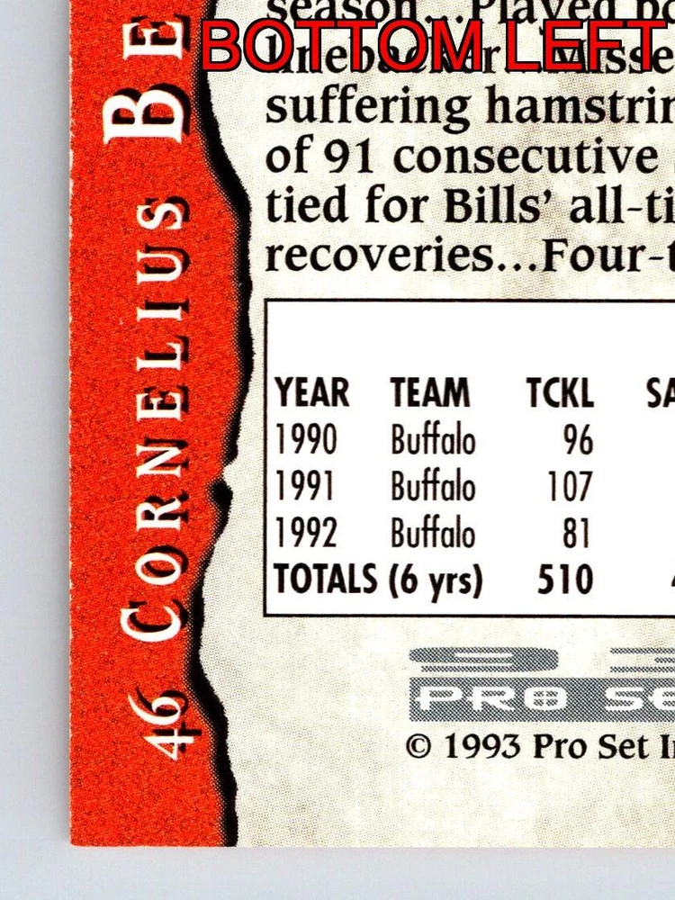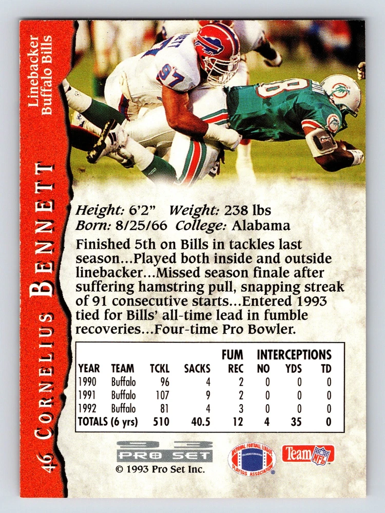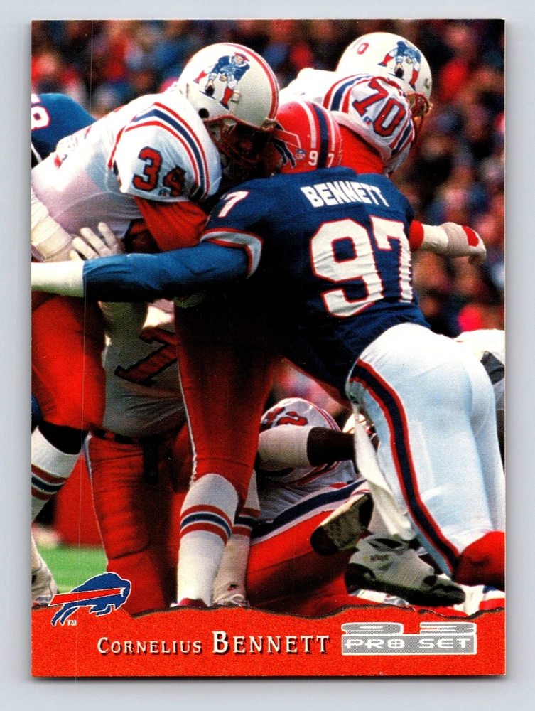 Item Description Title: Cornelius Bennett Linebacker Buffalo Bills Pro Set 1993 Card 46 NFL Description: This sports trading card features Cornelius Bennett; the talented linebacker who made a significant impact during his time with the Buffalo Bills. Part of the 1993 Pro Set series; the card captures Bennett in action; portraying his defensive prowess and agility on the field. Known for his versatility; Bennett excelled playing both inside and outside linebacker positions; contributing to the Bills' defensive strength. His remarkable ability to read the game and make crucial tackles is highlighted through various statistics showcased on the card; emphasizing his consistent performances over multiple seasons. Standing at 6'2 and weighing 238 lbs; Bennett's physical attributes were a perfect match for his role. With a career marked by resilience and excellence; he earned multiple Pro Bowl selections; further cementing his legacy in NFL history. MRSP: $4.99 Sport: Football Player/Athlete: Cornelius Bennett Season: 1993 Manufacturer: Pro Set Parallel/Variety: Unknown Set: Pro Set Football 1993 Team: Buffalo Bills League: National Football League (NFL) Card Number: 46 Counter: 111 Folder: FOOTBALL1224A02