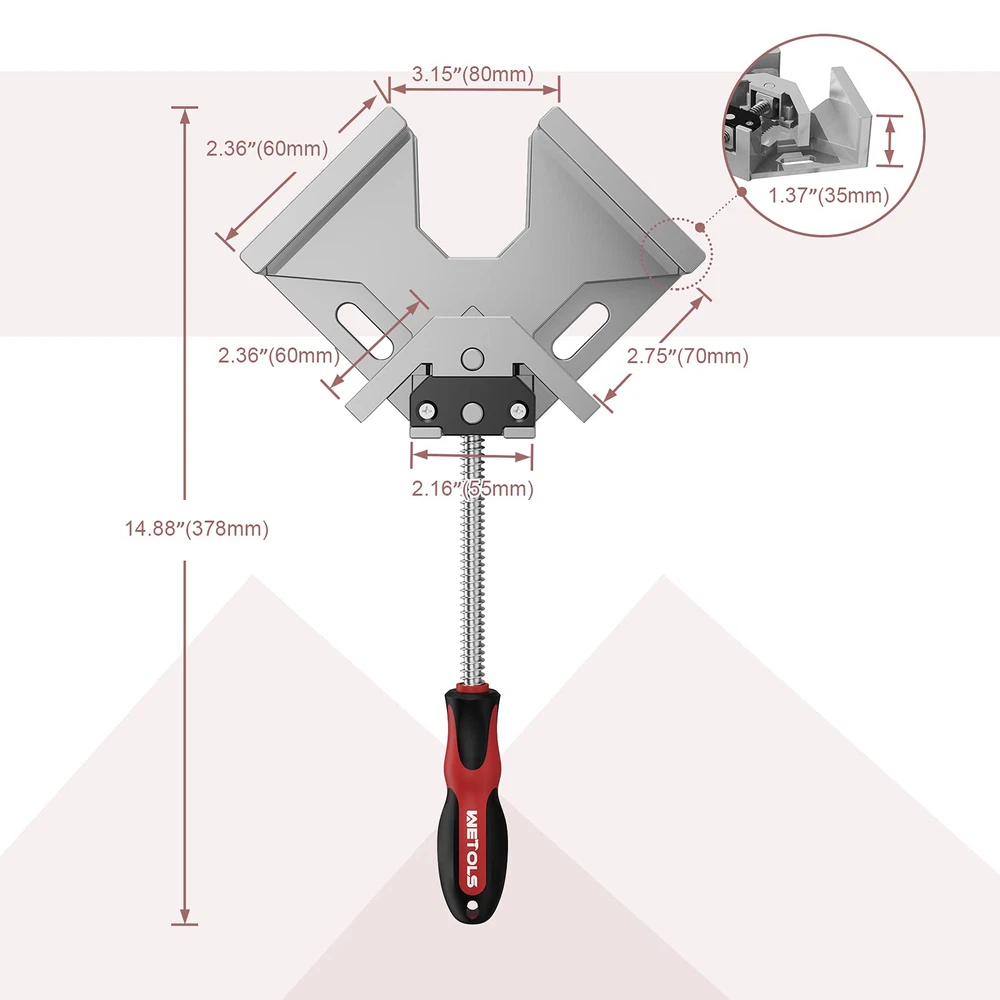 Trustworthy Quality: corner clamp is uniquely prepared with the aluminum alloy die-casting based construction, where high durability and well-built design are conveyed to ensure long-lasting use Clamping Range: Maximum clamping range is approx. 2.76in/70mm; jaw width: 3.74in/95mm; jaw depth: 1.4in/35mm, allowing different thicknesses of the wood block to be connected at the right angle. It can accommodate most large things including metal tubes, steel rods, wood, thick glass, and more Swing Jaw Design: The corner clamp's single-handle jaw can be rotated in -way, making clamping more convenient and holding workpieces precisely Ergonomic Design: Anti-skid handle is nicely covered with rubber to ensure users' comfort hands. Whether for professional use or DIY use, corner clamps for woodworking are absolutely useful tools to choose Versatile Use: 90 degree right angle clamp is perfect for welding, framing, drilling, doweling, woodworking, making cabinets, installing furniture, box and picture frames, etc