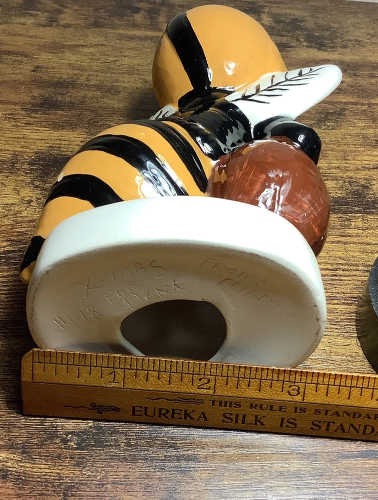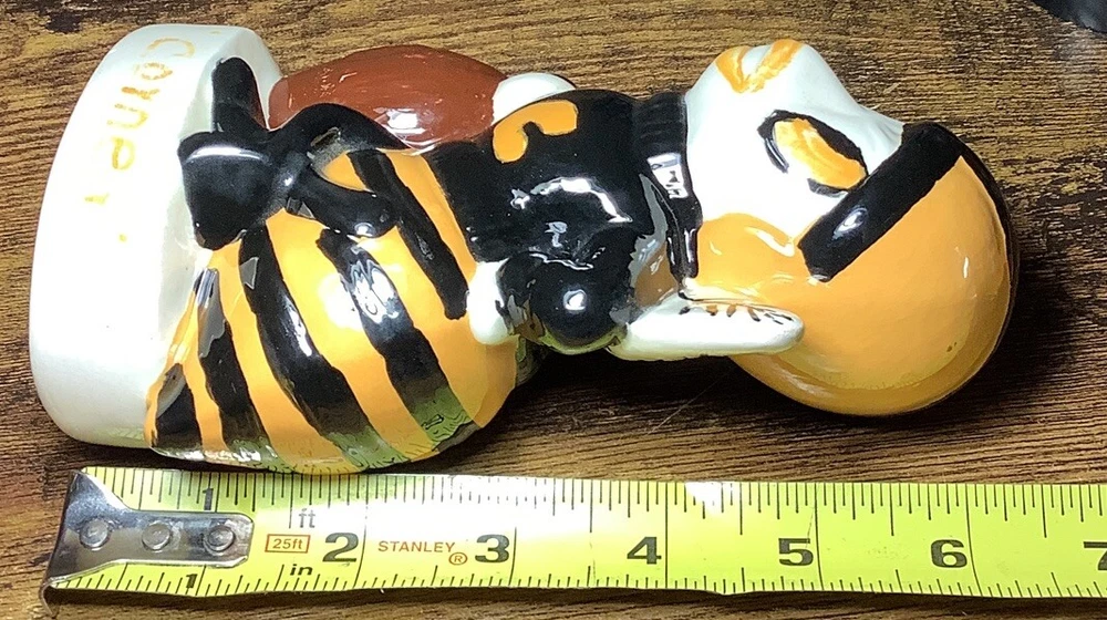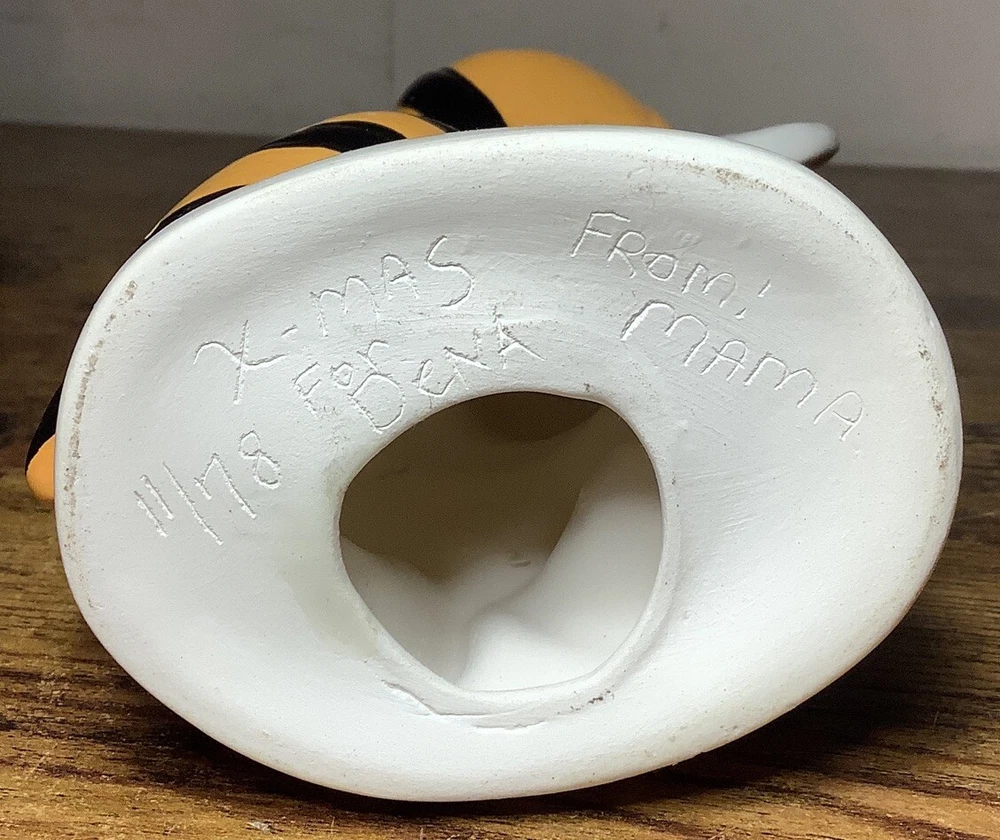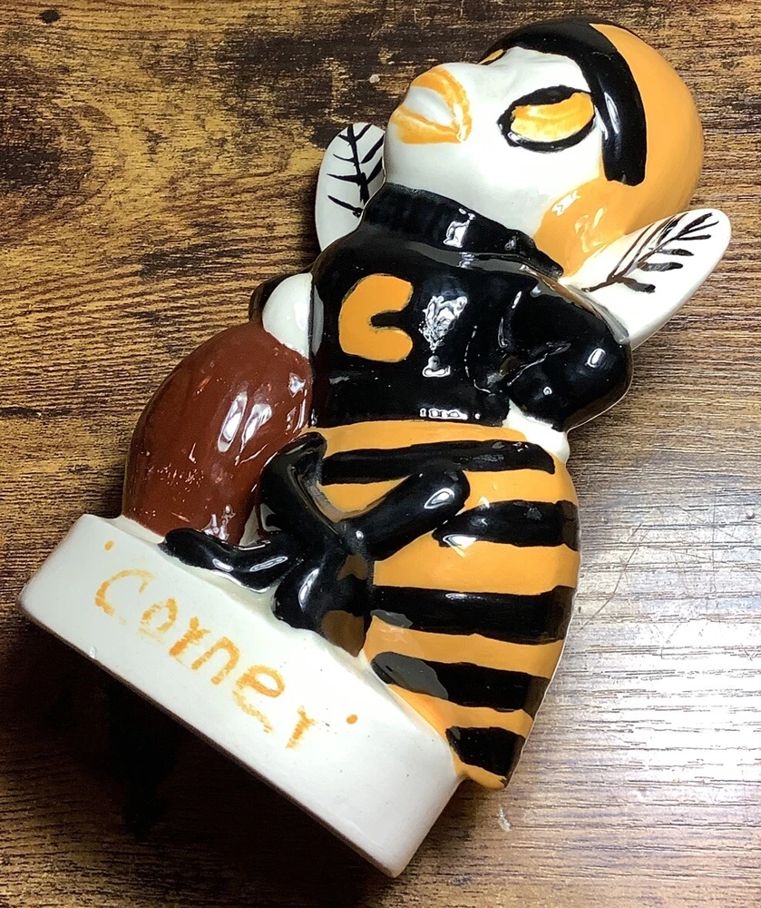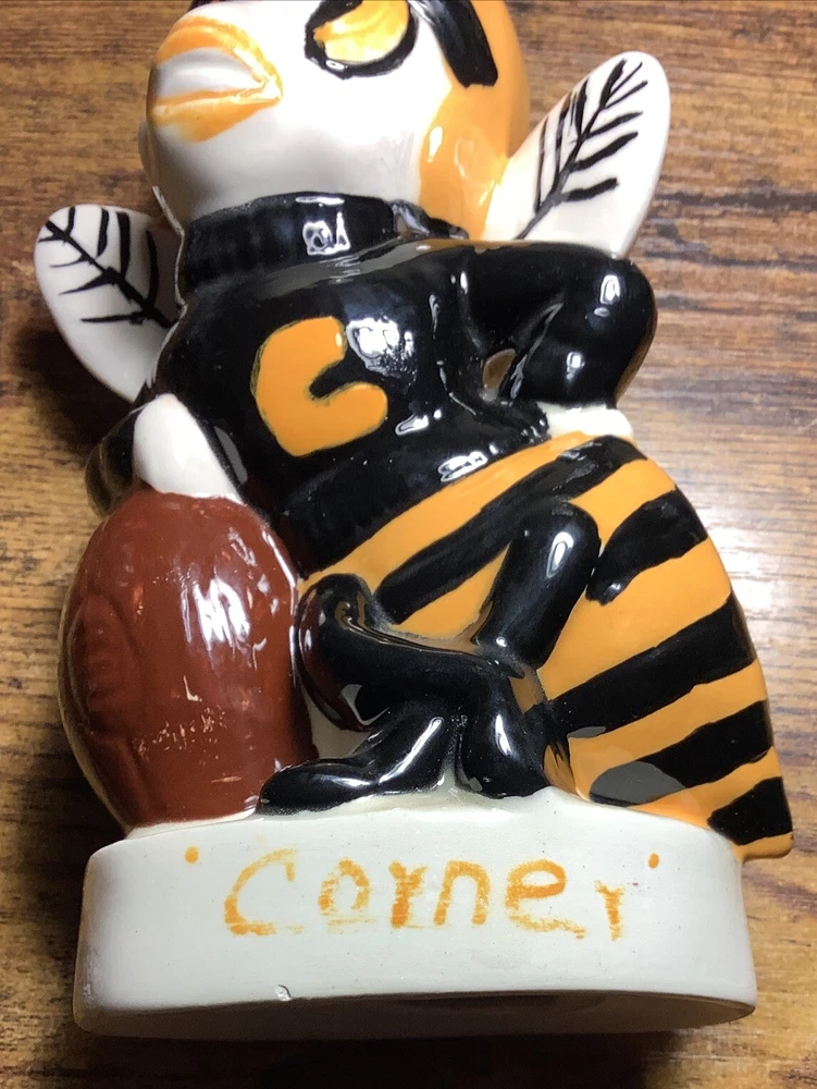 For auction is a vintage original 1978 Corner High School ceramic Bee Football Mascot coin bank. The base has inscriptions which can clearly be seen. Various measurements are pictured. This High School, which is still open to the public, is in Jefferson County Alabama. The hole in the base is currently open and will need a new rubber stopper. For whatever reason the coin slot was never cut in the Bees body. It can easily be accomplished however with minimal skills. It has a few paint scuffs and scratches but no major damage at all. No cracks or breaks, no repairs. Overall very nice piece! Especially considering it’s age. If any issues arise PLEASE contact me first before leaving feedback for a near immediate solution. My #1 goal is happy,satisfied customers. Look at pics well and determine condition for yourself, feel free to ask any questions you may have. The piece pictured is the one you will receive. I will ship within 24 hours of payment. Thanks!!! 🙂🇺🇸