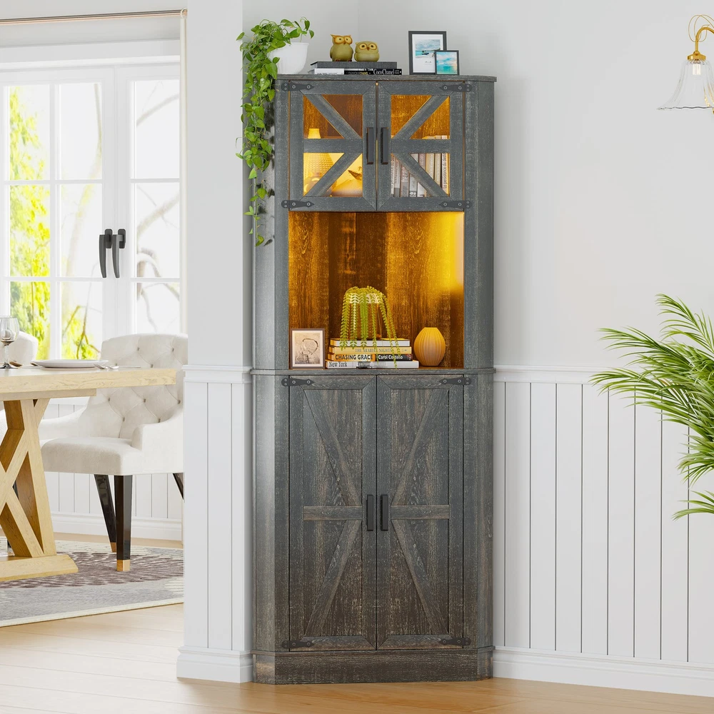 Product Description Set of Furniture for Living Room/Bathroom - available for your need Human Sensor Lights and Charging Station Gurexl Corner Storage Cabinet with LED Lights 3 Color Auto Sensor Light : white-warm-blue , the brightness can be adjusted Chaging Unit : 1 usb & 1 type-c port Huge Storage Capacity : 2 cabinet & 2-tier shelf & a large countertop 2-in-1 Charging Station - Convenient to charge your appliances,phone,headphone Huge Storage Capacity & Lighting Adjustment Human Sensor Lights - More intelligent, more power-saving More Details of the Farmhouse Lighted Corner Cabinet Acrylic Door with Handles Through the door, you can see what's inside Removable Shelf When you remove this panel, the height of this cabinet becomes 30 inches high 3''H Heightened Base Triangular heightened base provides a sturdier support base. Anti-fall Device Design If you have children or pets that like to climb, we highly recommend using the wall anchors and brackets included in the package Shipping ★If you have not received your item after estimated delivery days, please dont hurry to open case to us. Contact us immediately , we would recheck the shipping status for you and decide refund or something in your request. ★We are also happy to offer personalized discounts for larger order. Returns ★ Return & Replace. All returned products must be in their original packaging with all included accessories intact,and must be accompanied by a copy of the Return Item Authorization (RMA) issued by us,and sent to the address indicated in the Return Item Authorization.We shall notify you by email once we have received and processed your returned item. We typically process your returned items for evaluation & investigation within seven (7) days of receiving them.If it meets our warranty requirements,a refund will be given or a brand new replacement unit will be sent to you at our cost. ★ Taxes & Custom Duties. The shipping cost does not cover any local taxes, import duties, customs clearance,or any other import-related costs levied by your government.Please check with your local customs office for more information. Contact Us ★Please feel free to contact us by email if you have any questions, we will try our best to help you. ★We will reply all the message with 48 hours. If you do not get our response after 48 hours, please contact us again. Payment ★We accept paypal or Bank card payment. ★We will ship out your item very soon after we receive your payment. powered by