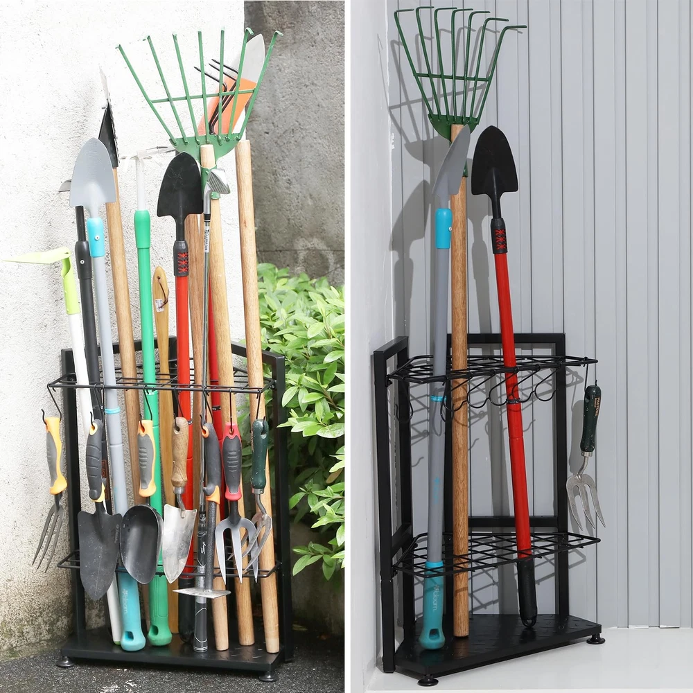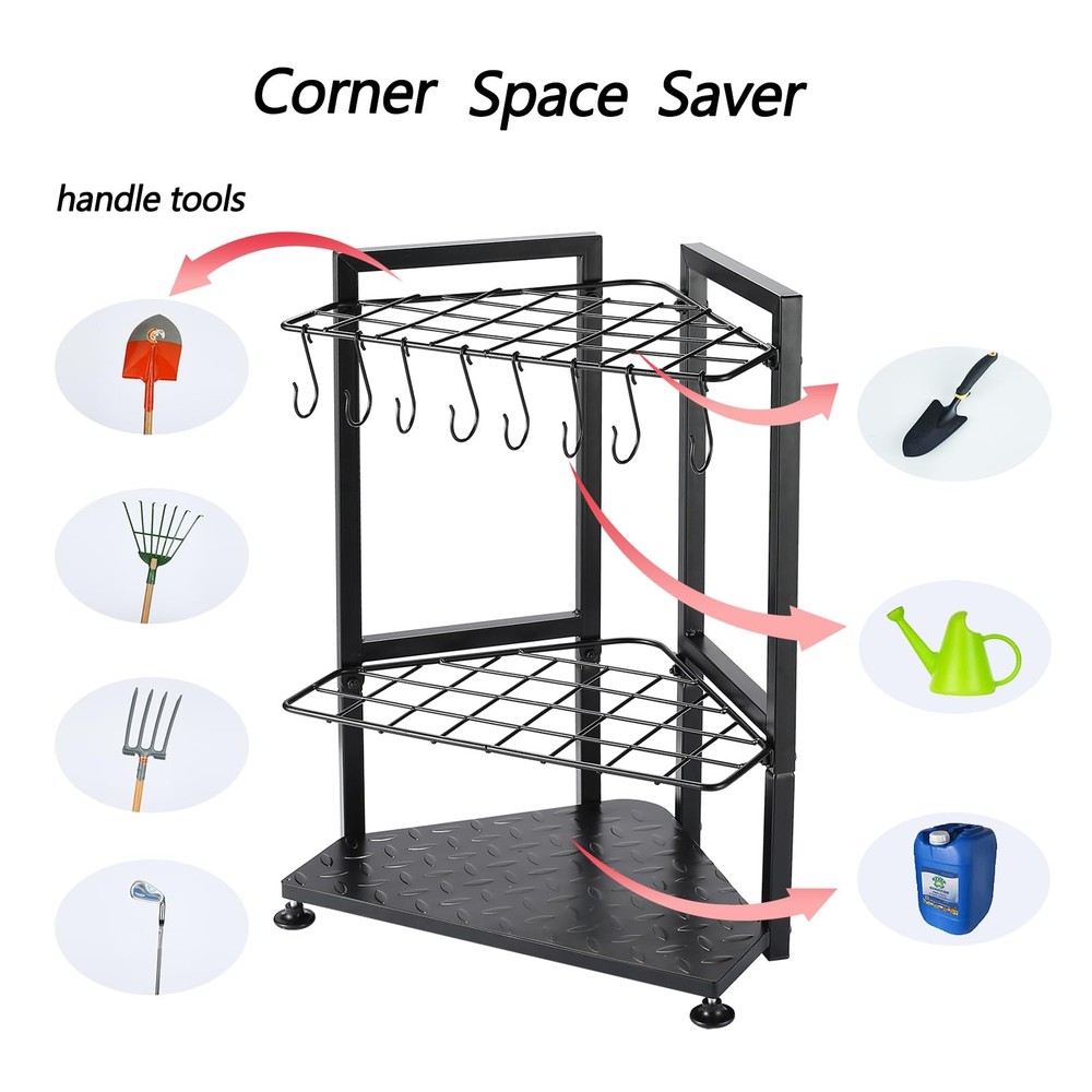 Garden Tool Organizer Heavy Duty,Yard Tool Tower Rack 【Big capacity】Our garden tool organizer designed 31 grids to hold handle tools like shovel, rake, mop, broom and cleaning supplies.1 big triangular to store scissor,shear,8 pc removable hooks to hang the small lawn tools, you can store most of your yard tools with this garden tool storage rack. 【Corner space saver】Designed with suitable size,the corner garage tool organizer only need a small footprint,we can find several garage corner to put the tool rack and storage all of your mess garage tools.As the surface is dealt with water-proof,so it can be put outside at garden, shed, farm and backyard also. 【“Head light and feet heavy” construction】The stability of garden tool caddy for storage and one-hand using is very import,so we use 1.0 bold leg pipe and 0.6 thickened baseboard and replace wheels to adjustable pads,all the ways to ensure the stability and make it more heavy duty. 【Free standing&Easy Assemble】The free stand tools storage organizer is no mount or no drill to the wall,you can put the shed organizer at any corner.With product expansion chart and detailed instruction,you can assemble it very easy. 【Heavy duty】Made of all solid metal,the garden tool rack can hold up to 60lb each hole.garage organization system is always made to last,it support to lifetime use.so not only the material,the construction,but the detail craft,including welding,paint,all of them is attentive and professional.