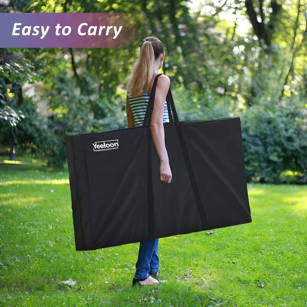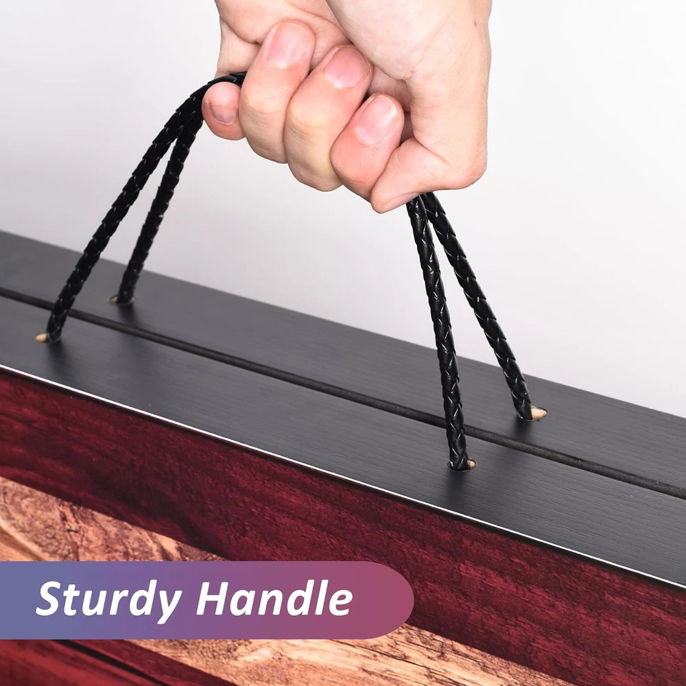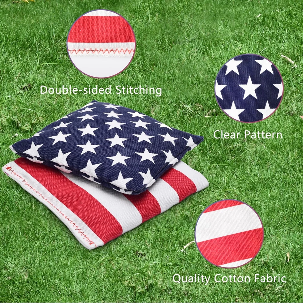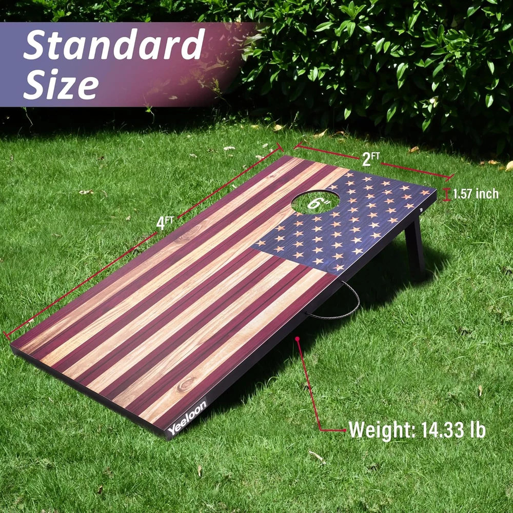 [Value Pack] - The cornhole board set includes 2 premium quality 4 feet x 2 feet regulation corn hole boards, 8 all-weather bean bags, 1 scoreboard, 1 portable carrying case and instructions. When not in use, you can use the provided carrying case to easy store the set, avoid prolonged exposure to outdoor environments, especially on rainy days, this will better protect the board to last longer [Upgraded Boards] - Our professional 4x2 cornhole boards are made of high quality MDF, and thicken the legs and frame, durable for play and lightweight for portability. What's more, We put stickers on the front and back of the wooden corn hole board and reinforced it with nails to protect the board better [Sturdy Construction] - In order to provide a better playing experience, all official cornhole sets added extra wooden strips on the back of the board as support, and added anti-vibration gaskets to the bottom of legs, the double protection can better resist the impact of the bean bag during play games and family tournaments [Easy Carrying] - The foldable legs of the corn hole game toss board are very easy to set up and helpful for saving space when storage. The reinforced lifting handles on the side of the boards can help you easily carry the boards up. We also provide a black storage bag for storage when not in use [All Weather Bean Bags] - Each plain wood cornhole set comes with 8 regulation size cornhole bags (4 of each color). Made with heavy duty duck canvas and double stitched for extra durability, keeps your bean bags in great shape after every toss games [Enjoy Outdoor Games] - This corn holes outdoor game is a great partner for your BBQ gathering, beach party, holiday party, and so on. And it's also a pretty good gift for your friends, get your family and friends up to enjoy the sport - bags toss game! Product Description The video showcases the product in use. The video guides you through product setup. The video compares multiple products. The video shows the product being unpacked. Rulers for two teams of two players each How to play cornhole? Let's go over the rules of the cornhole game, which applies to 2 teams with either 1 or 2 players! As you learn the rules of the game, I'm sure you'll gradually discover the joys of this game! Can't wait to get outside with family and friends for this fun sport!