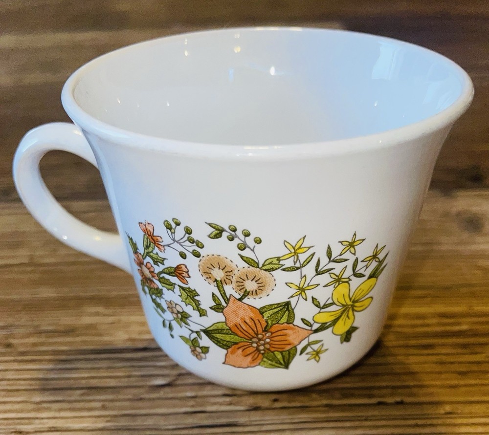 Corning Floral Orange, Green And Yellow Coffee Cup. Used but good condition.