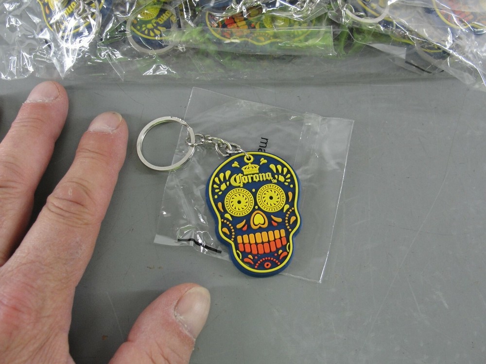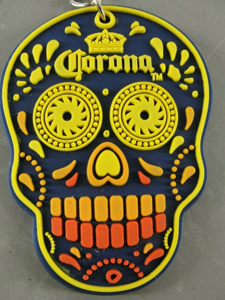 Type:Decorated Sugar SkullCountry/Region of Manufacture:ChinaMaterial:SteelModified Item:NoSize:2" long ( 4" with chain and ring)Theme:Breweriana, BeerBrand:Corona BeerColor:Multi-coloredItem:Novelty keychain charm