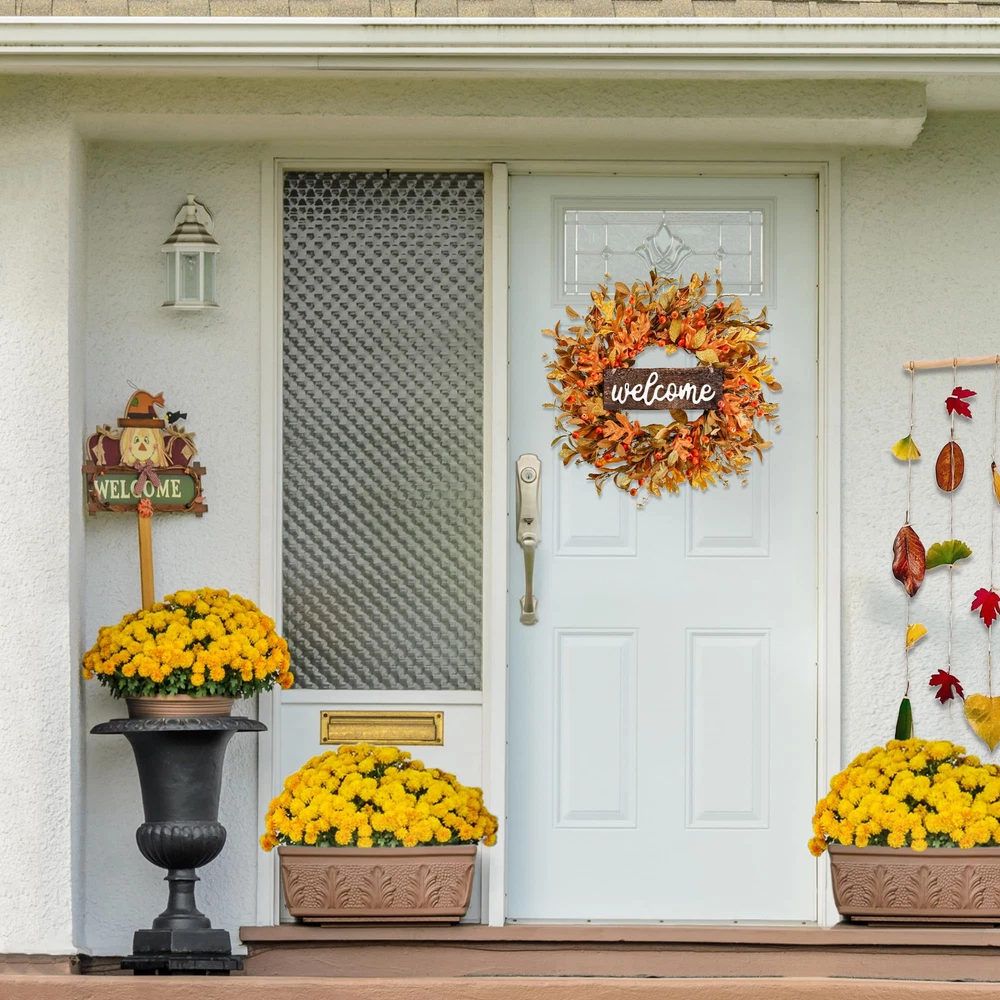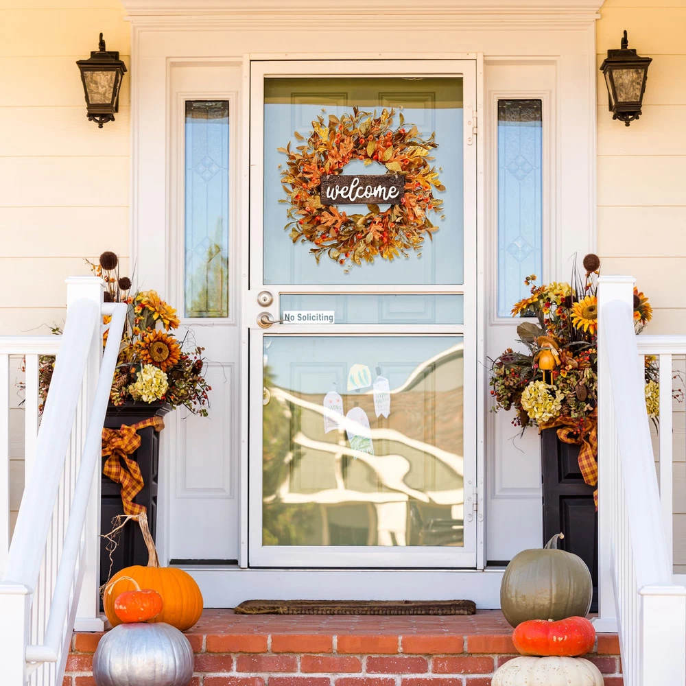 Product specification: Materials: foam and silk Size: Outer diameter: 18’’ Color: Orange Application:front door, wall, indoors,outdoors,window,fireplace,farmhouse, living room, porch, centerpiece party, wedding, holiday and autumn, Thanksgiving, fall festival celebration, etc. Features: This Harvest wreath has a longer compared to the real , the shape and color will stay fresh even a few years later, no need to water or sunlight. This autumn leaves wreath can be used as a gift for front door, wall, indoors,outdoors,window,fireplace,farmhouse, porch, wedding, holiday and autumn, Thanksgiving, fall festival,etc. This handmade fall wreath has special design, made of foam with purely manual process. The appearance of the wreath is very natural, just like the real . Warm Notice: The wreath looks so small, not as described. 1.The wreath may be squeezed during transportation. The size is actually measured after fluffing, they will reach the size as described. Please shape it according to our picture instruction before hanging. What if the leaves fall off? 2. Due to fully hand-made, it is normal if some small item or leaves fall off, it does not affect the overall image of the wreath. You can use the glue and manually stick the flower to the original place. Can it be used outdoors? 3.If used outdoors, please make sure to hang it under the cover to avoid rain and snow. Are the color exactly the same as the picture? 4.All of our picture are actually shoot, we try our best to revert the real color for customer. Due to the shooting light and screen display, slightly color differences may exist. Package Included: 1×Fall wreath in a box 1×Wooden welcome sign [HIGH QUALITY WREATH]: This artificial fall wreath is made of small size pumpkins,autumn leaves,cluster of berries full of rich texture. The entirely realistic wreath is vivid and vibrant. [PROPER SIZE]: 18 inches after fluffing. Since the wreath is packed in a relatively small box to satisfy transportation requirement, you need to expand the branches and adjust the leaves into best shape and you'll get a 18 inch full wreath of enough size. We provide you with 1 double sided sticky hook to help you hang on the door. [VERSATILE DECOR]:This autumn front door wreath is suitable for front door, wall, indoors,outdoors,window,fireplace,farmhouse, living room, porch, centerpiece party, wedding, holiday and autumn, Thanksgiving, fall festival celebration. It will provide your home a strong atmosphere, warm and elegant. [EASY CLEAN]: This Harvest wreath is convenient to clean, just wipe it with a try towel to make the wreath like brand new. The pumpkins and leaves are not easily falling apart. This wreath can be used for a long time. [NOTES]: If used outdoors, please make sure to hang it under the cover to avoid rain and snow. Please don’t hesitate to us if you have any questions, we will try our best to help you!