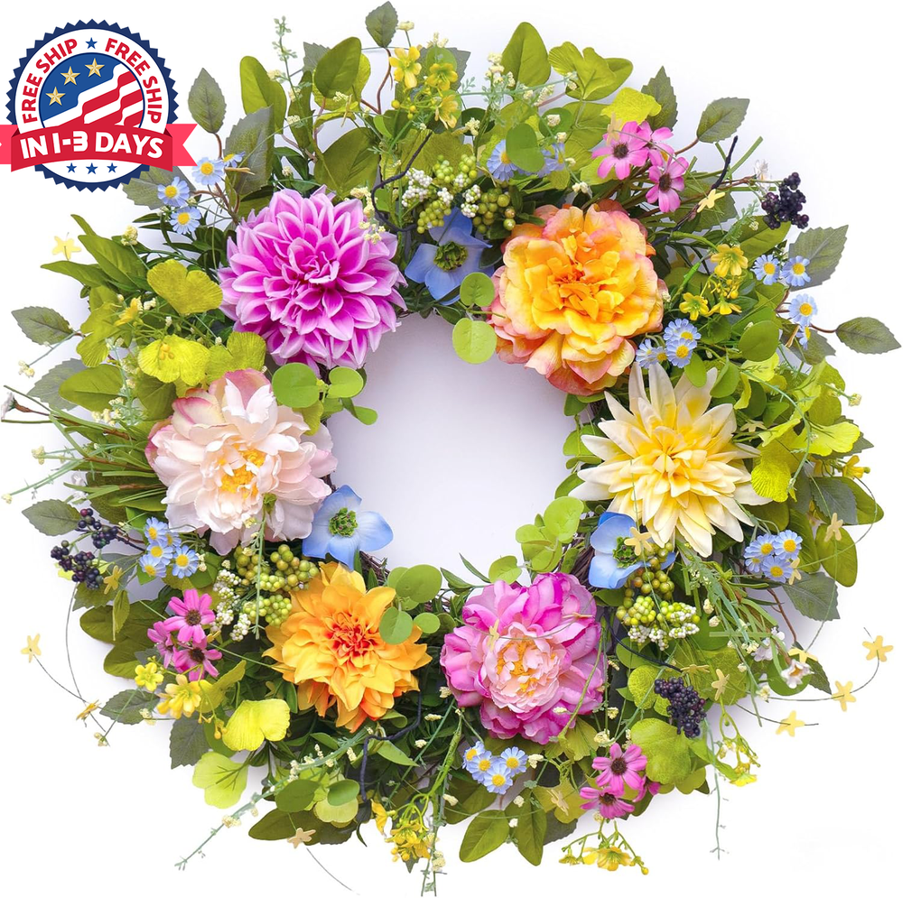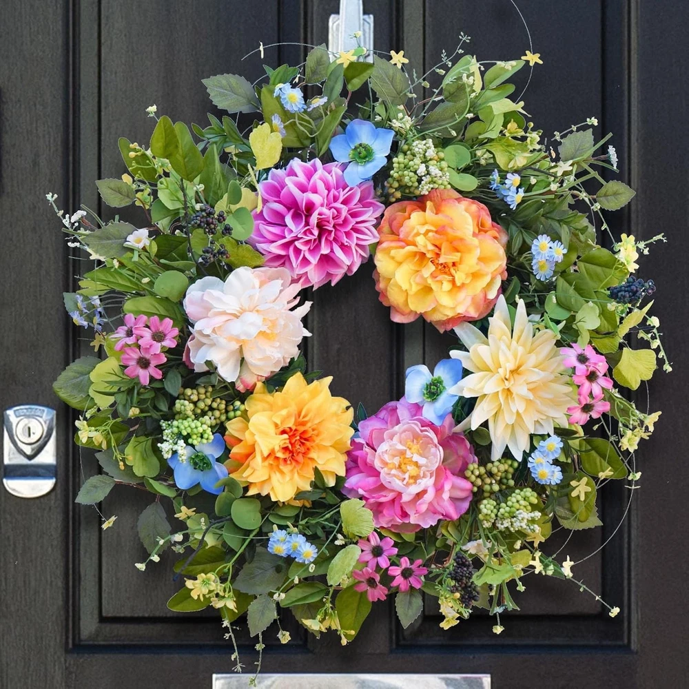 Coronas de verano para exteriores para la puerta principal con peonías y dalias Impresionante corona: la corona de primavera de Soomeir es una obra maestra hecha por diseñadores florales profesionales, con dalias vibrantes, peonías y una mezcla de exuberante vegetación artificial. Sus colores vivos son la manera perfecta de hacer que tu hogar destaque en el vecindario. Belleza llamativa: prepárate para sorprenderte con la plenitud y elegancia de esta corona de peonía de primavera y verano. La vegetación realista y las elegantes flores crean un ambiente fresco y natural. Ya sea que se muestre en tu puerta delantera, sala de estar, chimenea, armarios, paredes, ventanas, escalera o balcón, o se utiliza como centro de mesa, esta corona complementa cualquier estilo de decoración del hogar durante todo el año. Duradera y resistente: la corona de primavera y verano para puerta delantera hecha de flores de seda artificial está hecha a mano y las flores están unidas de forma segura a una base de enredadera. Es ligero y fácil de colgar en un típico colgador de corona. Incluso con el uso a largo plazo al aire libre, no hay necesidad de preocuparse por la decoloración o deformación de la corona. Tamaño perfecto: el ancho diagonal de la corona de primavera para puerta debe ser de 22 pulgadas, y su profundidad debe ser de 5 a 6 pulgadas. Debido a razones de envío, hemos empaquetado la corona en una caja más pequeña. Ajusta la corona de acuerdo con las instrucciones de la tarjeta antes de colgarla, y obtendrás una corona completa y hermosa Listo para usar: trae la frescura de la primavera a tu hogar en solo 2-3 minutos. Simplemente esponja la corona para restaurar su aspecto vibrante y completo. Viene en una caja de embalaje premium para un fácil transporte y almacenamiento, por lo que es un regalo maravilloso para cualquier ocasión.