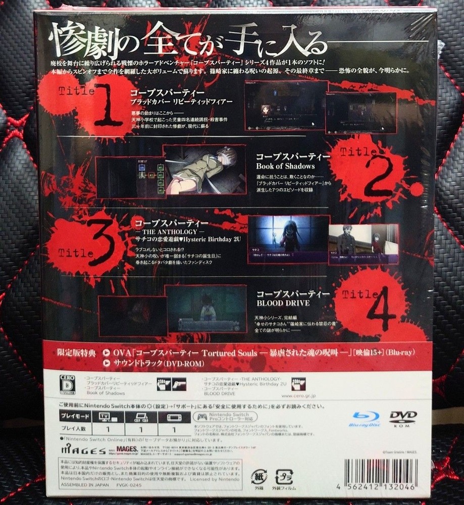 * Description All my products are 100% Authentic. Please feel free to contact us if you have any question. 🌙✨ TETRALOGY PACK Limited Edition Features ✨🌙 ✨ A deluxe complete edition featuring all 4 titles Experience the full range of terror, mystery, and emotion from the series. 🎬 Includes OVA ‘Tortured Souls’ on Blu-ray Experience “Another Corpse” with the unique intensity and brutal depictions only possible in animation. 🎵 Includes Soundtrack (DVD-ROM) Features all the memorable tracks that enhanced the immersion of the main story, captured in high-quality audio. 🎮 Comfortable Controls Unique to Switch Whether in Handheld Mode or TV Mode, immersion into the world is unparalleled. 📚 Exclusive Value Only in the Limited Edition With the game, OVA, and OST all included, this set offers exceptional collectible value. 🎁 Luxurious Packaging Perfect for Gifts The striking package design delivers a “complete collection” that fans will adore. ⭐ **The Ultimate Corpse Party Experience Completely Complete in This One Box.** ⭐ * Shipping We ship using FedEx, DHL and Japan Post. * Payment We usually ship within 5~10 business days of receiving cleared payment. * International Buyers - Please Note: Import duties, taxes and charges are not included in the item price or shipping charges.These charges are the buyers responsibility.Please check with your countrys customs office to determine what these additional costs will be prior to bidding/buying. These charges are normally collected by the delivering freight (shipping) company or when you pick the item up do not confuse them for additional shipping charges. I do not mark merchandise values below value or mark items as "gifts" - US and International government regulations prohibit such behavior.