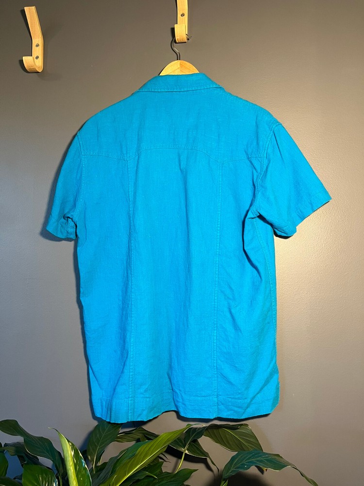 Original Price: $165 This is a Corridor NY men's shirt in size M, featuring a retro design in a teal blue color. The shirt is a button-up style with four pockets, adding a practical element to its vintage-inspired aesthetic. The slub indigo fabric gives it a textured appearance, perfect for adding a unique touch to a casual outfit.
