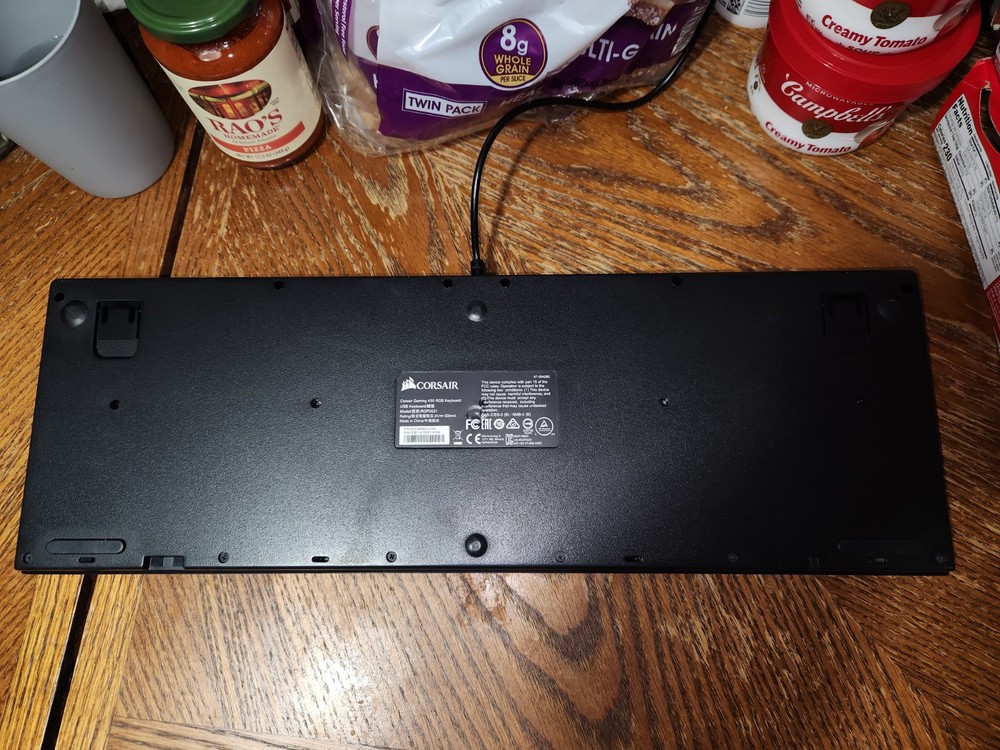The Corsair K55 RGB Gaming Keyboard is a clean and sleek black model that offers a low profile design for comfortable typing. It features illuminated keys for easy use in dimly lit environments and a detachable palm/wrist rest for added comfort during long gaming sessions. This keyboard is wired and connects via USB 2.0. The model number is CORSAIR K60 RGB PRO and it was manufactured in China.