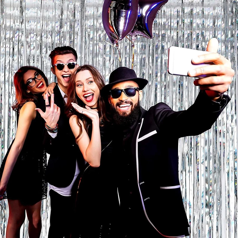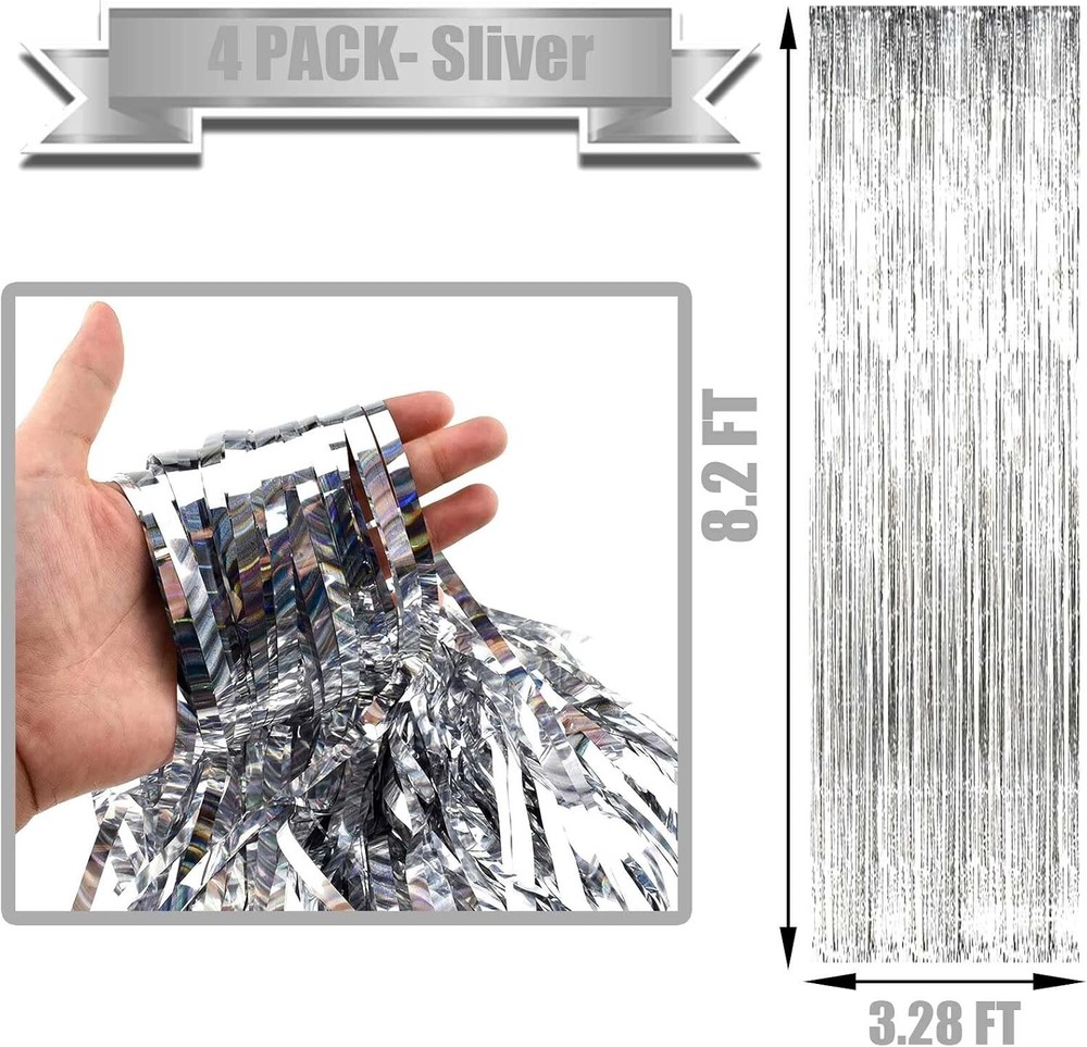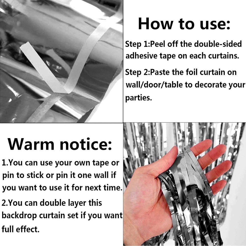 Cortinas y serpentinas con flecos de papel de oropel de 3,28 x 8,2 pies NUEVO US Las últimas cortinas de papel de aluminio con destellos láser: la cortina de fondo metálica hecha de papel de aluminio con destellos láser es más brillante y hermosa, de alta calidad y no se decolora fácilmente. El tamaño de cada cortina de flecos de papel de aluminio metálico es de 3,2 pies de ancho y 8 pies de largo, el paquete incluye 4 paquetes de cortinas de flecos de papel de aluminio, adecuadas para colgar en una puerta o cubrir una pared por completo. Las cortinas de papel de aluminio son buenas para la cortina de fondo de fiesta, se colocan en una pared y sirven como fondo para fotos de cualquier celebración como: fiesta de cumpleaños, fiesta temática, Halloween, Navidad, Nochevieja, despedida de soltera, boda, despedida de soltera, baby showers, graduaciones y más. Péguelas o cuélguelas en superficies lisas, no se necesita mucho esfuerzo para pegarlas, solo cuélguelas y péguelas suavemente para que sea más fácil quitarlas, cuando termine la fiesta. Hay cinta adhesiva de doble cara ya fijada en la parte posterior de ellas. Simplemente despegue la tira de plástico y cuélguela. Se adhiere muy bien, así que tenga en cuenta en qué superficie la está colocando. Ofrécele a tus amigos y familiares una entrada de "alfombra roja" mientras se pavonean a través de la puerta turquesa y se toman una fotografía frente a un brillante fondo de fotomatón. Cortinas. Júntalas para un fondo de gran tamaño o duplícalas para obtener más brillo. ¡Decoración fácil de hacer tú mismo!