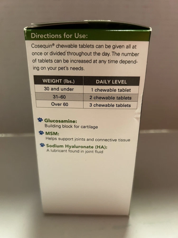 MPN: 01.1202.03 Purpose: Hip & Joint Health Dog Size: XXS, XXL, XS, XL, L, M, S Model: 1000024760 Expiration Date: 12/2024 gtin13: 0755970407372 UPC: 0755970407372 Country/Region of Manufacture: United States Brand: Cosequin Formulation: Chewable Tablet