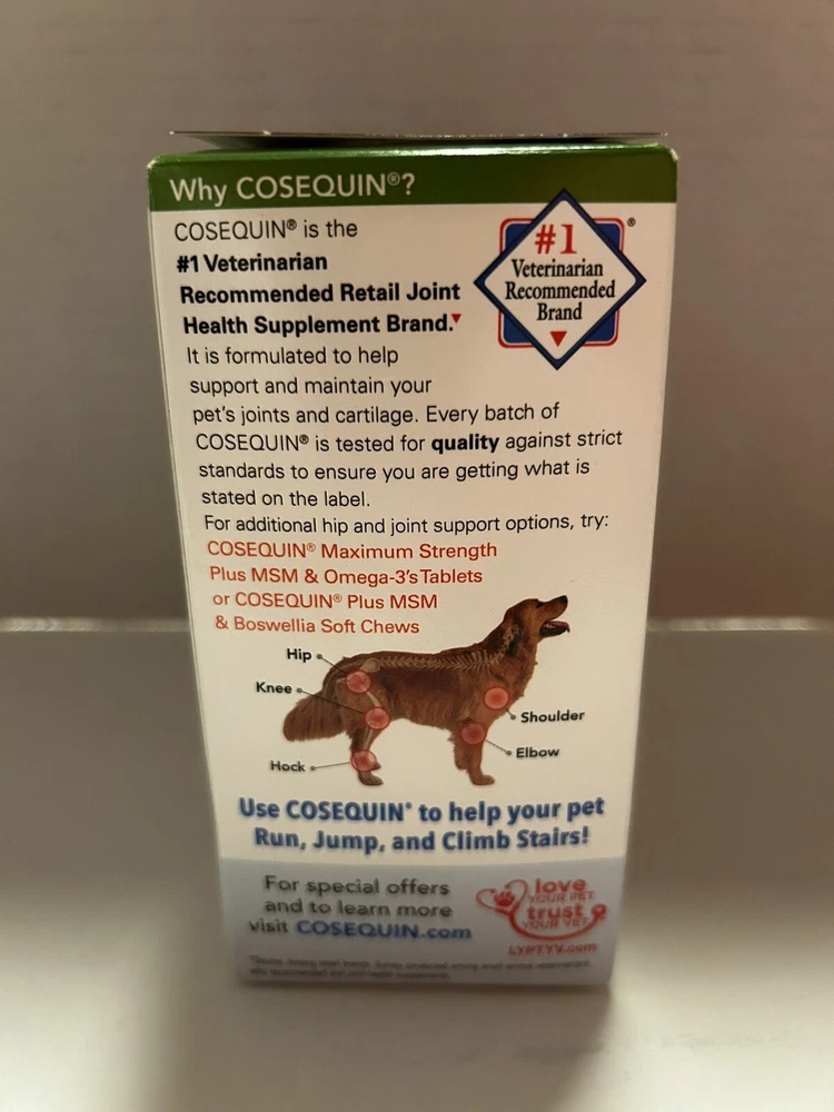 Enhance your furry friend's hip and joint health with Cosequin Joint Health Supplement. These tasty and chewable tablets are specially formulated to promote joint mobility and comfort. The supplement is suitable for dogs of all sizes, from XXS to XXL, and comes with an expiration date of 12/2024. Made in the United States, this joint health supplement is a must-have for pet owners who want to ensure their dog's optimal health. The Cosequin brand is known for its quality products, and this supplement is no exception. With its unique formulation and purpose, it is sure to give your dog the mobility and comfort they deserve. This product comes from a smoke free, kid free home. The product is brand new, never used, still in original packaging.