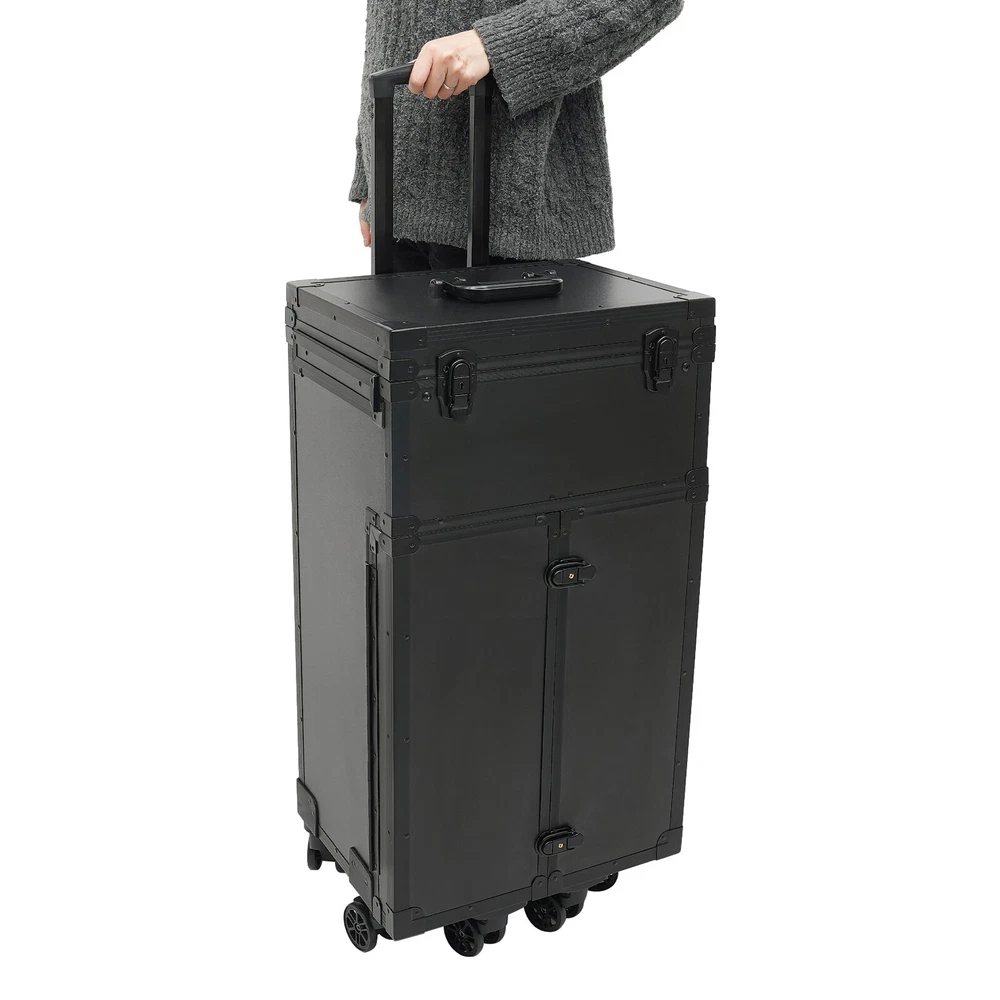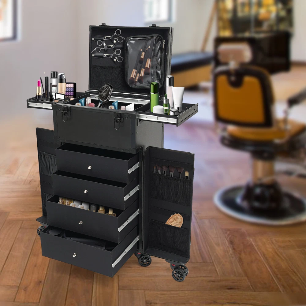 Cosmetic Suitcase Beauty Facial Storage Makeup Travel Box Salon Trolley Cart Rolling Makeup Case, Makeup Organizer Travel Case, Professional Makeup Case+6Wheels&Drawers Description Whether you're working or traveling, a professional makeup case will be a great convenience. This makeup case is made of high-quality aluminum alloy and ABS that is strong and durable. The top scissor groove and a small bag, the middle movable partition, the storage box under the partition, the lower 4 pull-out drawers, and side door pockets allow you to sort and store items. The strong load-bearing capacity allows you to store items with confidence. In short, it is the ideal choice for professional makeup artists and beauticians. Key Features Premium Materials: This product is made of high-quality aluminum alloy and ABS, which is corrosion-resistant, wear-resistant , and durable , ensuring your long-term use. Classified Storage: The top scissor groove and a small bag can be used to store accessories, and the middle movable partition can be used to store styling tools. The storage box under the partition can be used to store nail polish, lipstick, brush, or hair remover(all are not included). The lower 4 pull-out drawers can be used to store sprays, curlers, hair dryers (all are not included), or other supplies. The side door pockets can be used to store eye black, eyeliner pens, and combs(all are not included), making your items neat and orderly. Thoughtful Design: Three adjustable rod lengths allow you to freely adjust the rod length, while also being suitable for people of different heights. In addition, the detachable universal wheels enable you to replace them conveniently when damaged, which is easy and cost-efficient. Strong Load-bearing Capacity: This product can bear a weight of 66.14 lbs , allowing you to use it with confidence without worrying about damage due to excessive items. High Practicality: It can be used as a beauty table, allowing you to do beauty work anytime, anywhere. Protect Your Privacy: The safety buckle can protect valuable items inside your box and maximize your privacy. Generous Appearance: The black color scheme, rectangular shape, and smooth lines give this product a generous appearance, nicely decorating your dressing room. Excellent Gift: Its exquisite design and large capacity make this product a great gift to your mother, girlfriend, sisters, wife, and loved ones so that they can enjoy more convenient makeup time. Protective Packaging: The sponge s can better protect your product during transportation and make it delivered to you completely to the greatest extent. Details Durable Handle: The ergonomically designed handle can relieve finger pressure and provide you with a comfortable user experience. Wide Opening: With a wide opening, it is easy for you to store and retrieve certain items without messing up other items in the box. Clear Storage Bag: It is effective against dust and water and easy to search for the contents. Universal Wheels: The bottom 6 universal wheels allow you to easily move this product. Application It is recommended for make-up artists from beginners to professionals such as freelance make-up artists, wedding make-up artists, celebrity make-up artists, and make-up interns. It can also be used for traveling or kept at home for makeup enthusiasts, hair barbers/stylists, nail technicians, estheticians, embroiderers, and crafters. Specification Color: Black Shape: Rectangular Style: Modern Material: Aluminum Alloy, ABS Assembly Required: Yes Single Side Partition Size: 20*22cm/7.87*8.66in Case Door Size(L * H): 20*49cm/7.87*19.3in Overall Product Size: 40*30*80cm/15.75*11.81*31.5in Load-bearing Capacity: 30kg/66.14lbs Gross Weight: 10kg/22.05lbs Net Weight: 9kg/19.84lbs Package Size: 83*33*45cm/32.68*13*17.72in Package Included 1* Makeup Case 6* Universal Wheels 4* Keys Notes Please note that items other than this product are not included. The service wear of the case is a normal phenomenon. In the process of daily use, please try to avoid excessive impact and drop to extend the lifespan of the product. Please use soft tools and water to clean. Please keep away from corrosive liquids. Please avoid long-term exposure to the sun. Please use this product within its carrying capacity. Please allow the slight color difference caused by the shooting light and the 1-3 cm error due to manual measurement, and make sure you do not mind before ordering. Payment Delivery details Terms of sales About us Contact us Payment We accept ebay payment 。 Fees such as import duties, taxes are not included in the item price or shipping costs. These charges are the buyer's responsibility. Delivery details Shipping: 2-9 working days to: USA Terms of sales We maintain high standards of excellence and strive for hundred percent customer satisfaction. Feedback is very important to us. We hope that you contact us immediately before you give neutral or negative feedback, so that we can address your concerns. It is impossible to address issues if we do not know about them! About us Your satis faction is our ultimate goal. We work hard to earn your trust and future business. Our certified technicians have tested each item before shipping. The unit comes with 1 year limited warranty on all manufacturing defects. a) If you receive a defective item, you may return it or ask for a discount. Please contact us within 14 days after you receive the package. b) What you returned must be intact and in its original packaging as re? u. Customer is responsible for shipping costs of the returned item. c) We will cover the cost of shipping back t with the shipping rate indicated in the registration page. We will send you a new unit or refund the full payment you paid. Thank you. Contact us Business Hour Business Hour: Monday To Friday: 8:30 AM to 5:00 PM (Beijing China time) Due to time zones, our reply to your questions may not be immediately. But within above working time, we will reply your email w