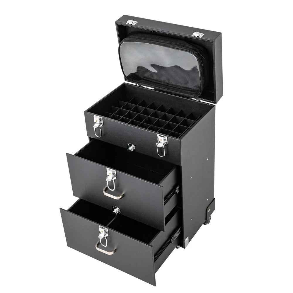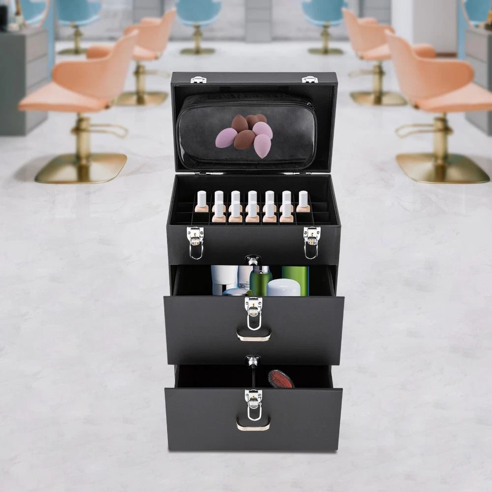 Have a nice day~ Description This is a rolling makeup train case designed for professional beauty artists to make up anytime and anywhere. It is constructed of high-quality PU, wood, PVC , and aluminum alloy that is sturdy and durable. It has extra large capacity compartments and multi-layer drawers. This case is ideal for all people who love beauty or nail art. Key Features High-quality Material: This product is made of high-qualit y PU, wood, PVC, and aluminum alloy, with c orrosion resistance , wear resistance , and not easy to fade. Categorized Storage: Three compartments and a removable grid tray allow you to organize beauty products of different functions and sizes and make it easy to find the tools you want quickly . High Privacy: Four locking cylinders securely protect your valuables inside the box and maximize your privacy. Large Capacity: One 3.54in high tray and two 6.69 high trays can store a variety of cosmetics and beauty appliances, such as perms, nail machines and light therapy supplies, its ample storage space will be able to meet your multiple storage needs. Outstanding Load Capacity: The rectangular structure gives it an excellent load capacity (up to 99 lbs). You can put all your beauty tools in it with confidence. Easy to Move and Carry: The easy-to-move silent universal wheels (two of them can be fixed), three-position telescopic trolley rod, and a top handle make it more convenient to carry on the go, especially suitable for nail technicians and cosmetologists who have a lot of tools and need to be on the go frequently. Stylish Appearance: Its simple structure and black color give people a fashionable and elegant feeling. Such a vintage makeup case can nicely decorate your dressing room and make a good impression when you go out to work. Protective Shipping: To prevent the product from being damaged during transportation as much as possible, this product uses a rigid cardboard box, plastic bag, and foam that can effectively resist normal compression and drops. Details Clear Storage Bag: The clear storage bag on the inside of the lid allows for wet and dry storage and avoids cross-contamination. In addition, the double zipper design not only makes it easier to open and close, but also gives it a better seal. Corner Reinforcement: The bottom corner reinforcement design makes the box structure more stable, thus providing you with more excellent quality assurance. Smooth Tracks: Smooth drawer tracks make the drawing smoother and less noisy. Ergonomic Handles: The top handle has an ergonomic four-finger structure and a slow rebound damping design, making it more comfortable to hold and less likely to break. In addition, two drawer handles make it easy to pull out the drawer. Application This rolling makeup train case is suitable for professional make-up artists, hairdressers, nail technicians, and beauticians in beauty centers, salons, private homes, parties, and other occasions. Specification Material: PU, Wood, PVC, Aluminum Alloy Color: Black Shape: Rectangular Assembly Required: No Opening Method: Latch Carrying Parts: Retractable Handle Rolling Wheel Style: Universal Wheel Number of Trays: 3 Maximum Load: 45kg/99lbs Gross Weight: 9.2kg/ 20.28 lbs Net Weight: 8kg/ 17.64 lbs Package Size: 42*34*64 cm/ 16.54* 13.39*25.2 in Footprint: 36*23cm/14.17*9.05in Top Cover Height from Ground: 49cm/19.29in Top Cover Size: 29*23*5cm/11.4*9.05*1.97in Telescopic Rod Extension Height from Case: 45cm/17.72in First Tier Height: 9cm/3.54in Second Tier Height: 17cm/6.69in Third Tier Height: 17cm/6.69in Package Included 1 * Rolling Makeup Train Case 2 * Keys Notes It's normal for the tie rod to wobble a little bit as it needs clearance to move back and forth better. If it is too tight, it will harm the tie rod instead. Please make sure you don't mind before purchasing. Please allow the slight color difference caused by the shooting light and the 1-3 cm error due to manual measurement, and make sure you do not mind before ordering. Payment Delivery details Terms of sales About us Contact us Payment We accept ebay payment 。 Fees such as import duties, taxes are not included in the item price or shipping costs. These charges are the buyer's responsibility. Delivery details Shipping: 2-9 working days to: USA Terms of sales We maintain high standards of excellence and strive for hundred percent customer satisfaction. Feedback is very important to us. We hope that you contact us immediately before you give neutral or negative feedback, so that we can address your concerns. It is impossible to address issues if we do not know about them! About us Your satis faction is our ultimate goal. We work hard to earn your trust and future business. Our certified technicians have tested each item before shipping. The unit comes with 1 year limited warranty on all manufacturing defects. a) If you receive a defective item, you may return it or ask for a discount. Please contact us within 14 days after you receive the package. b) What you returned must be intact and in its original packaging as re? u. Customer is responsible for shipping costs of the returned item. c) We will cover the cost of shipping back t with the shipping rate indicated in the registration page. We will send you a new unit or refund the full payment you paid. Thank you. Contact us Business Hour Business Hour: Monday To Friday: 8:30 AM to 5:00 PM (Beijing China time) Due to time zones, our reply to your questions may not be immediately. But within above working time, we will reply your email within 24 hours. If it's non-workdays, please kindly be patient and wait till Monday. Please contact us with ebay message. Please feel free to contact us if you have any questions. Monday To Friday: 8:30 AM to 5:00 PM (Beijing China time) Due to time zones, our reply to your questions may not be immediately. But within above working time, we will reply your email within 24 hours. If it's non-workdays, please kindly be patient and wait till Monday.