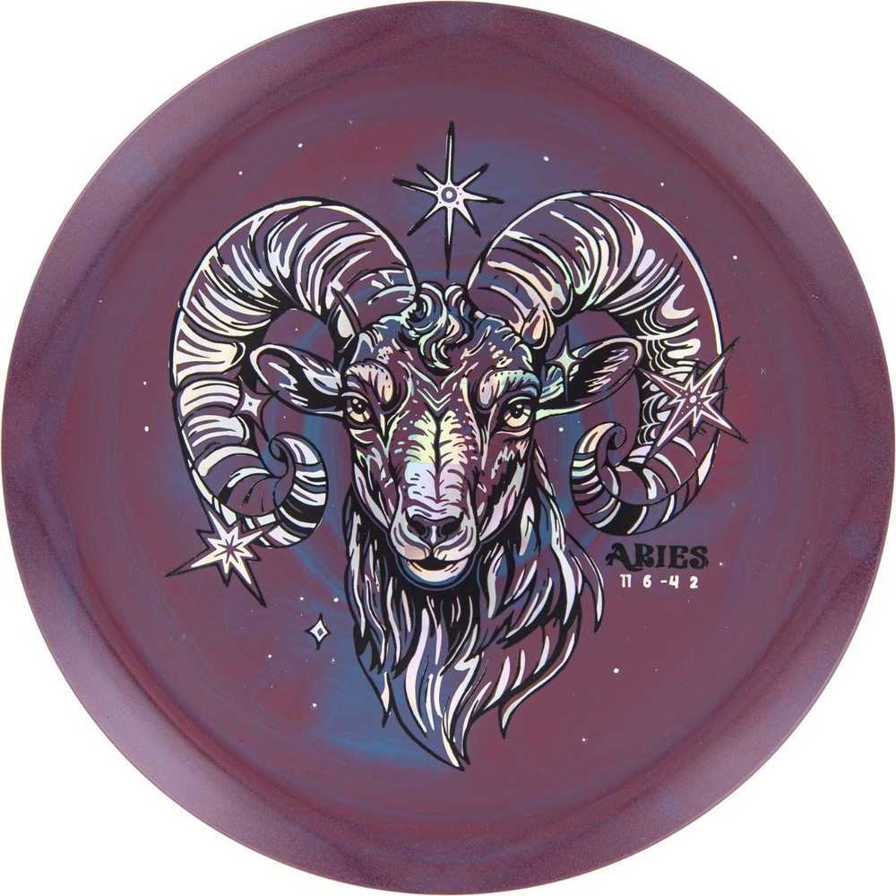 The Millennium Cosmic Ram Swirly Sirius Aries can unlock big distance for low to average powered players. That, plus its bold, two-color stamp, will make this understable distance gainer a real favorite. How These Sirius Aries Feel Minimal to noticeable dome. Plenty of grip here . Get To Know The Aries The Aries is described as stabilized Mamba. That’s good news for players who love the Mamba’s incredibly easy turn, but would like a touch more stability for even longer drives. Throwing this disc will result in long, smooth turns with a moderate check at flight’s end. The Specs Artist: Tony Diaz (2 Color Foil) Flight Numbers : 11 | 6 | -4 | 2 Disc Type : Distance Driver Stability : Understable Plastic Type : Swirly Sirius (Star) Best Shot Types : Turnovers, Uphill drives, Tailwinds, Super big S Lines Artwork Spotlight This XXL two-foil stamp by Tony Diaz features a bold Aries ram theme, drawing from the familiar Aries astrology symbol. The large-format design fills the flight plate, making the swirling Sirius plastic background pop, thus giving each disc a unique, eye-catching look. Why It Belongs In Your Bag If you want a distance driver that will turn but not burn, the Aries with its striking XXL ram artwork, is worth a shot.