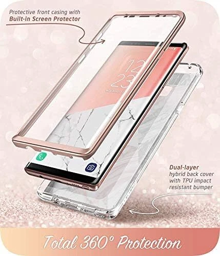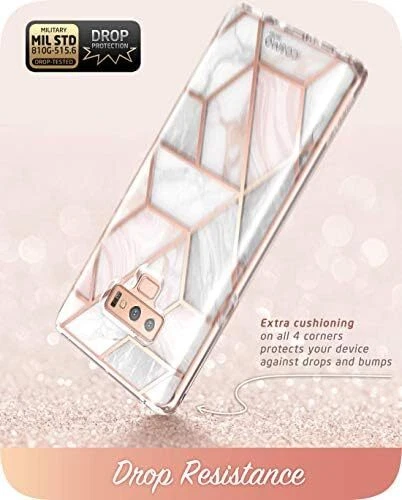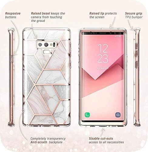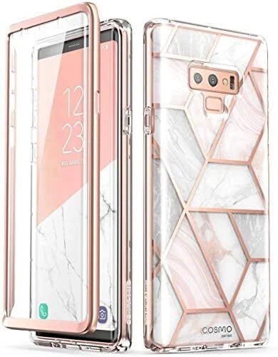 Cosmo Full-Body Bumper Protective Case for Galaxy Note 9 2018 Release, Marble 360-degree coverage features a shock-absorbent TPU bumper and scratch-resistant polycarbonate back plate,Front cover includes a touch sensitive built-in screen protector that helps prevents scratches and cracks.Easy access to ports and stylus,Cushioned corners provide augmented protection for accidental drops and falls,Fingerprint-resistant case features stylish detailing and a distinctive background that showcases the look of your device,Compatible with Galaxy Note 9 (2018 Release) Only