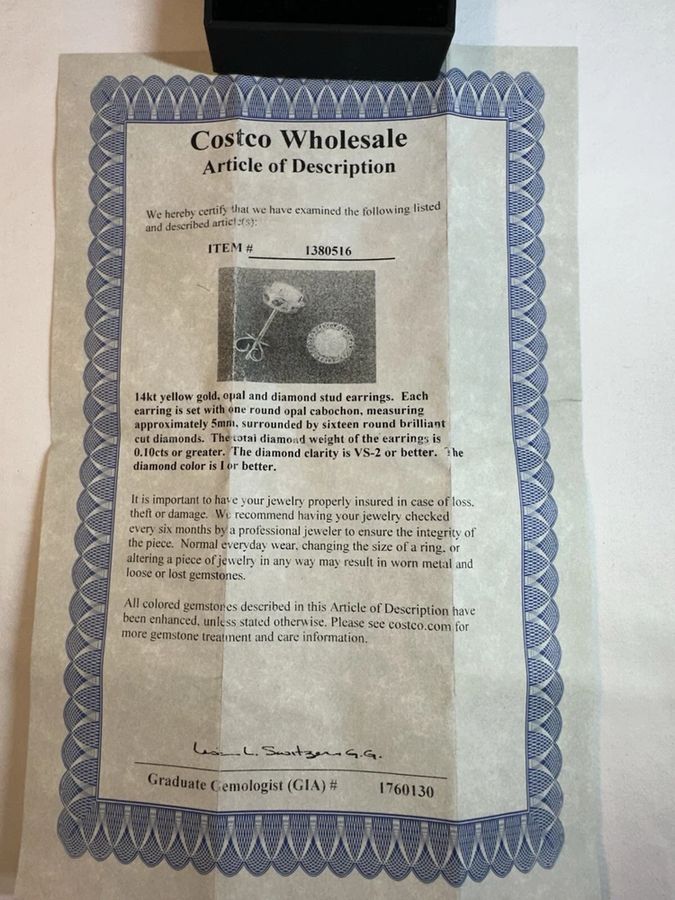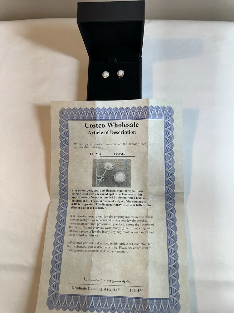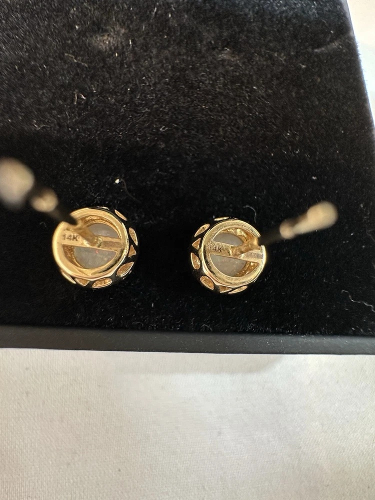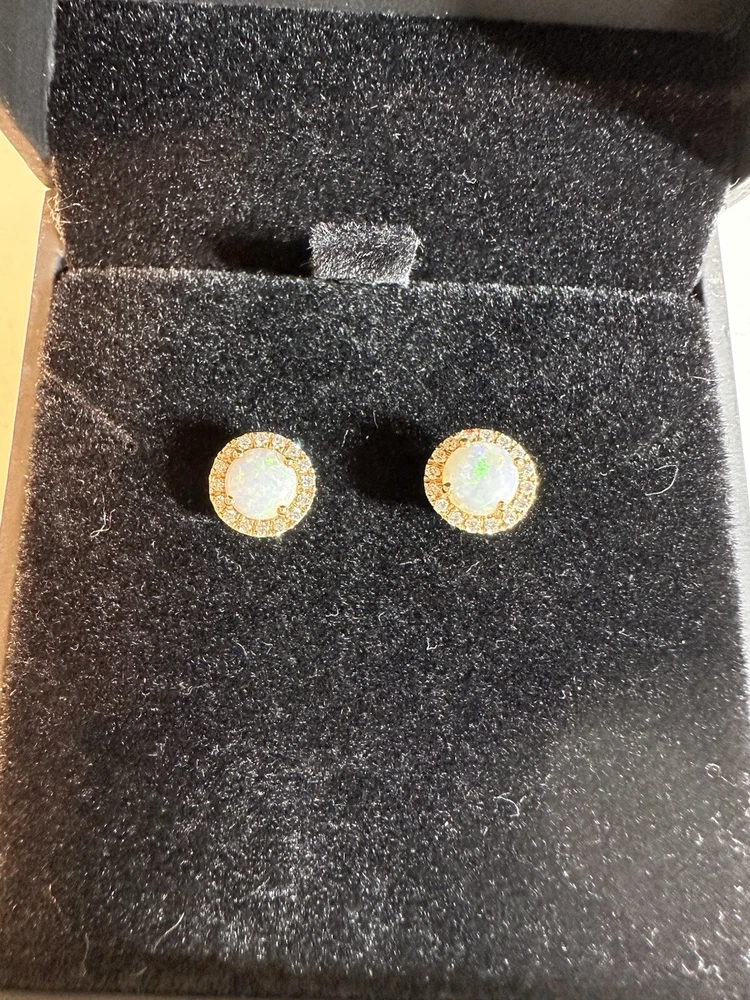 These stunning stud opal and diamond earrings come from Costco Wholesale. Crafted from 14k gold, these earrings feature a beautiful opal cabochon stone measuring approximately 5mm, surrounded by 16 round brilliant cut diamonds. The total diamond weight is 0.10cts. The diamond clarity is certified as VS-2 or better. The earrings come with a Costco Wholesale Article of Description. See the included certificate for more details on the stones and their specifications. These earrings currently retail for $369.99. Box shown not included *****