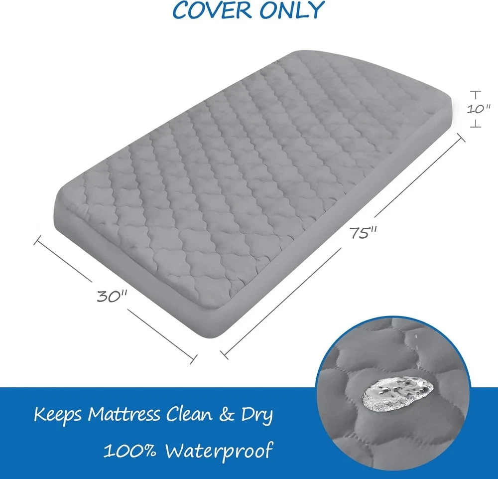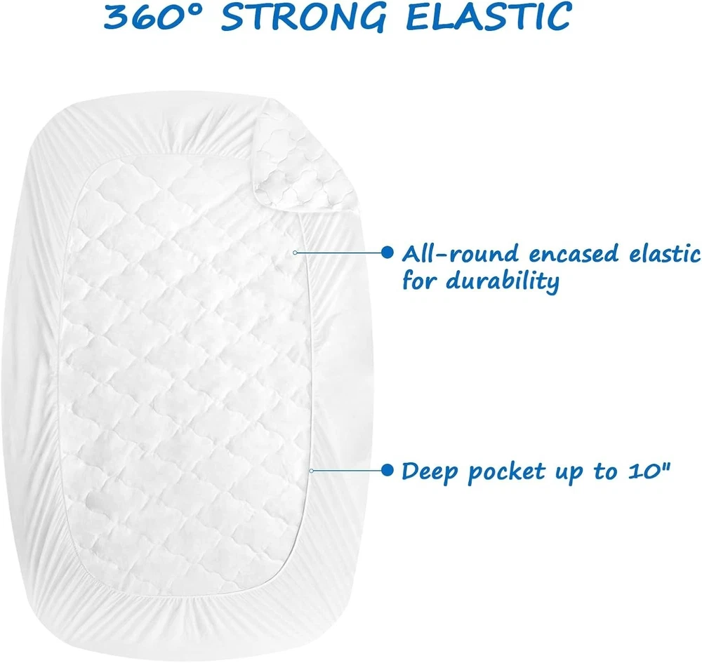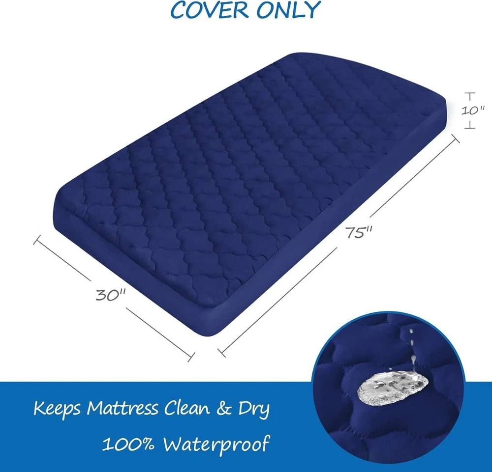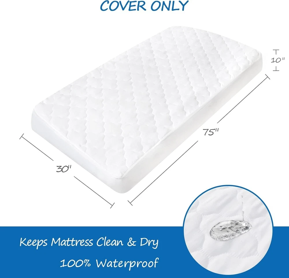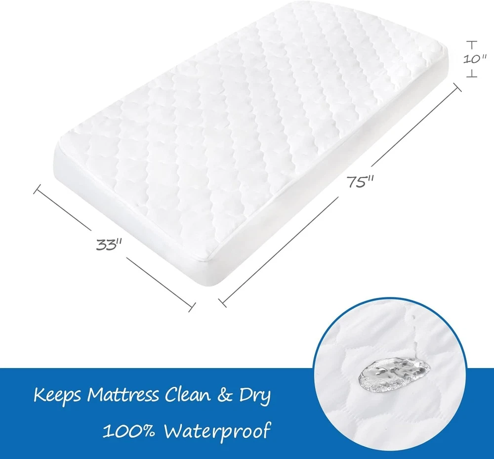 Product description Waterproof & Absorbent: Our cot mattress pad has added an unharmful TPU layer, which provides waterproof function. The top of the cot mattress cover is highly absorbent, to provide for a comfortable night's sleep, while protecting your cot mattress. Ultra Soft & Breathable: Our cot size mattress pad are thoughtfully designed using high-quality quilted microfiber, which is breathable, stretchy and silky soft, friendly to kid’s sensitive skin, providing your little ones a safe and comfy sleeping environment. Perfect Snug Fit: Measuring 30" x 75", our waterproof cot mattress pad fit up to kid’s sleepaway camp, camping cot and RV bunk beds. Deep pockets make sure the cot mattress pad cover universal fits up to 10 inch deep perfect for "Narrow Twin" size mattresses, compatible with Milliard Folding Mattress Cot Size. Stretchable: Each quilted cot mattress cover comes with an elastic band encased at the bottom ensures a tight, secure fit the cot mattress pad won’t ride up or move around in middle of the night, staying smooth and snug. Satisfaction Guarantee: We truly believe in our cot mattress pad protector and work hard to provide top notch customer service. If there is any problem with our cot mattress topper, please contact us and we can replace for you. Handling & Delivery We offer Free Shipping on all orders! Your order will be shipped within 2 working days after receiving payment. In an unlikely event that your order is lost or damaged in transit, it is eligible for full refund or replacement. We ship to continental US address ONLY, we are unable to ship to PO Boxes or APO/FPO addresses. Return Policy If you are not satisfied when you receive your item, please contact us for a replacement or money back. If the item is defective, we will send you a replacement without any extra charge, or offer a full refund after we receive the defective item, but return shipping should be paid by buyer. All items qualify for returns within 30 days of receipt. Returned packages must be the original package. Contact us We will respond emails within 24 hours, within 36 hours on weekend.