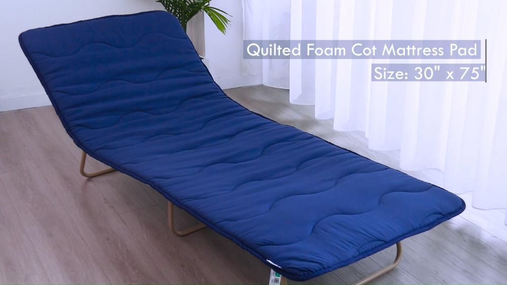 Product description Cot Mattress Pad Only Size & Package: The qulited cot mattress pad open size is 30" x 75", wider and much thicker than usual, more comfortable to use together with camping cots or lounge chaise chairs. Soft & Quilted: The camping mattress pad for sleeping are filled with reasonable amount of polyester fiber and soft sponge which offers your the support during rest, along with the right softness and comfort, too. Non-slip Bottom: The camping cot mattress pad with 4 adjustable straps at the bottom, the cot mattress topper can fit up to most camping cots and lounge chaise chairs. Our cot mattress topper with non-skid bottom design prevents moving and shifting will keep your camping cot mattress pad stay in place and avoid moving around. Multiple-uses: Easily is portable and comes with straps to tie it down after rolling it up. The cot pads for camping fit for most camping cots, including flat cots, cots with elevated head, folding cots with pillow, lounge chaise chairs also fit for any outdoor activity like traveling or car camping for family, indoor use for house guest bed, floor mattress. Satisfaction Service: We will do our best to serve you until you are satisfied. If for any reason you are not satisfied with your cot mattress topper, please tell us directly. Handling & Delivery We offer Free Shipping on all orders! Your order will be shipped within 2 working days after receiving payment. In an unlikely event that your order is lost or damaged in transit, it is eligible for full refund or replacement. We ship to continental US address ONLY, we are unable to ship to PO Boxes or APO/FPO addresses. Return Policy If you are not satisfied when you receive your item, please contact us for a replacement or money back. If the item is defective, we will send you a replacement without any extra charge, or offer a full refund after we receive the defective item, but return shipping should be paid by buyer. All items qualify for returns within 30 days of receipt. Returned packages must be the original package. Contact us We will respond emails within 24 hours, within 36 hours on weekend.