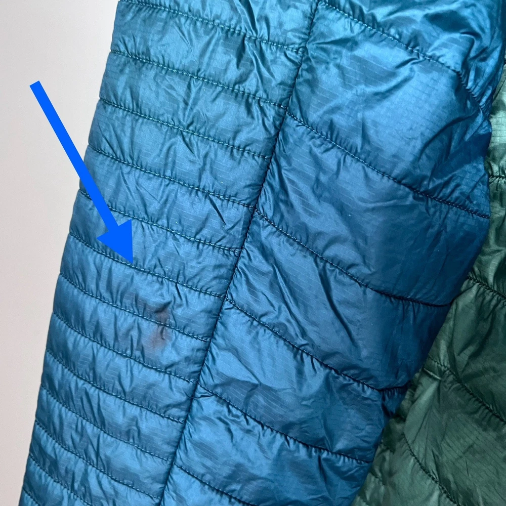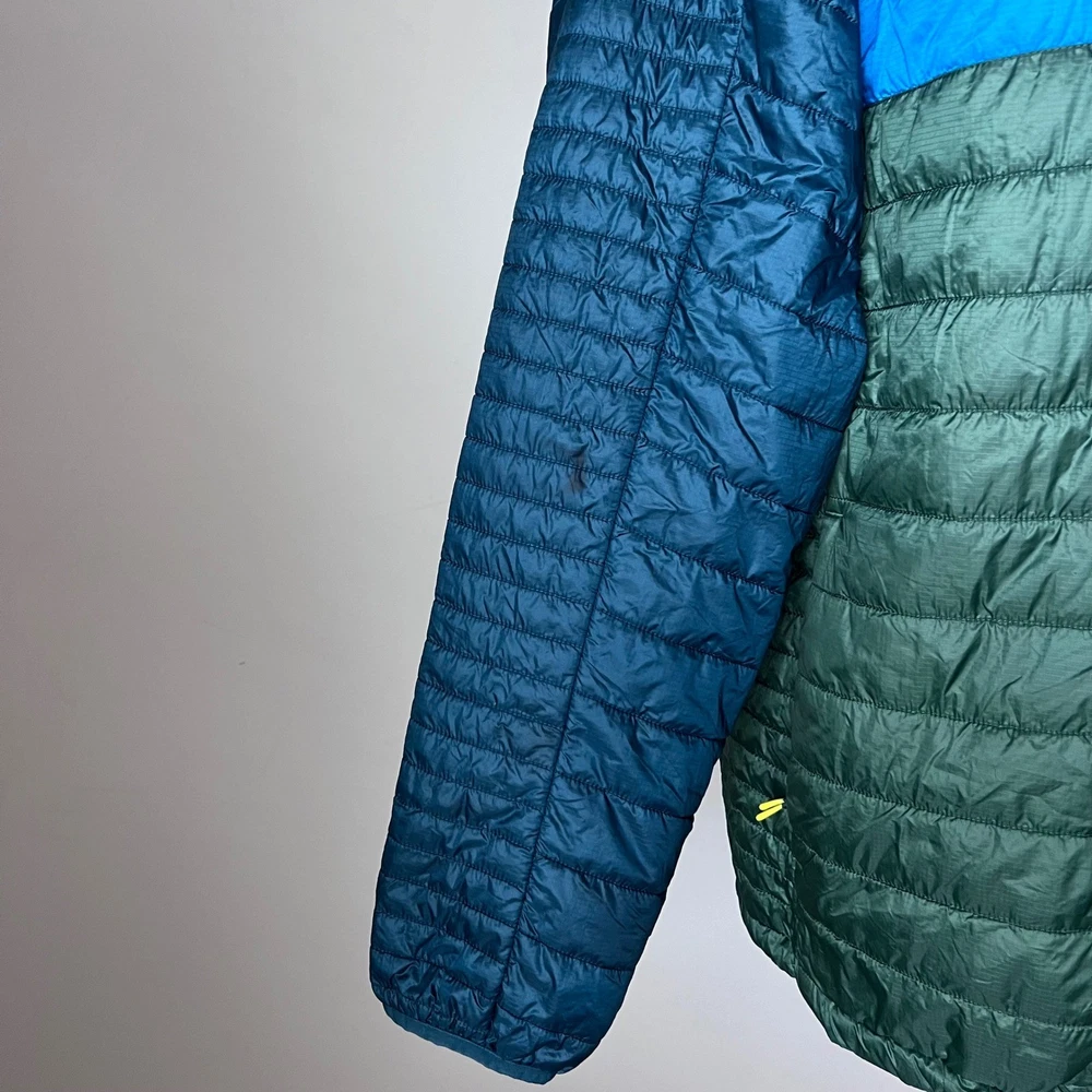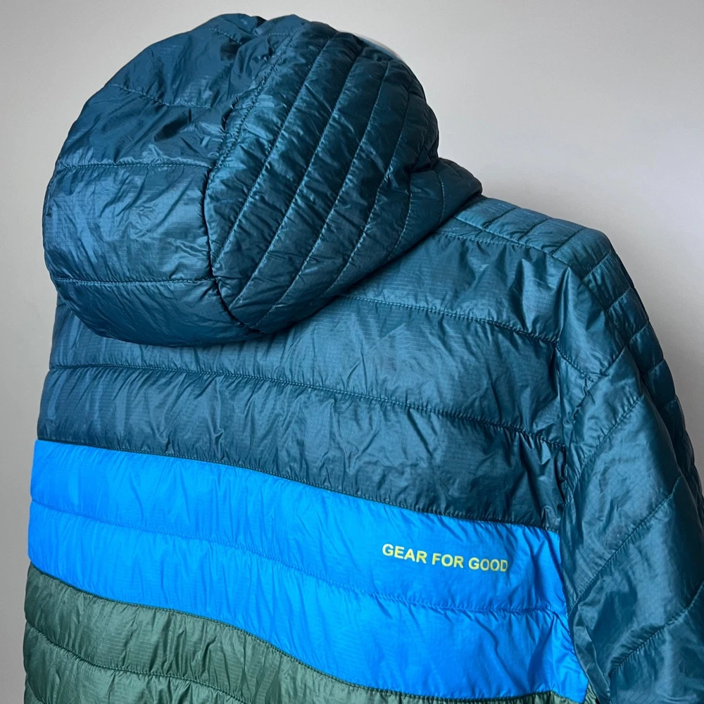 Cotopaxi Capa Hooded Jacket in a vibrant colorblock design of teal, blue, and green. This versatile insulated jacket is crafted from 100% recycled nylon with recycled polyester insulation, offering a sustainable choice for outdoor adventures. It features a full-zip front, a fixed hood, zippered pockets, and a lightweight, packable construction perfect for layering in variable weather. The signature llama logo is prominently displayed on the chest, and the shell has a subtle ripstop texture for added durability. Size XXL. Great pre-owned condition, light signs of wear on back of sleeves but barely noticable - see photos. Approximate Flat Lay Measurements: Pit to Pit across: 27" Length: 29" Keywords: Gorpcore, Sustainable, Eco-Friendly, Colorblock, Outdoor, Hiking, Camping, Layering, Lightweight, Packable, Recycled, Technical, Activewear, Mountaineering, Adventure Check out my store for other great finds. See my other listings!