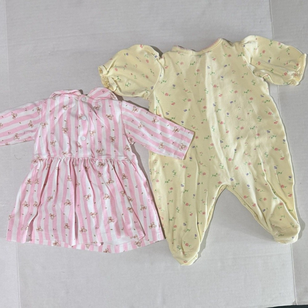 Brand: Adorable Cottage, Some Bunny Tag Size: 3m Color/ Pattern: pink, white, yellow, pastel Details: 2 pc lot includes snap onesie, long sleeve pink and white stripe dress with bear pattern and footie jumpsuit romper in yellow with puff sleeve, snap closure and floral motif. Condition: Excellent, used (see photos for any general wear) with no major flaws or damage Please message me with any questions! vintage, 2000s, floral, teddy bear, peter pan collar, candy stripes, Spring, embroidery, casual, easy-wear, baby, infant, kid's, children, toddler