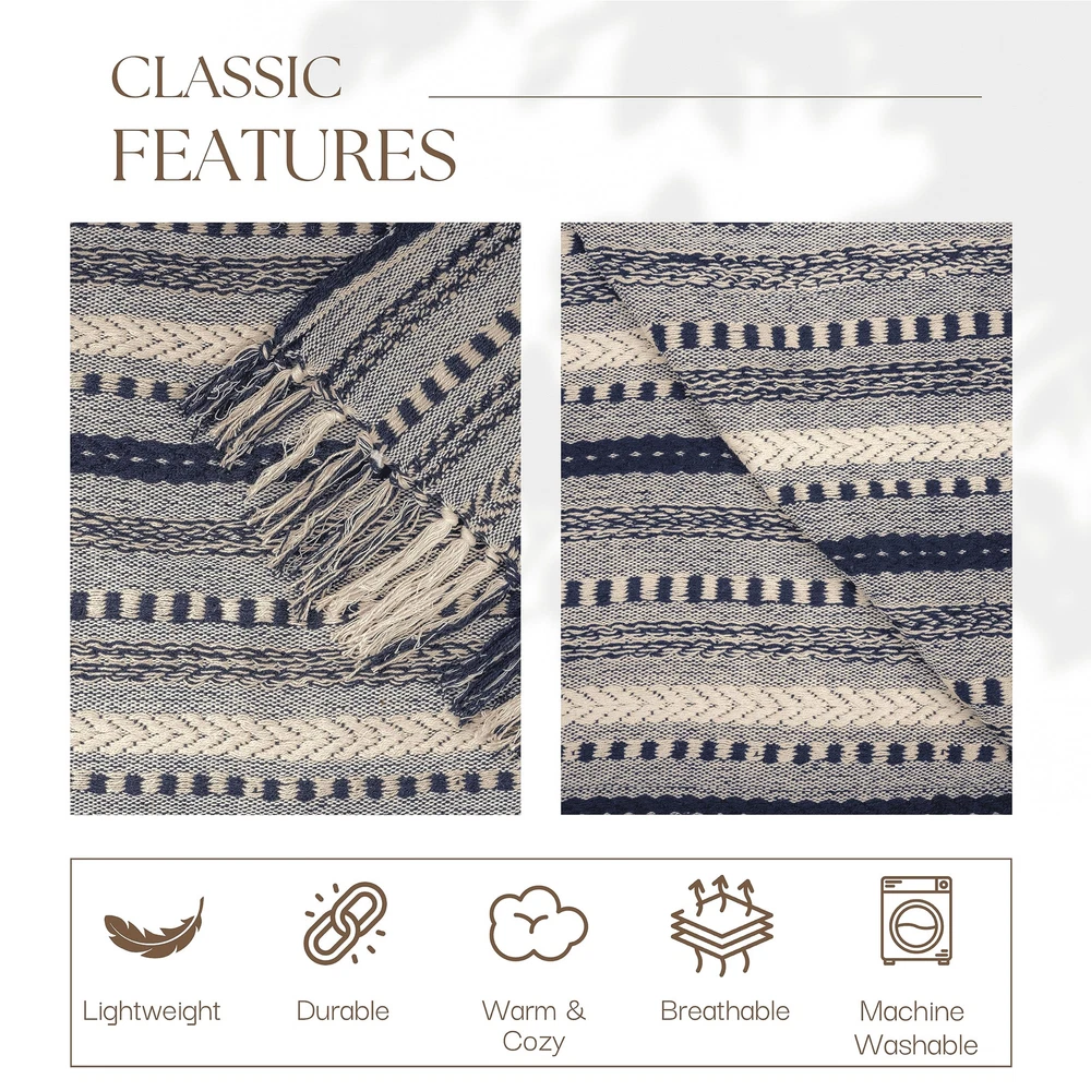 Design: This throw has a very chic and trendy look, throw over a couch or chair to add a splash of color and provide warmth on a cold night. Size and Material: Measuring at 50x60 inches, this throw blanket is perfectly sized for use on a couch, bed, or as an accent piece in any room. Made from 100% cotton, it is soft, breathable, and durable, ensuring long-lasting use. Craftsmanship: The throw blanket is crafted with attention to detail, ensuring its quality and longevity. The tassels are also carefully crafted to be long and sturdy. The combination of quality materials and skilled craftsmanship results in a throw blanket that is not only beautiful and functional but also built to last. Multipurpose: This throw blanket is not only ideal for adding warmth and style to your living space, but it is also multipurpose and can be used for a variety of activities. It can be used as a picnic blanket, camping blanket, or as a cozy addition to your car for long road trips. Easy Care and Maintenance: The throw blanket is machine washable separately, making it easy to care for and maintain its quality. It is recommended to tumble dry on low to ensure its longevity and to avoid ironing as it may damage the tassels.