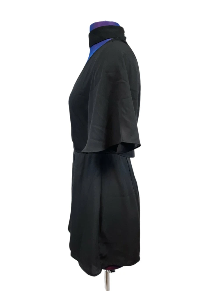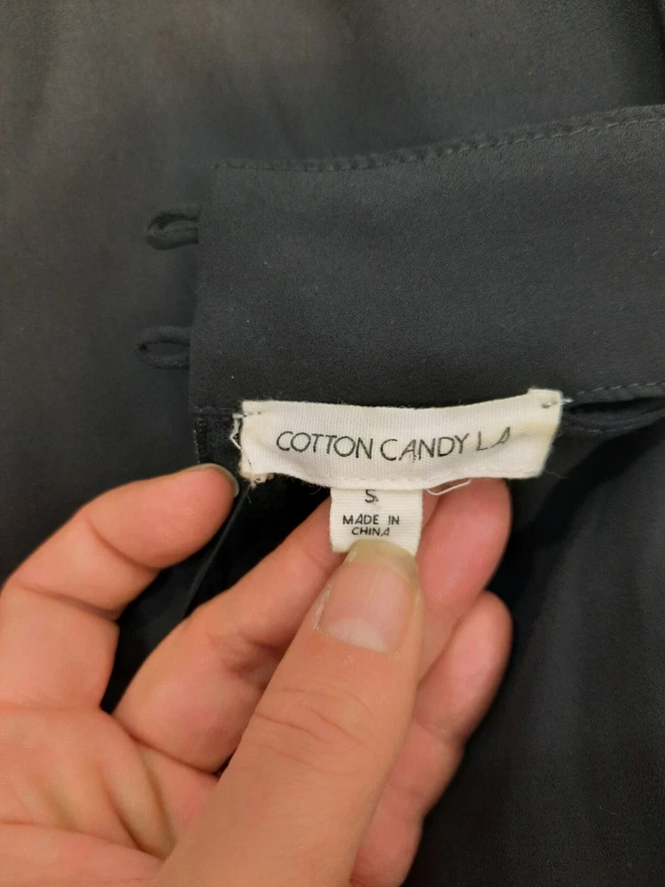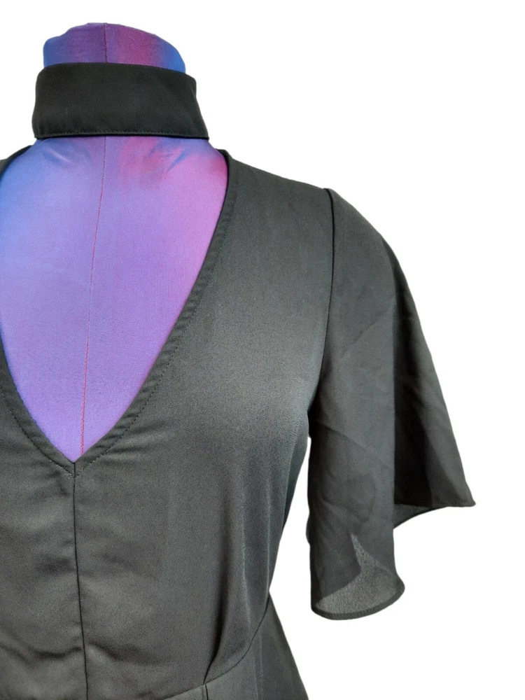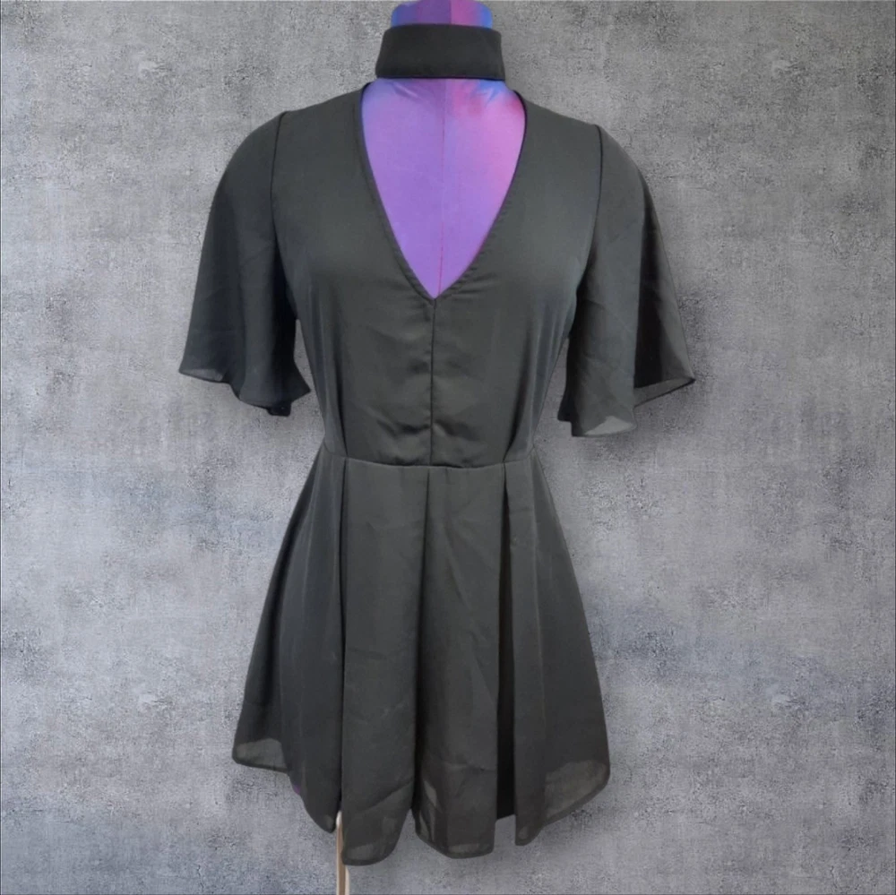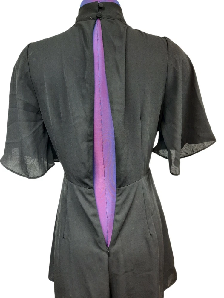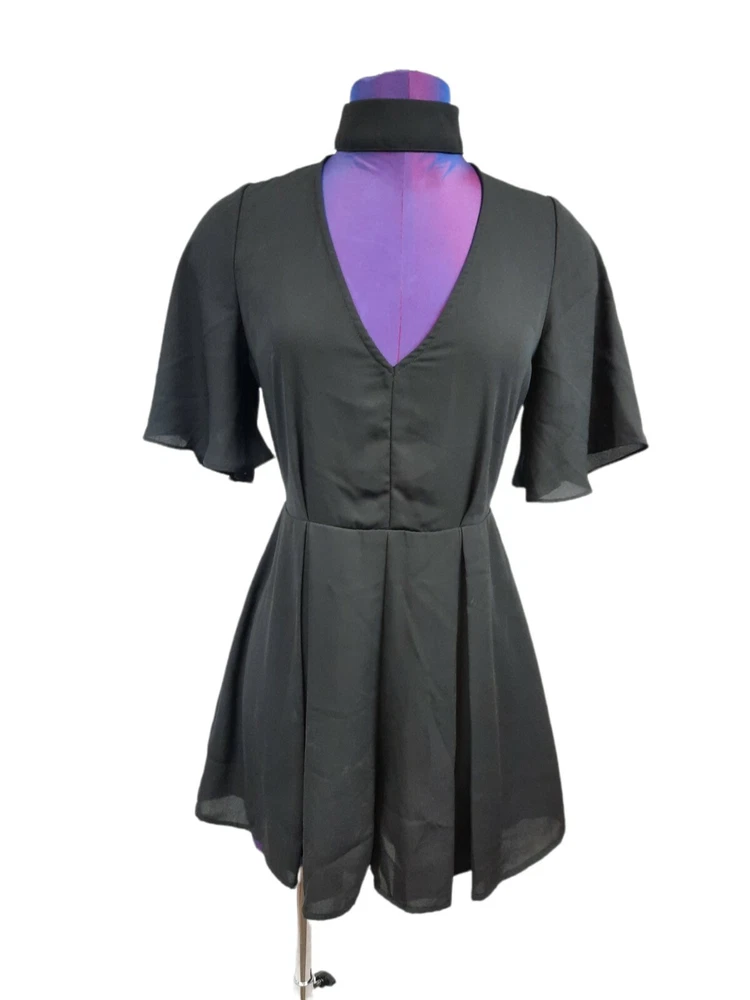Cotton Candy LA Black Butterfly Sleeve V Plunge Choker Romper Size S Women's. In excellent condition Cotton Candy LA Black Butterfly Sleeve V Plunge Choker Romper Size S Women's. Features hidden back zipper, choker collar with 2 button closure, sheer chiffon butterfly sleeves, deep V plunge neckline, chiffon layers, goth, gothic, whimsygoth Fabric Polyester Measurements laying flat chest 17" length 29" arm inseam 4" waist 13" This is a pre-owned item that may show signs of wear. In excellent condition, No flaws.