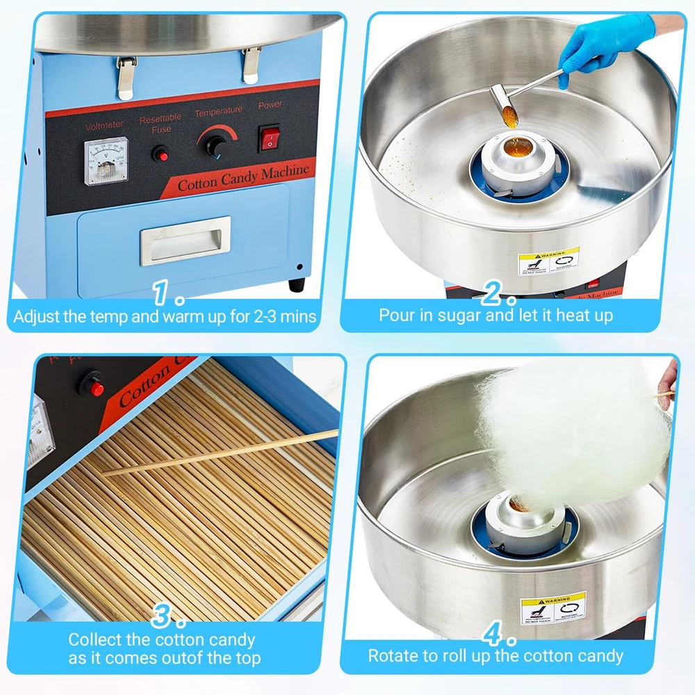 【High Efficiency for Quick Production】Experience impressive efficiency with our cotton candy machine, which boasts a powerful 980W heating and a 30W motor. This setup allows for quick heating, enabling the production of 2-3 servings of cotton candy per minute. 【User-Friendly Operation】Operating our cotton candy machine is a breeze, making it perfect for all ages. After that, pour your sugar into the rotary head and watch as cotton candy is spun to perfection. The temperature adjustment feature allows you to experiment with different flavors, ensuring you can create a variety of sweet treats to delight your guests. It’s an easy and fun process that everyone can enjoy. 【Versatile Applications for Any Occasion】This versatile cotton candy machine is perfect for a variety of applications, whether you're hosting a party, carnival, wedding reception, festival, or sports event. It accommodates a range of options for making delicious cotton candy, including flossing sugars, milk candy, sugar-free hard candy, and fruit pieces. 【The Perfect Gift for Any Occasion】Looking for a thoughtful gift? Our cotton candy maker is an ideal choice for friends or family, making it a delightful present for Christmas, birthdays, or any special occasion. With a 1-year warranty included, you can purchase with confidence. 【Multipurpose Functionality】This versatile cotton candy machine is designed for various uses, making it a great addition to any event. Perfect for birthday parties, carnivals, and festivals, you can create traditional cotton candy, milk candies, or even use fruit chunks and hard candies to make delicious marshmallows. Its compact design allows it to be placed directly on a tabletop, making it easy to use wherever you need sweet treats. The multipurpose functionality ensures you can cater to diff
