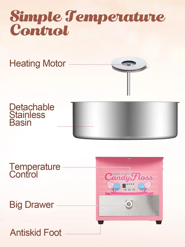 Cotton Candy Machine Commercial 【High Efficiency】Our commercial cotton candy machine features a digital display screen.1200W, 120V, Aluminum sugar outlet for heating evenly. Producing up to 2-3 servings per minute. 【Super Space】Large 20.5" food grade stainless steel bowl and Sugar Scoop. Unit disassembles for simple cleaning. 【Temperature Adjustable】Adjust the Temperature Control Button as needed, wait for it to warm up (about 5 mins), pour in the sugar and within minutes delicious cotton candies are done.Suitable for different kinds of candies. 【Clever Design】The locking clips help hold down the bowl to minimize the vibration, making the operation quiet and smooth. 【Wide Application】Suitable for professional sellers and novices. And it is perfect for the family party ,carnivals, sporting events and street stalls.