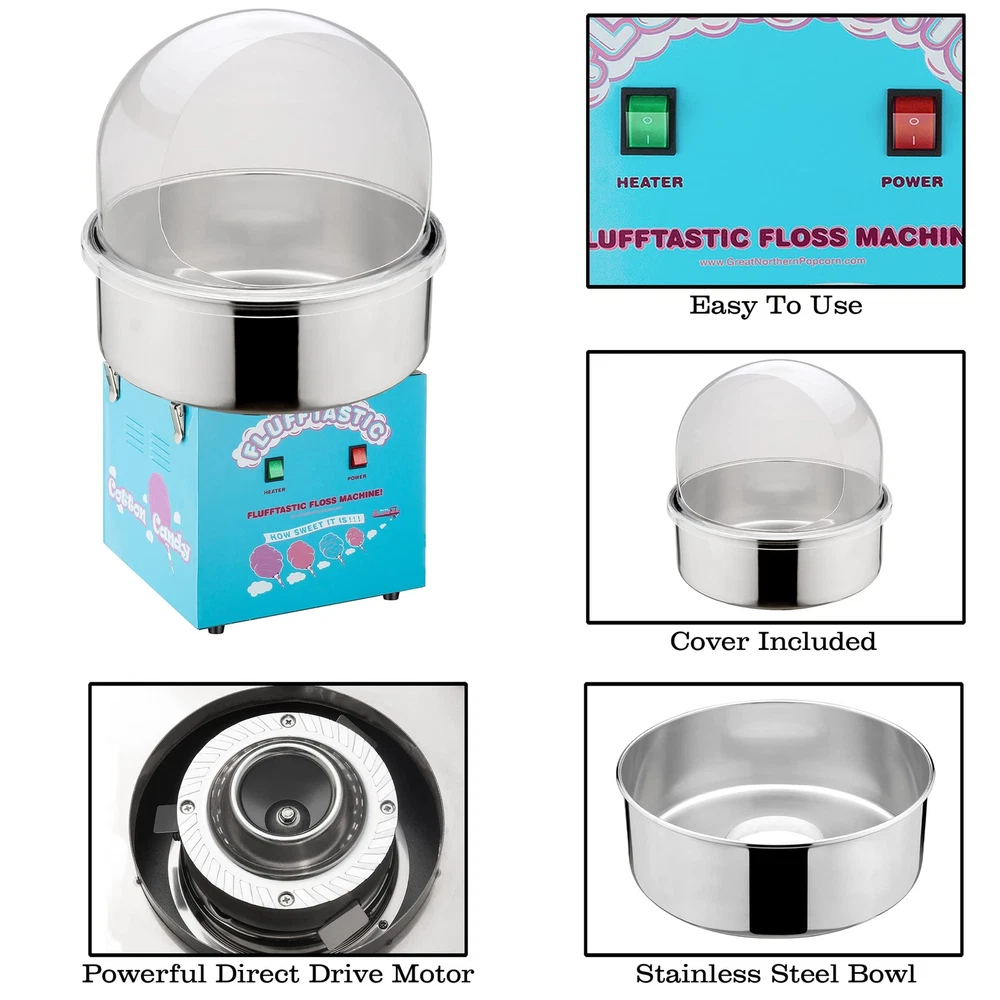 The Flufftastic Candy Cotton Machine with Dome by is sure to be the hit of your next party, school function, or event. This carnival-style cotton candy maker features a direct drive motor, a 1000-Watt heating element that produces a sugar floss cone every 30-seconds, and a 20.5-inch stainless-steel bowl. This handy kit also includes a cotton candy dome that provides one-hand access to the floss area while protecting the cooking chamber from dust, insects, and airborne particles. This cotton candy maker machine is easy to use and will produce fluffy clouds of deliciousness using floss or hard candy for the perfect party favor, making any event special. COTTON CANDY MAKER – Produce fluffy clouds of deliciousness using sugar floss or hard candy for the perfect party favor for birthdays, school events, or church socials. This machine allows you to bring a festive carnival mood into your own home. POWERFUL MOTOR – This whisper-quiet cotton candy machine features a powerful direct drive motor, a 1000W heating element that produces a full cone of cotton candy floss every 30-seconds, and a 20.5-inch stainless-steel bowl. COVER INCLUDED – This machine comes with a clear plastic cotton candy dome cover that shields the cooking chamber from debris and prevents flying sugar crystals while allowing one-hand access to the floss area for easy serving. EASY TO USE – When you are ready to make cotton candy, simply turn the power button on followed by the heater button and let it warm up for 4 minutes. Use the included scoop to pour sugar in the cap and you will have a candy floss cone in 30-seconds. PRODUCT DETAILS – Material: Metal and Stainless-Steel. Dimensions: (L) 20.5” x (W) 20.5” x (H) 20.25”. Bubble – (L) 21" x (W) 21”x (H) 14.25”. Power: 1000W, AC 110V. Cotton Candy Machine with Dome. May be shipped in separate packages. Color: Light Blue.