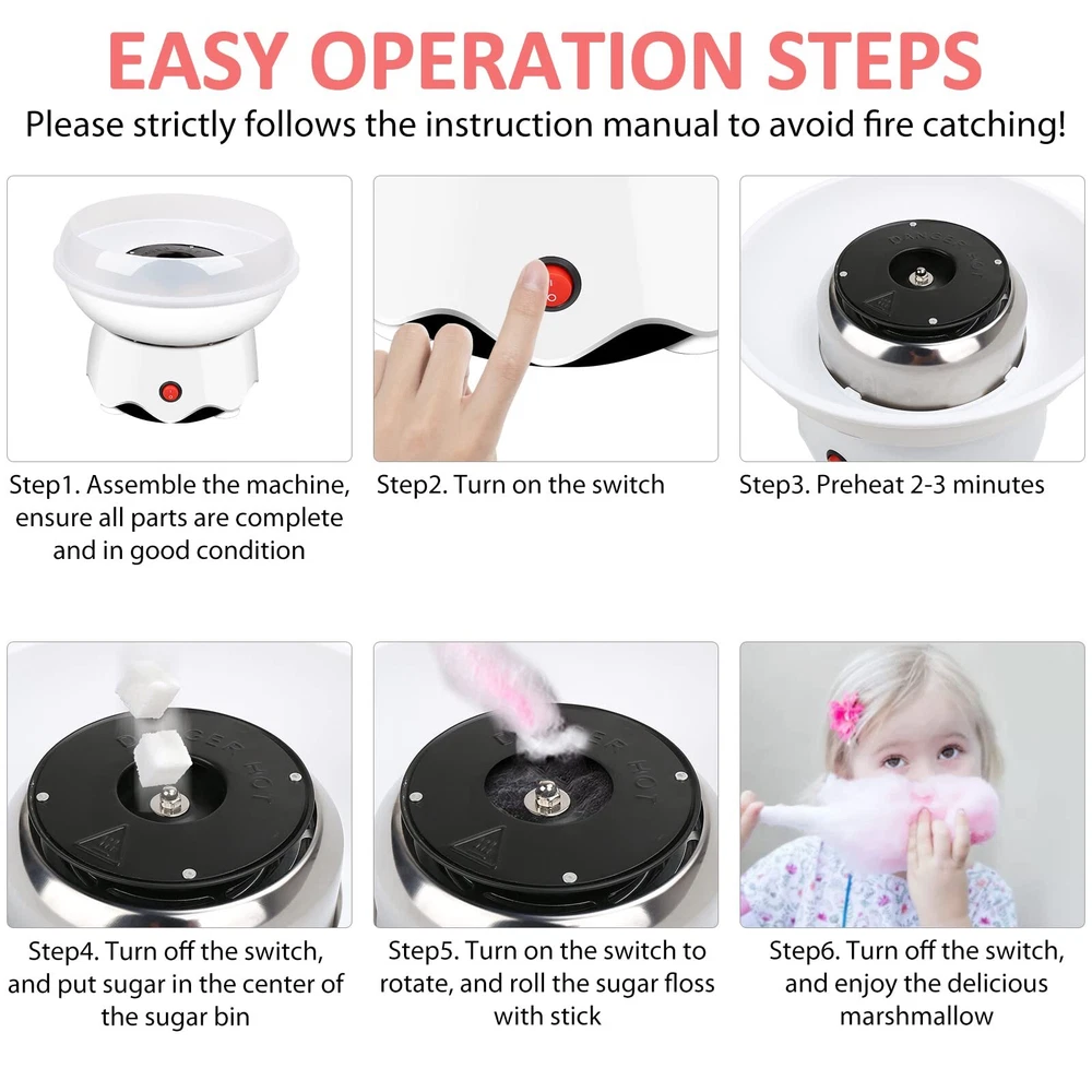 Portable Cotton Sugar Machine DIY Sweet Cotton Candy Maker! Girl Boy Gift Children Day Toy Gift With Sticks Spoon. EASY OPERATION STEPS Step1 Turn on the switch (Preheat 2-3 minutes). Step2 Turn off the machine and add suitable sugar into the boiler. Step3 Turn on the machine and wait it comes out sugar floss (then roll it up with stick). Steps4 Enjoy the moment to roil a cotton candy. SPECIFICATIONS Size: 7.8”x7.8”x10” Material: PP+Aluminum+Stainless Steel Power - 400W Voltage - 110V Frequency - 60Hz ATTENTION 1. Due to the difference between different monitors, the picture may not reflect the actual color of the item. We the style is the same as shown in the pictures. 2. Please allow slight dimension difference due to different manual measurement. ATTENTION Please read carefully the Precautions and Warning in the Instruction Manual to Avoid Causing Fire! 1.Don't put sugar directly into the stainless steel net, you must put the sugar bin first and then the sugar to avoid fire. 2.Do not place the machine in or near gas stoves, stoves, hot stoves, etc. 3.The sugar bin and splash plate must be installed correctly before use to insert the plug into the socket. 4.Pour half a spoon of clean granular sugar in the center of the sugar bin, and the sugar must be poured into the sugar bin when the sugar bin completely stops rotating. Do not use or mix other materials.Do not use too much sugar to avoid fire. The cotton candy machine is composed of safe harmless food materials, durable & long lasting. With anti-skid design on its bottom, more stable & less noise once working. The cotton candy maker inside part adopts ceramic head heating tube,has good thermal conductivity, works more efficiently. Use it under 110V, 400W. Keep away from the machine, or use it under your protection. Easy to use the machine, but must the instruction manuals to avoid any fire catching. You can create delicious fluffs of cotton candy by proper sugar. Super convenient to clean the machine by damp cloth or warm soapy water. A great home accessory for your families. The homemade cotton candy maker is a great choice for birthday party, any festivals! Great tools to enhance -parents relationship, bring much more happiness.