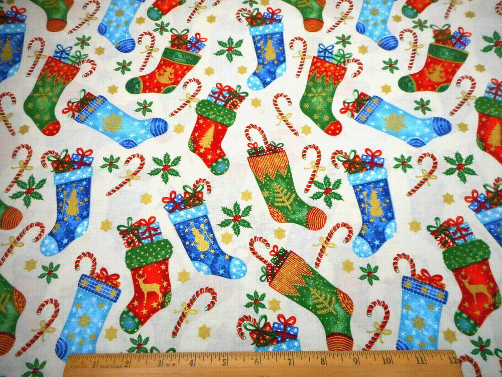 Width: Up to 45'' Suitable For: Accessories - Bags/Purses, Accessories - Hats, Apparel - Coat/Jacket, Apparel - Dance/Sportswear, Apparel - Dress, Apparel - Everyday Clothing, Apparel - Loungewear, Crafts, Quilting Color: Ivory Red Green Blue Metallic Gold Brand: Choice Fabrics Pattern: Christmas Stockings Snow Holly Candy Material: 100% Cotton Fiber Content: Cotton Length/Amount: 1 - 2 yds Theme: Holiday/Christmas