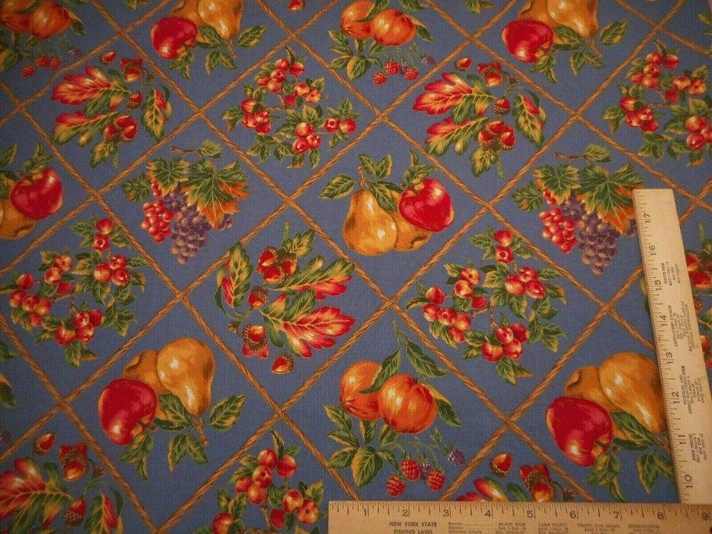 This is a very nice fabric that is 100% cotton. This fabric is 57" wide & is out of print. It has purple & red grapes, gold pears, red apples, & acorns, etc. with green & gold leaves all outlined with metallic gold on a dark dusty blue background that has twisted brown looking "rope or twine" separating them. READ: Because computer monitors show colors & shades differently, the fabric colors can vary from the photos. If you have any questions regarding this, please contact me before purchasing the item. I have been a quilter for 30 years & am an accomplished seamstress & would be happy to answer any questions you might have. This is for 1 Yard of fabric. If you purchase more than 1 Yard, I will give you one continuous cut. If you have a problem with anything you purchase from me, please contact me before leaving neutral or negative feedback and I will work it out with you. Payment is due within 48 hours. If payment isn't received within 5 days, it will automatically go to Ebay's resolution center for non-payment. INSTRUCTIONS FOR COMBINED SHIPPING: I Do combine shipping. You must put your items into your shopping cart and request an invoice from me using the request total button before completing the payment process. IF YOU'RE UNABLE TO COMBINE YOUR SHIPPING, PLEASE CONTACT ME. Payment is due upon receipt of your invoice. Thank you for looking and God bless you and your family. IF THERE IS A PROBLEM WITH ANY PURCHASE, PLEASE CONTACT ME, THE SELLER, VIA EBAY'S MESSAGING SYSTEM PRIOR TO OPENING A CASE--OPENING A CASE, EVEN IF RESOLVED SMOOTHLY, CAN HURT THE SELLER'S RATINGS. THANK YOU