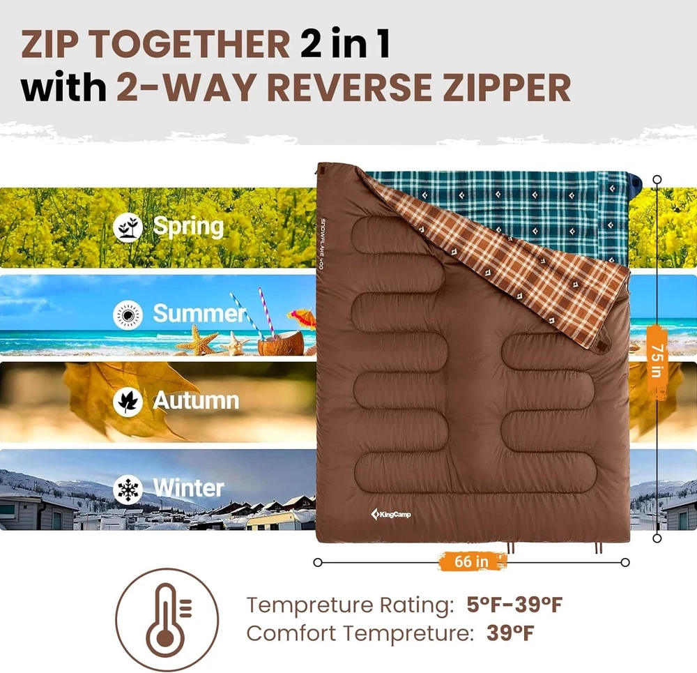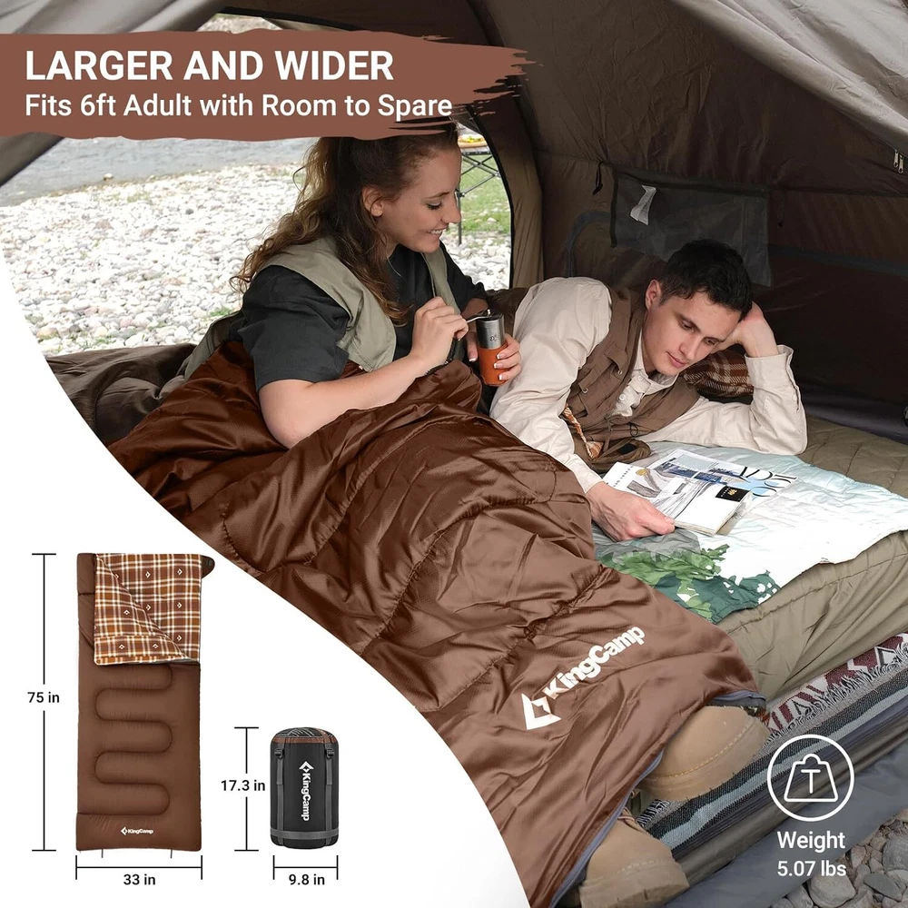 89% Cotton, 11% Polyester Imported 【Cotton Flannel Sleeping Bags】With 210D polyester outer shell, this flannel sleeping bag adopts great durability and water repellency. And it is filled with 400g/㎡ cotton hollow fiber, thermal insulated, and damp proof. Flannel liner gives you a cloud-like skin feeling. Release your fatigue after a tiring day. 【Big and Tall Cold Weather Sleeping Bag】75 L X 33 W. Larger than regular camping sleeping bags. Fits 6 ft tall adults with room to spare. Cozy in any position. Can be used for warm and cold weather in 4 seasons. 【Versatile Zip Together for Double Sleeping Bag】2-way zippers that right or left-hand zippers allow for 2 flannel sleeping bags for camping to be attached together. Unzip the bottom to cool your feet. Besides a sleeping bag, you can "Wear" while chilling, also as a blanket or a picnic pad. for family trips, and car camping. 【Customer-Focused Design for Quality Sleeping Bag】Half-circle hood with an adjustable wind-proof drawstring keeps your head warmer even in extreme conditions. The on the collar prevents the zipper from suddenly opening. 【Easy to Carry】This packable sleeping bag package size is 17 x 9 in, weight 5.07 lbs. The sleeping bag comes with a compression sack, allowing for convenient storage and easy carry, roll control design makes the sleeping bag for adults cold weather folding quickly and easily. The portable sleeping bag is perfect for hiking, backpacking, car camping, and more. On Dec 29, 2024 at 17:46:26 PST, seller added the following information: