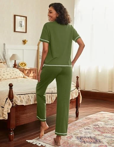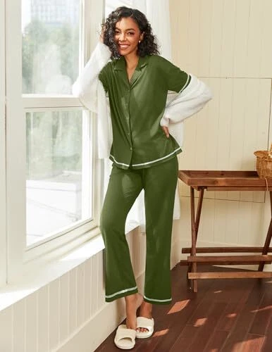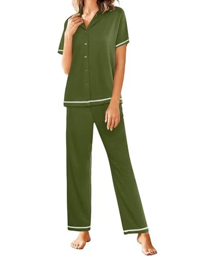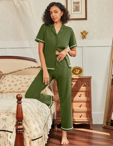 Cotton Pamajas Sets for Women 2 Piece Button Down Short X-Large Army Green